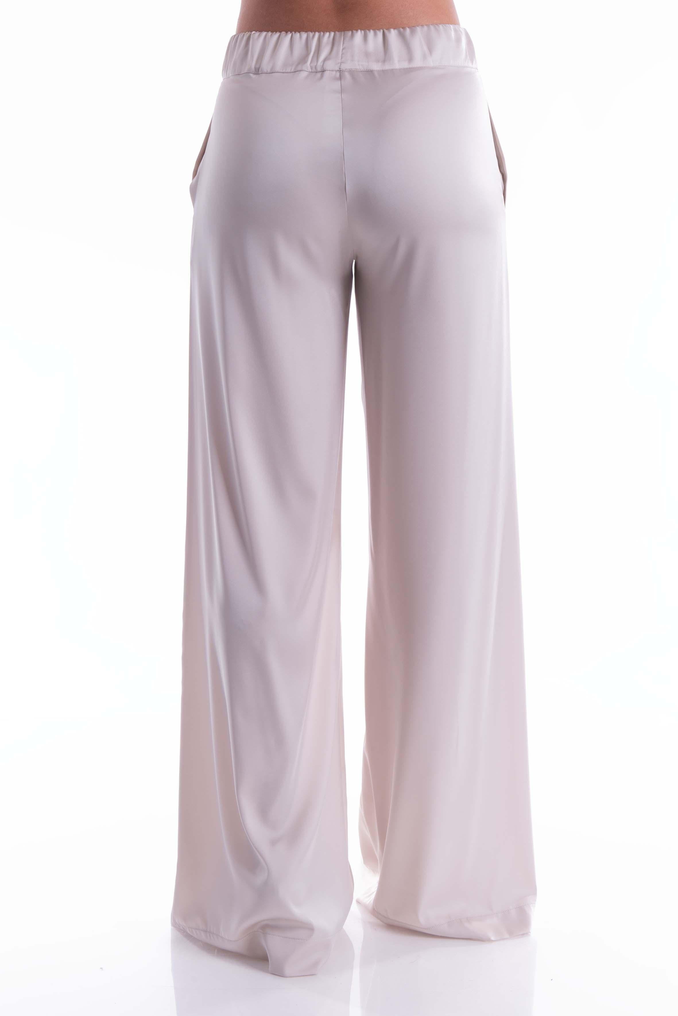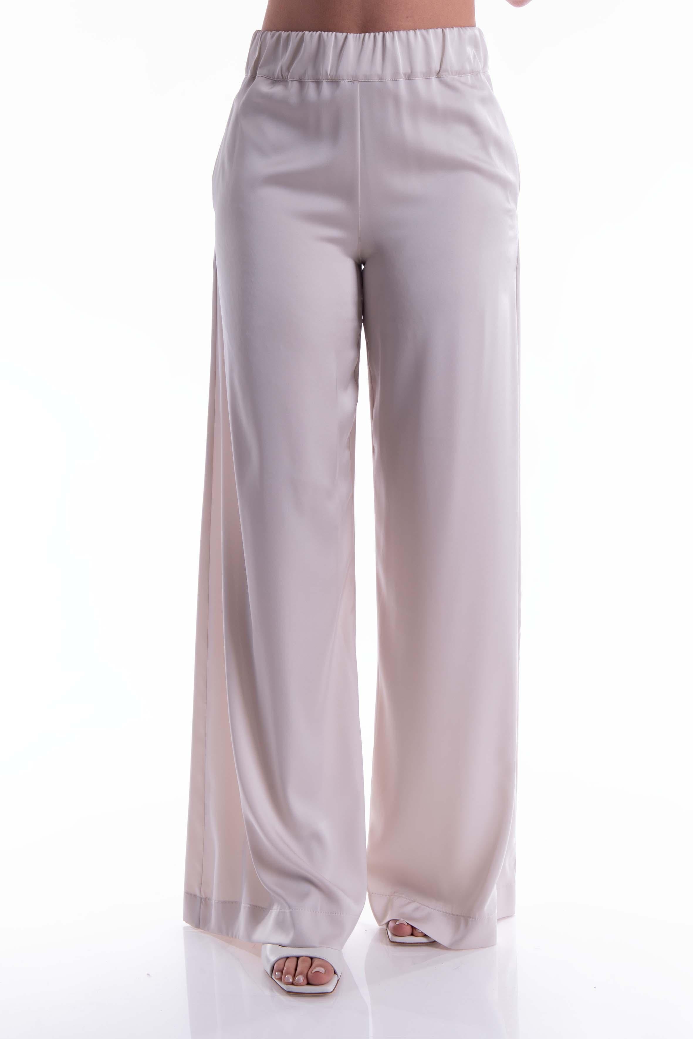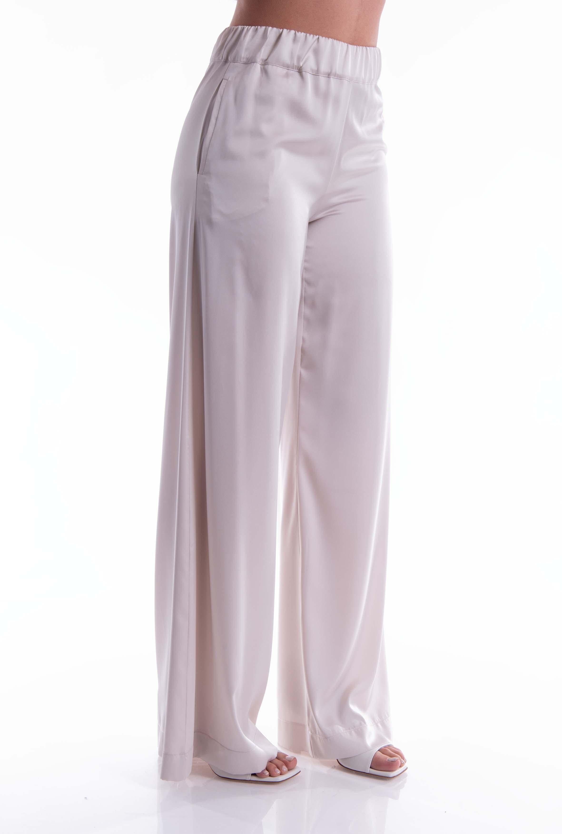 Fluid pants from D.Exterior in ice color, medium waist, elastic waistband, flush pockets.