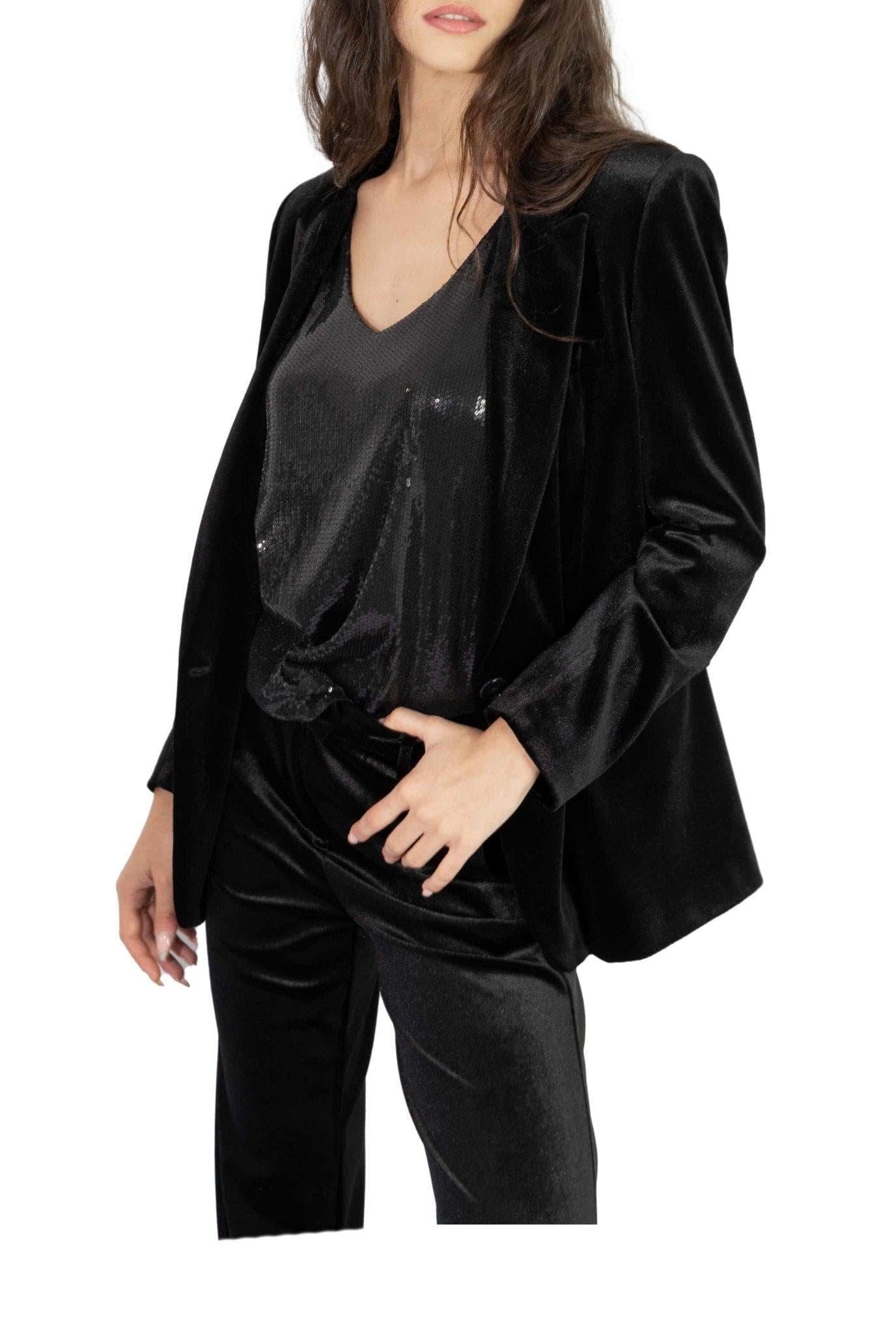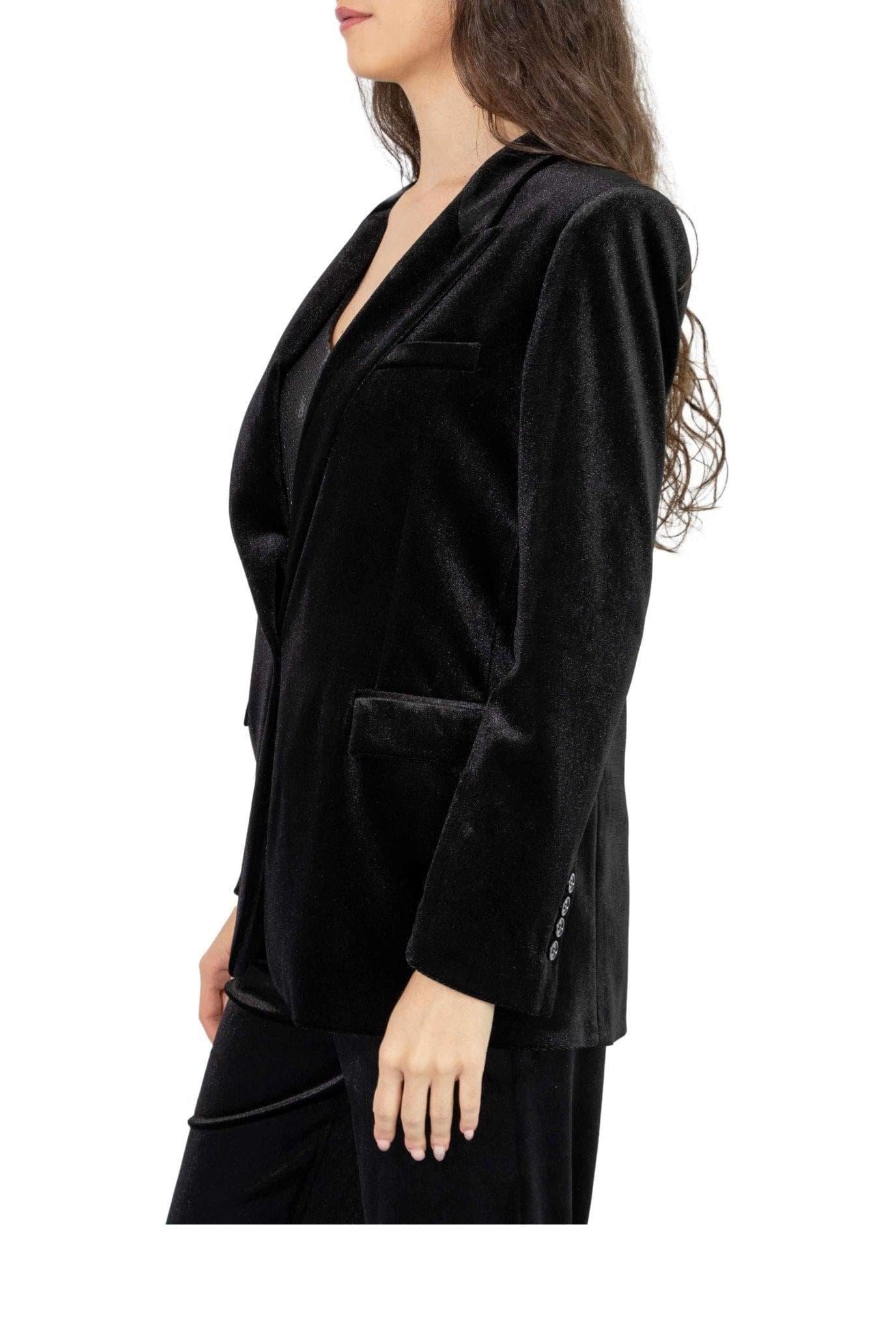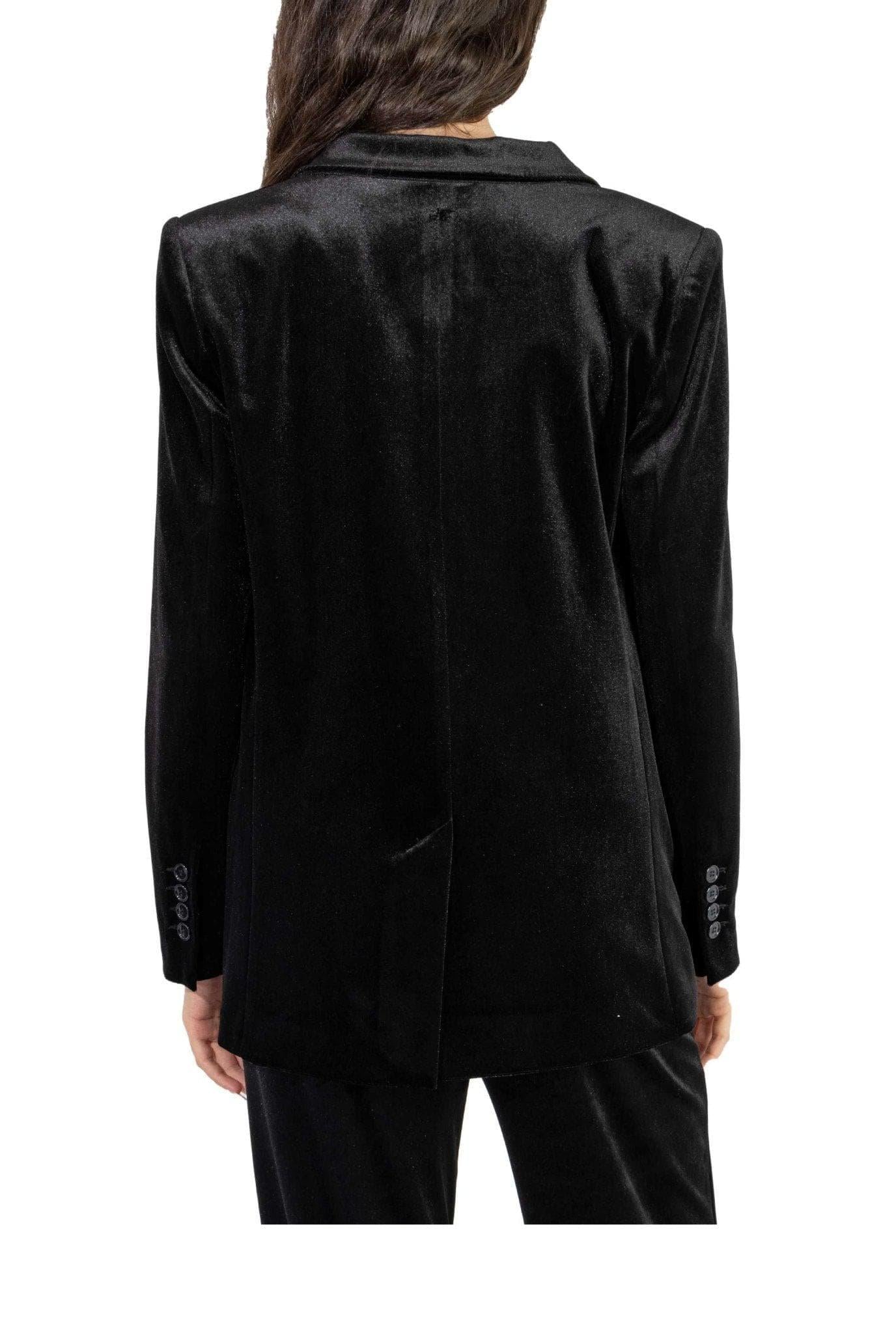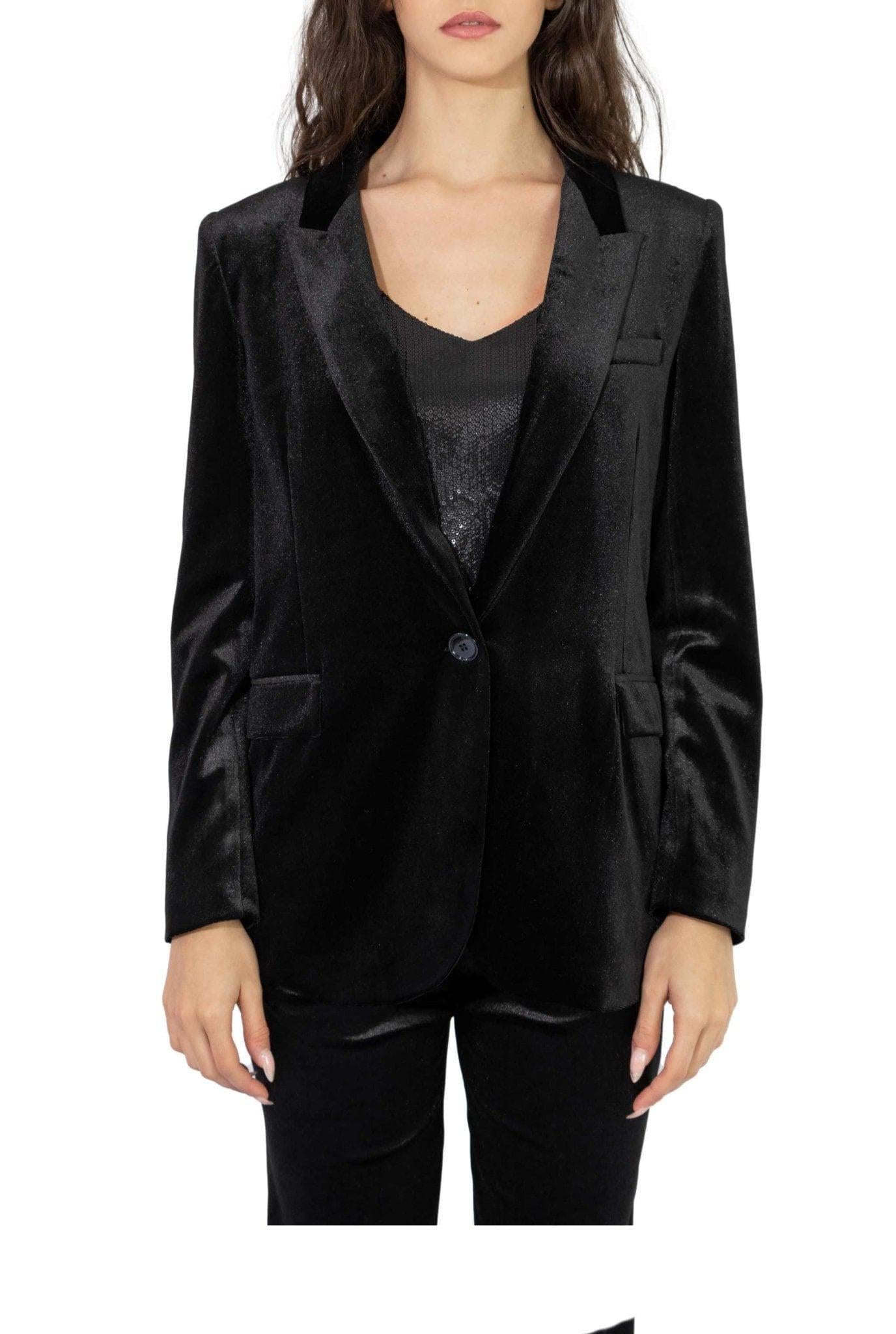 Single-breasted design, peaked lapels, one-button front closure, welt pockets, back vent, button cuffs.