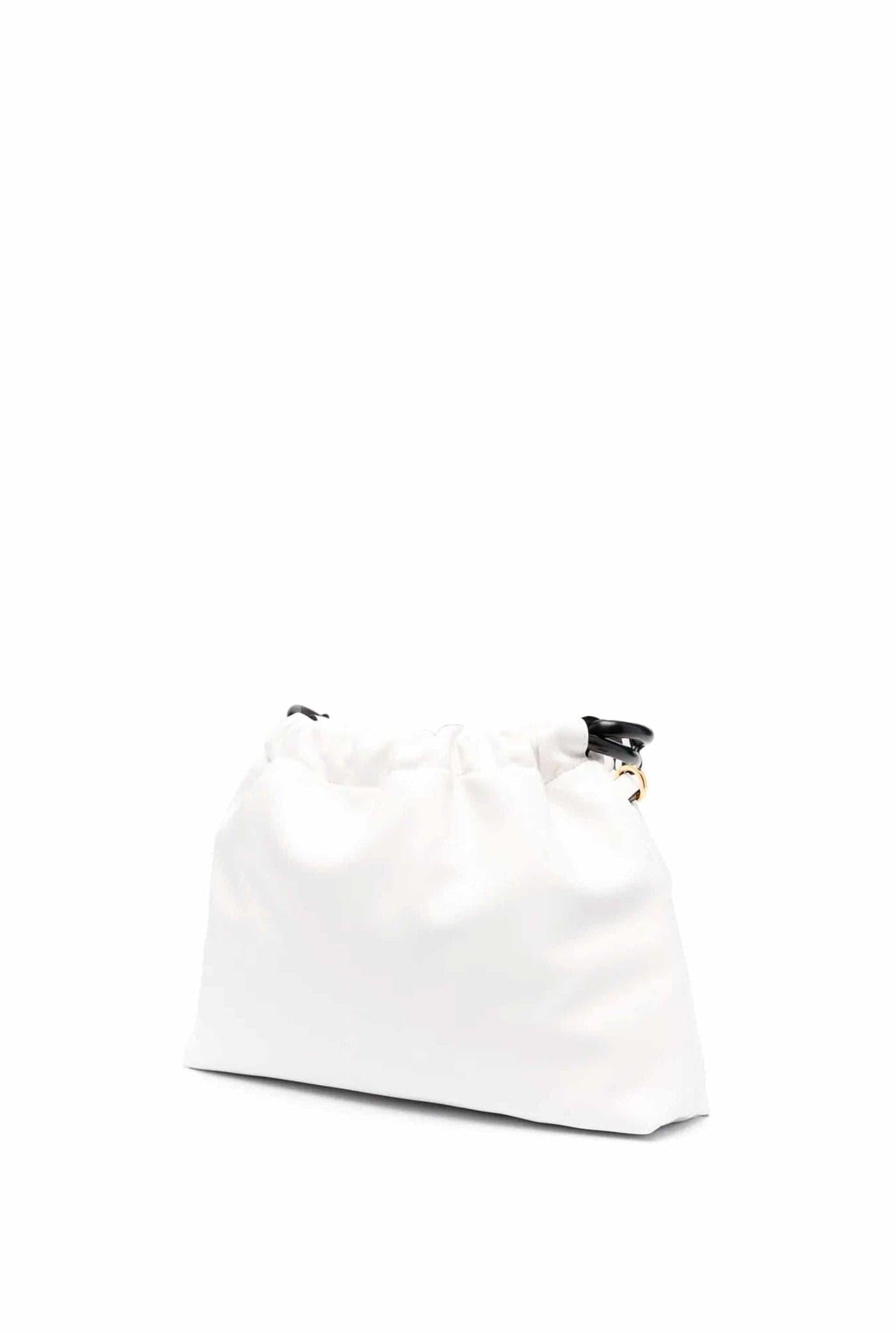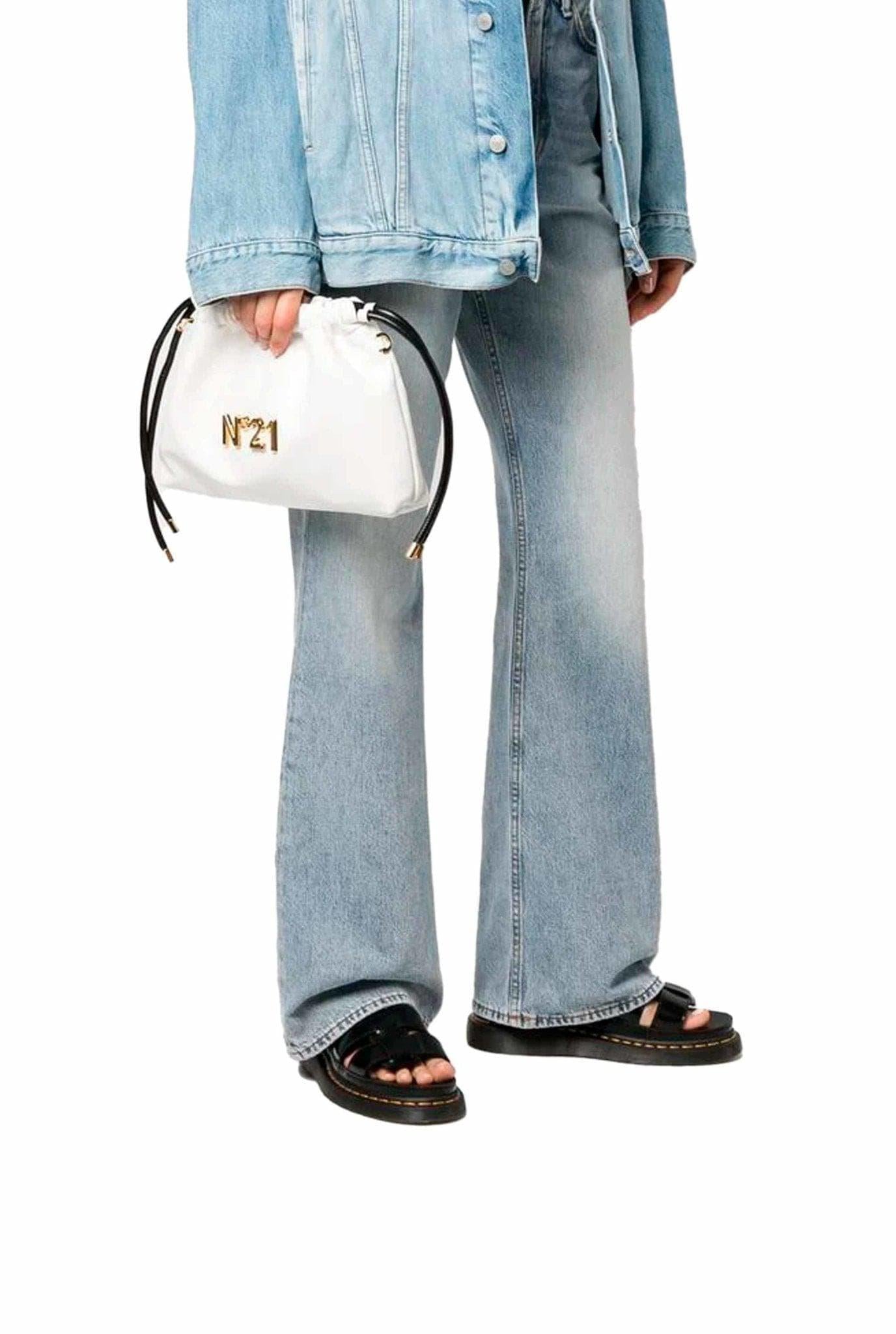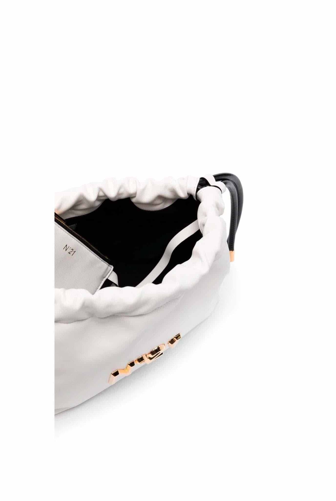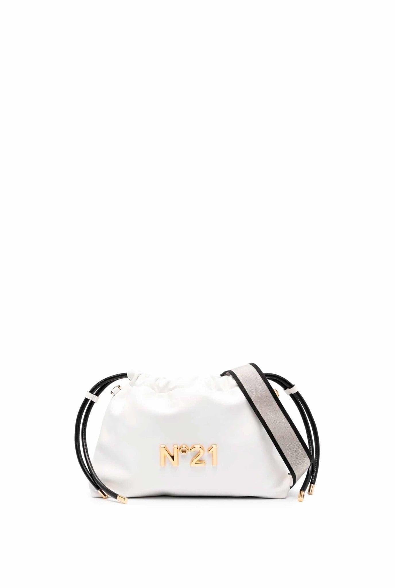 Eva leather pouch bag in white with gold logo on front of N° 21