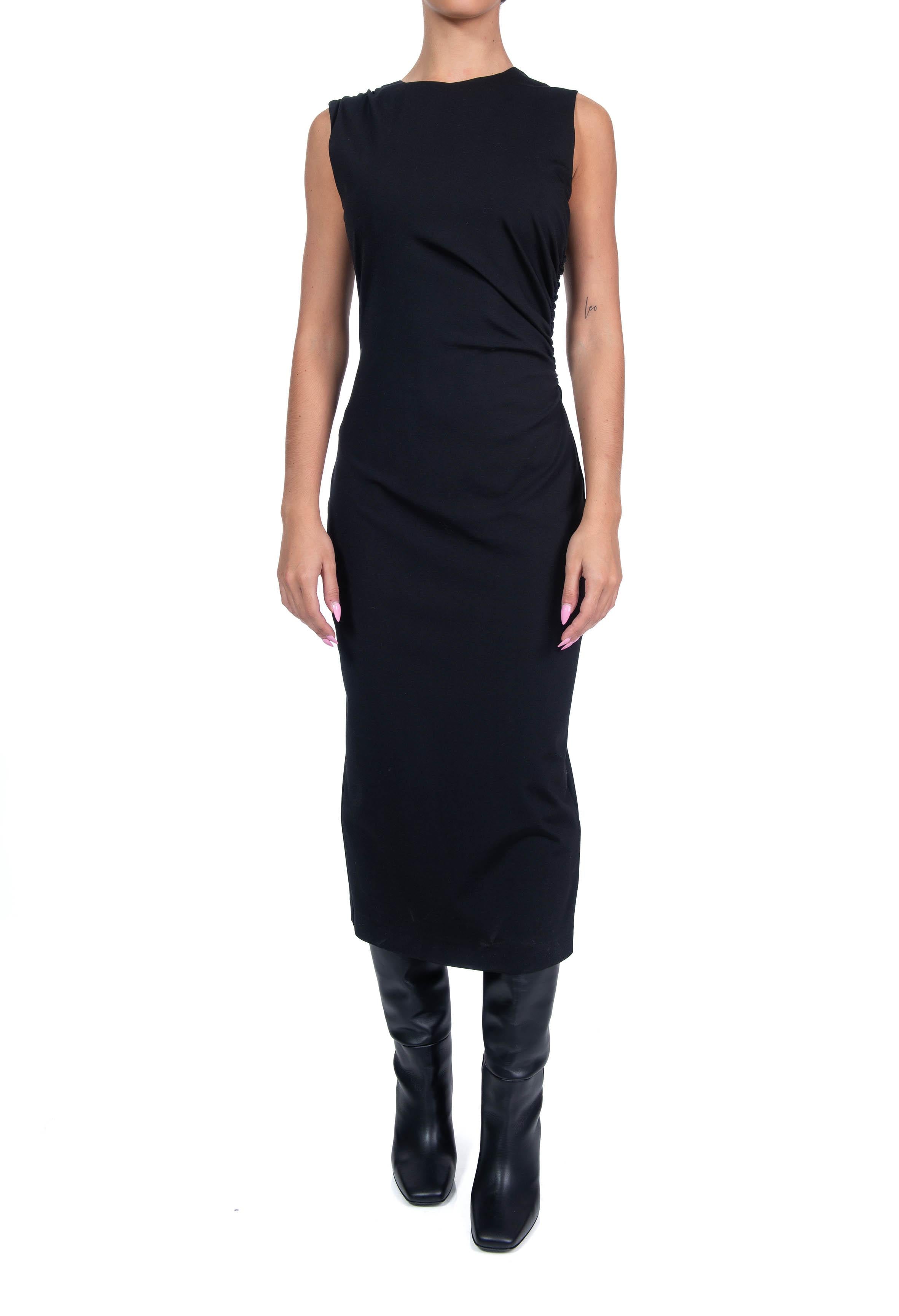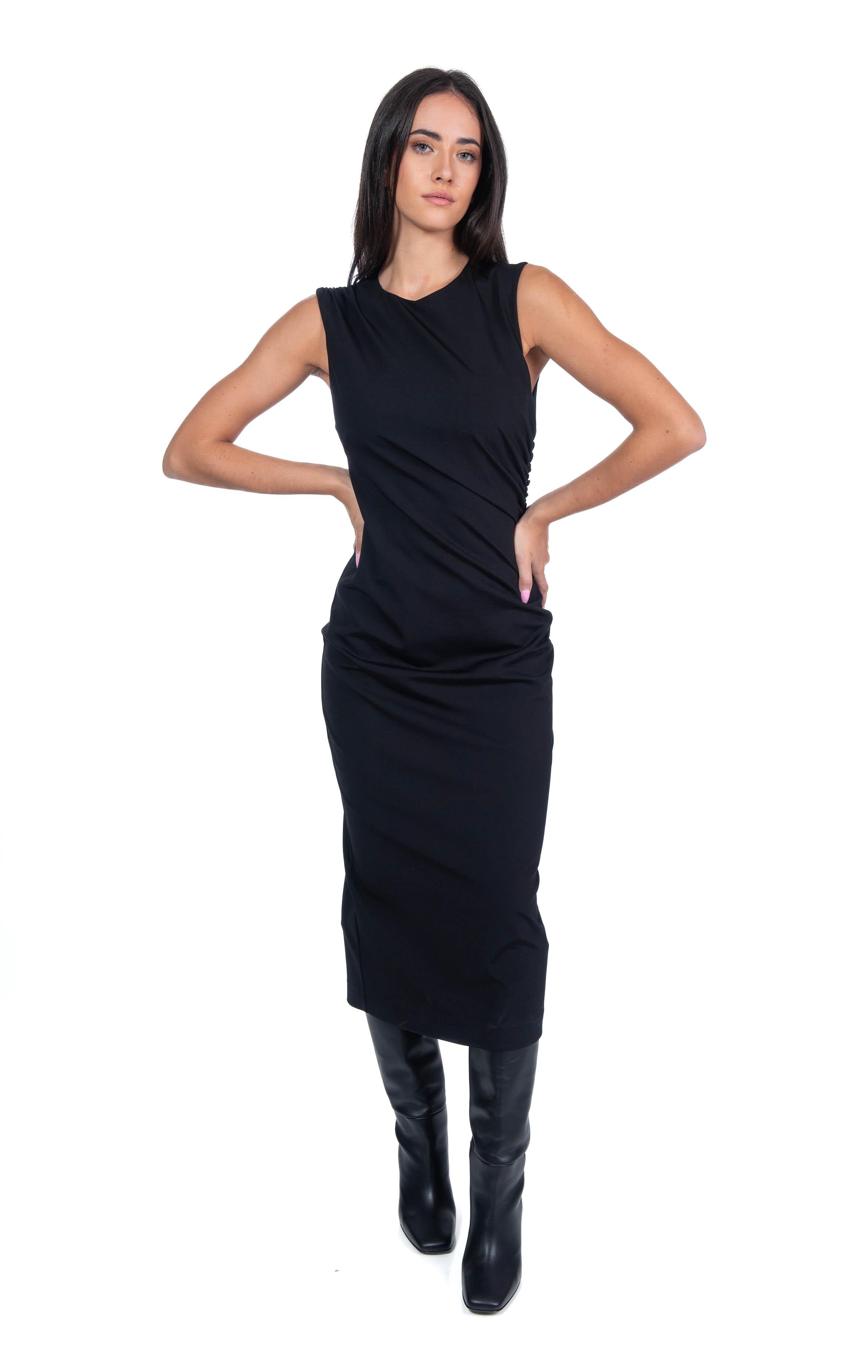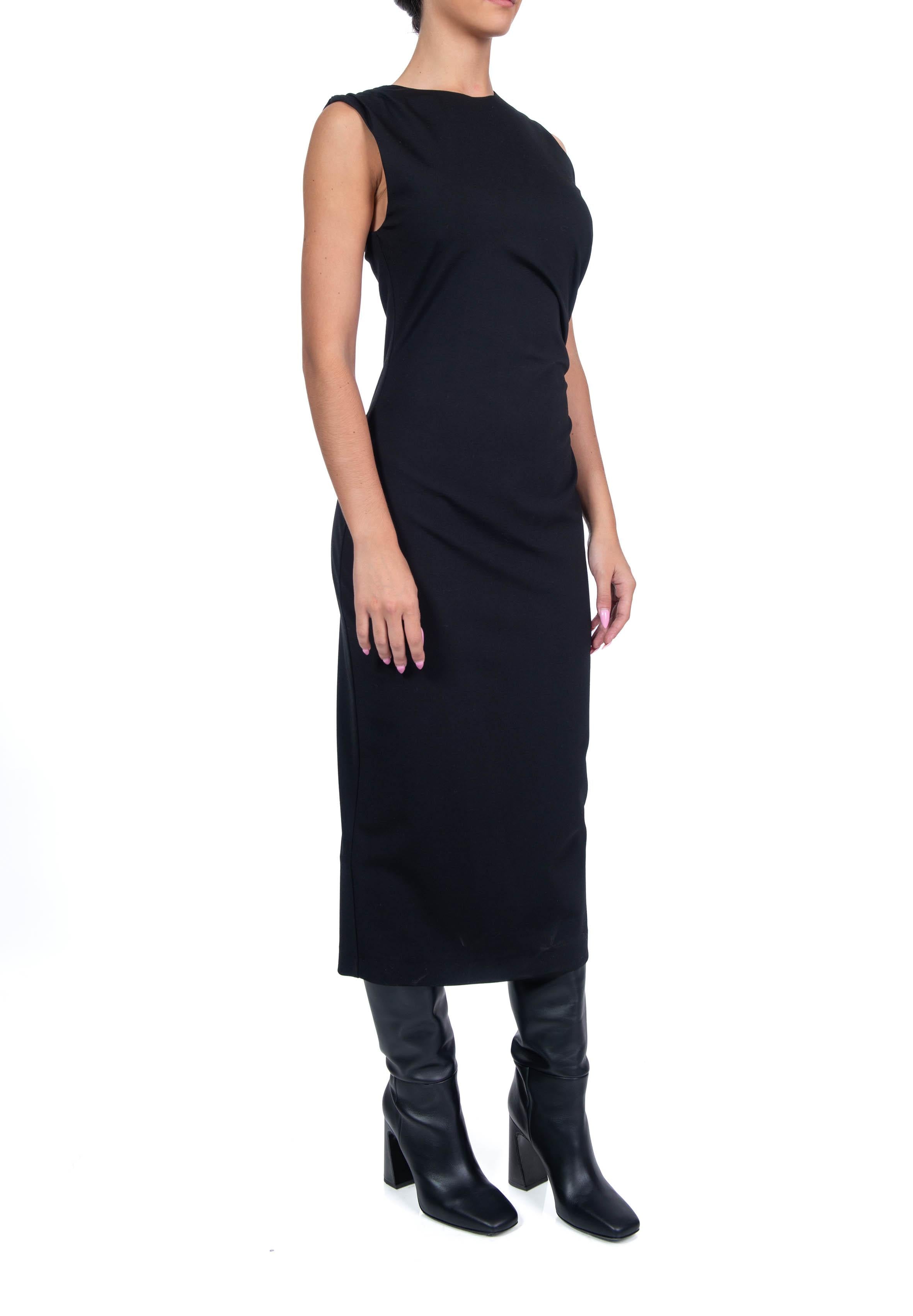 Black-colored long dress from Alice Miller, round neck, sleeveless with side drape, slit and back zipper closure.