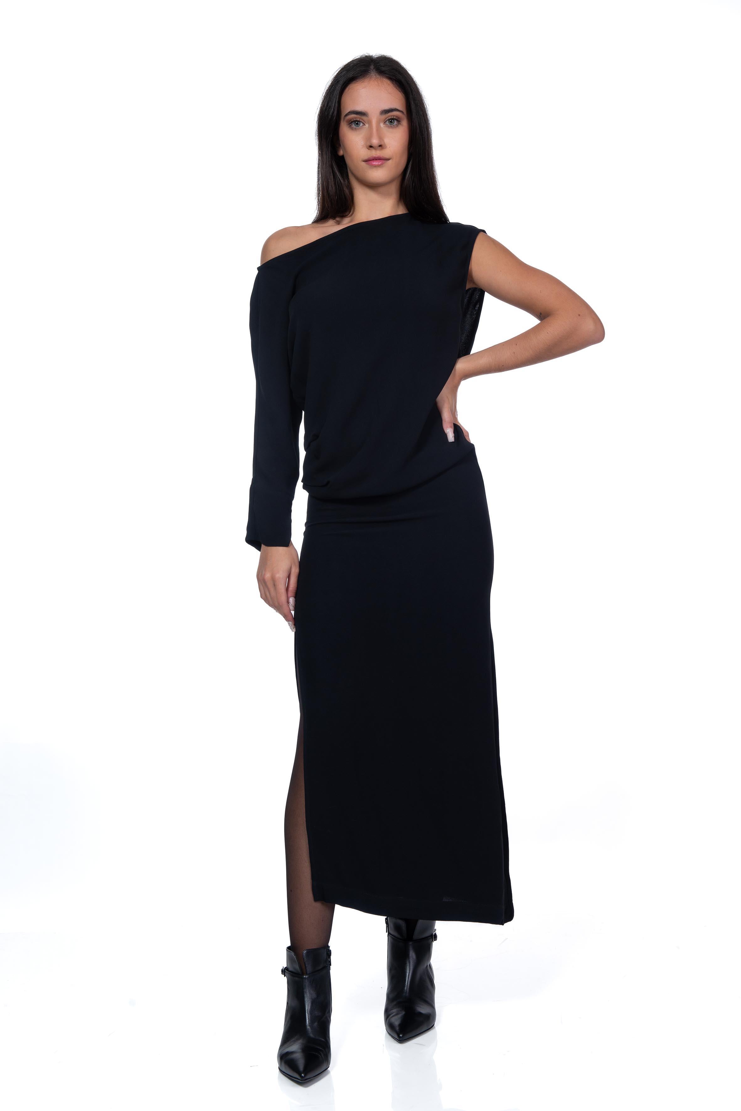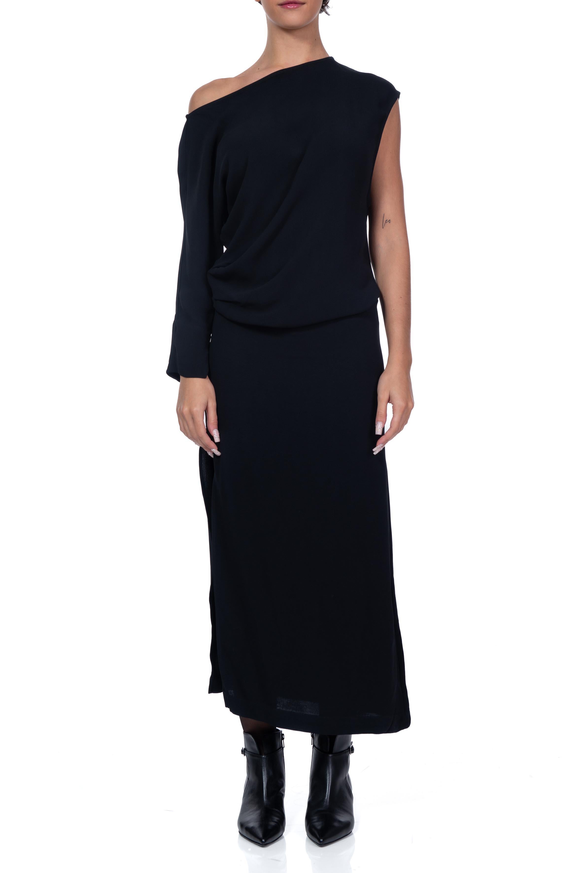 Black viscose midi dress from Herskind, long, draped, one long sleeve with exposed shoulder, one sleeveless sleeve, regular fit, high side slit.