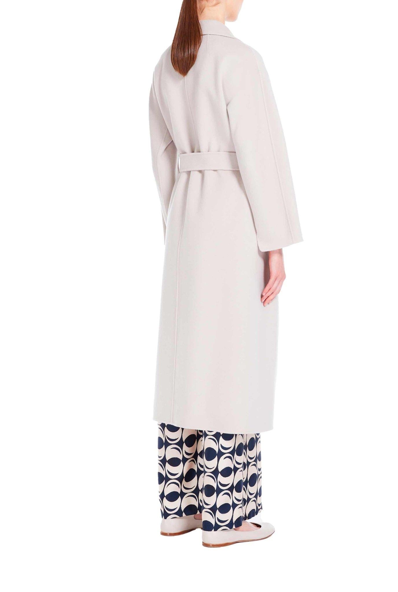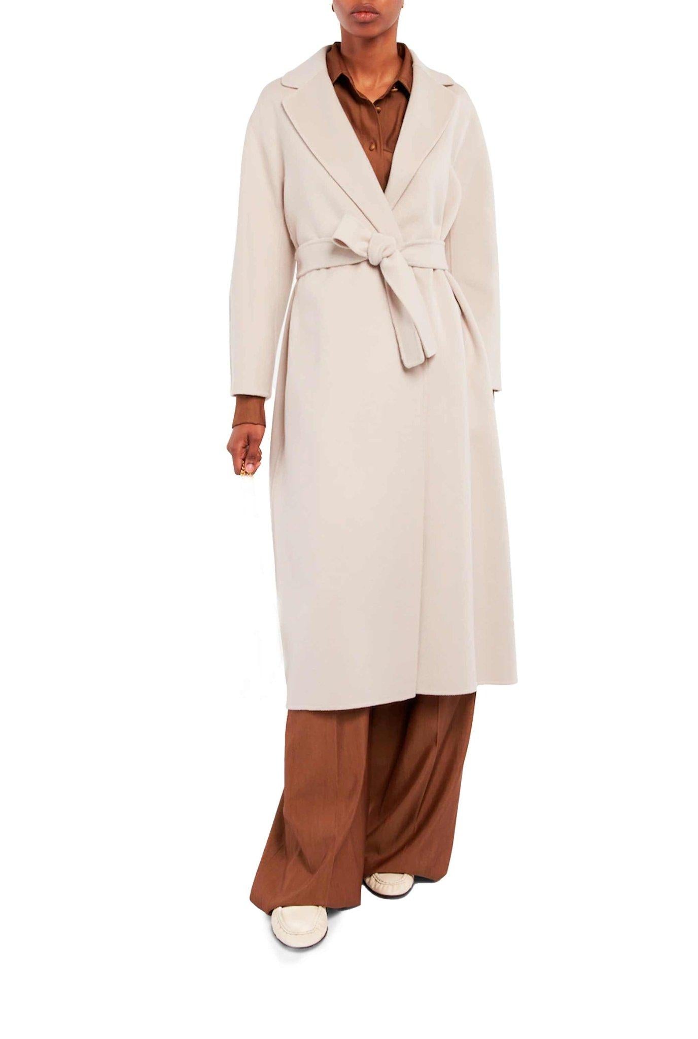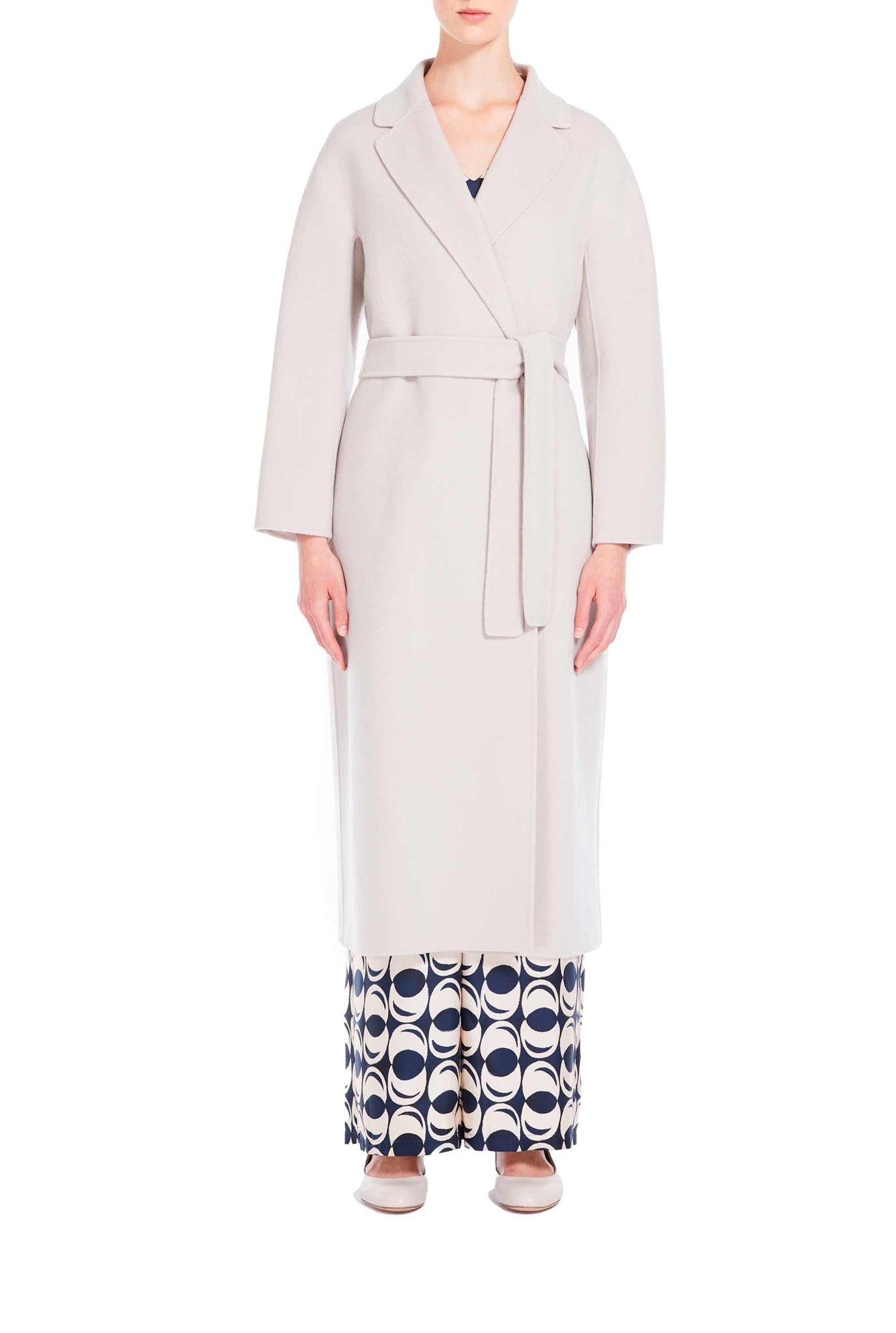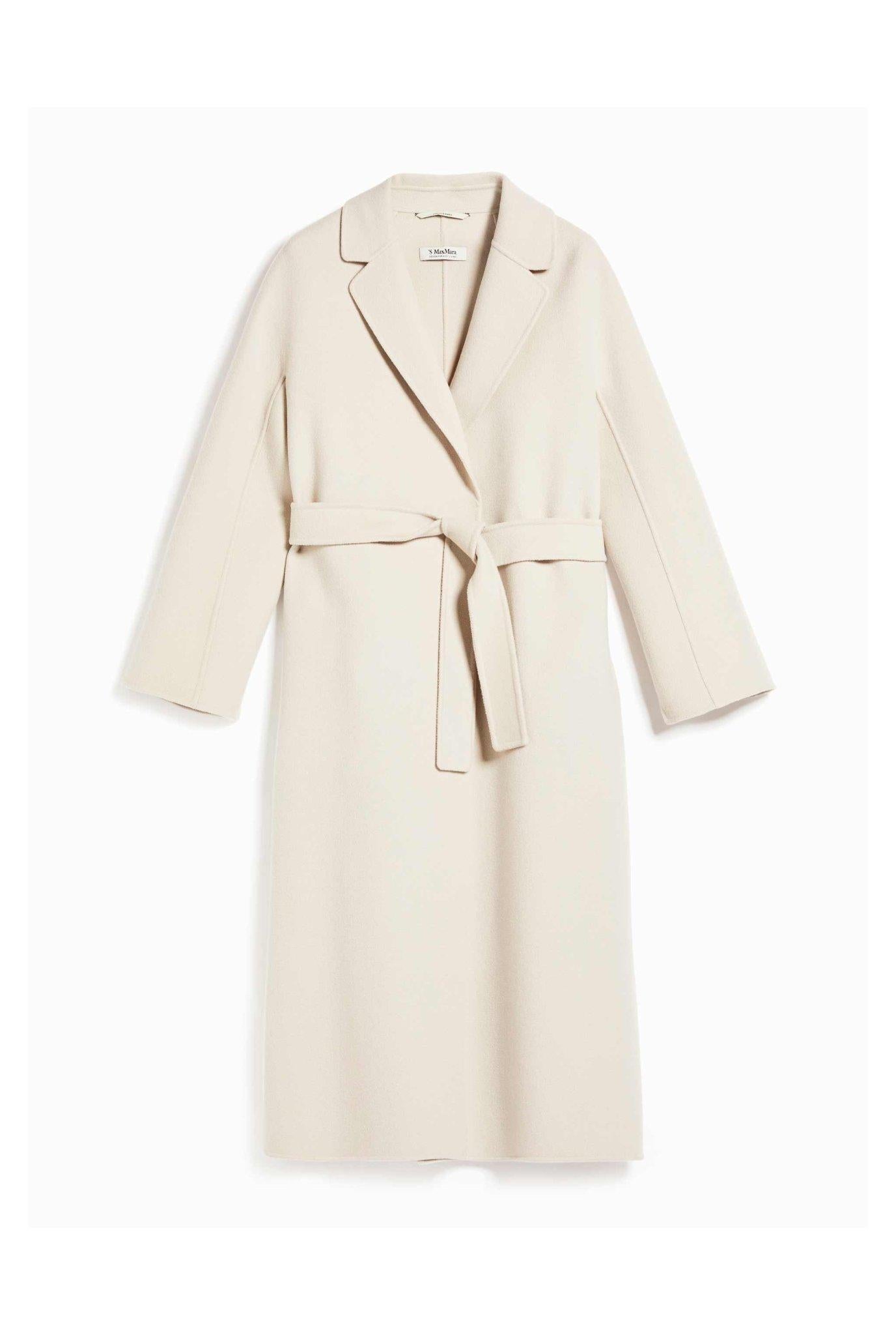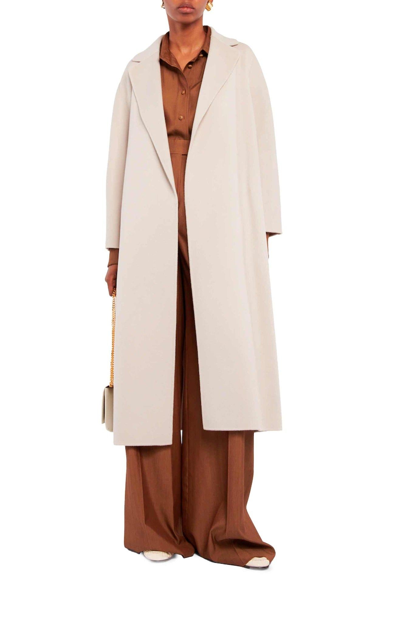 Hand-sewn, featuring a straight silhouette slightly flared at the bottom. Unlined model finished with a lapel collar, kimono sleeves and pockets tucked into the hips. Matching belt highlights the waist. 115 cm length.