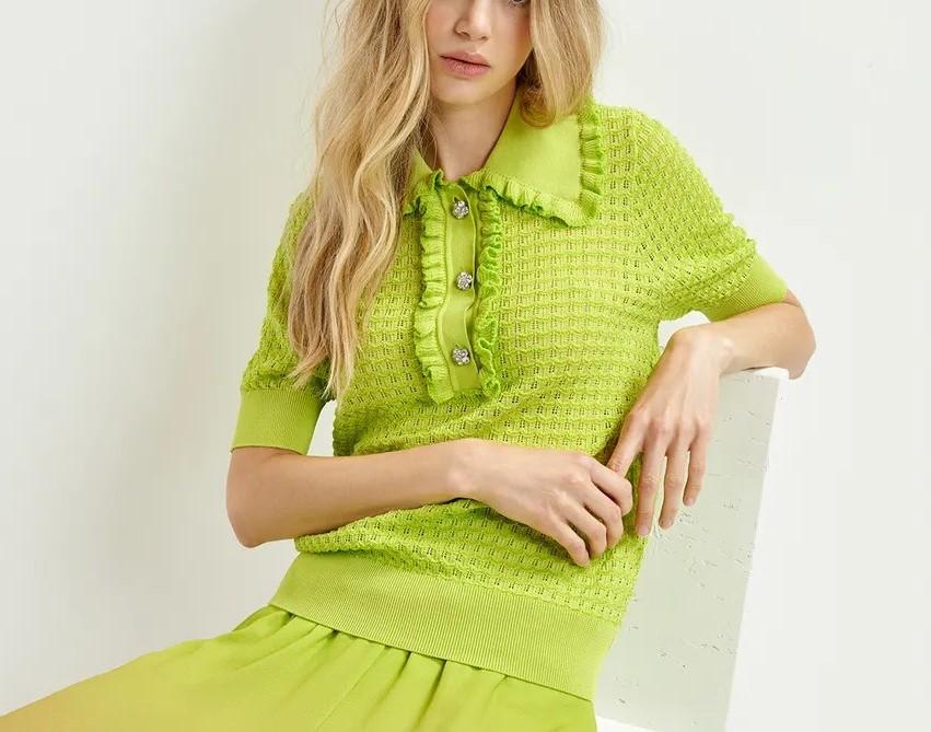 Acid green half-sleeve sweater by ESSENTIEL ANTWERP, lace weave, collar enriched with ruffles and jewel buttons, regular fit.