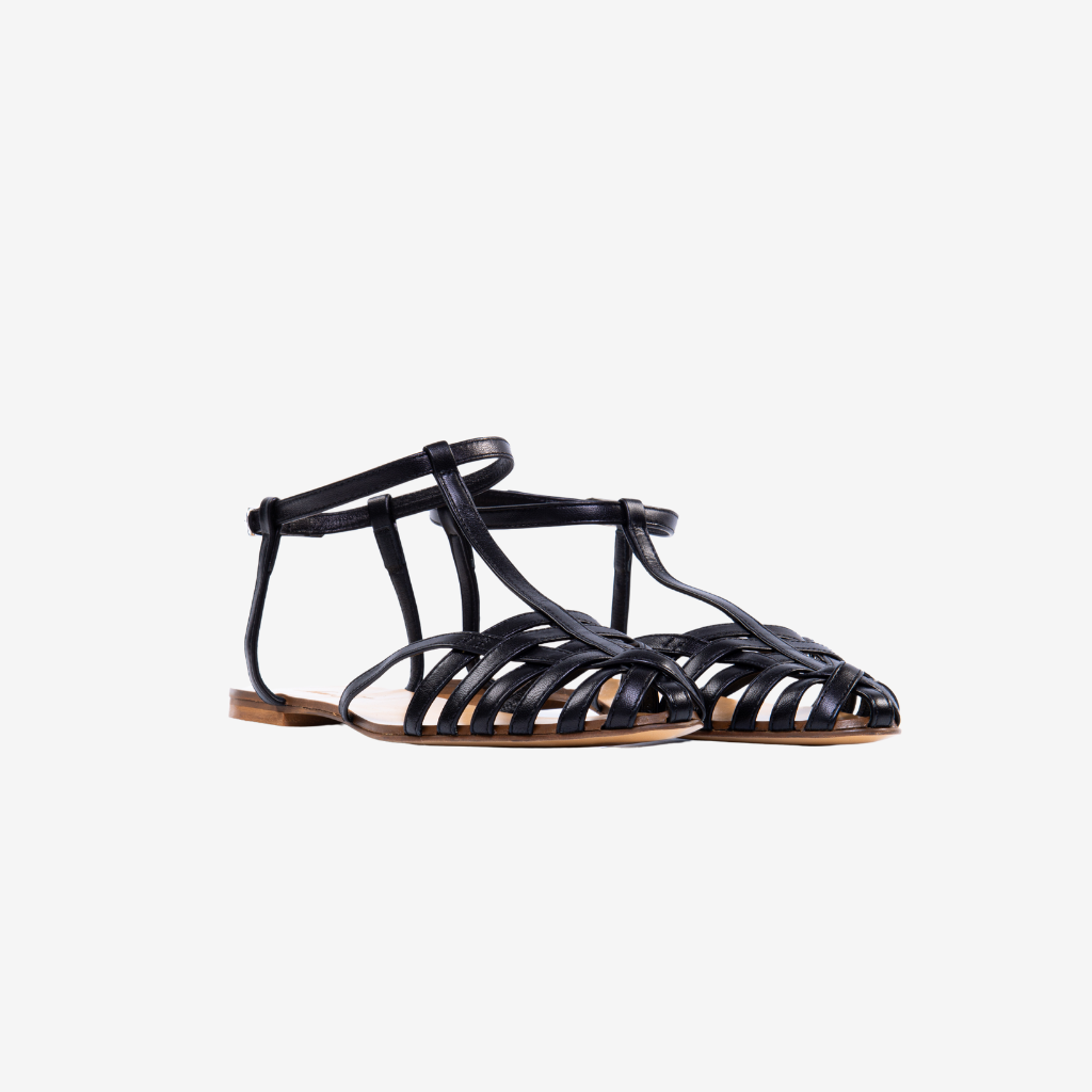 Ankle strap sandal, T-strap, ankle closure, multiple thin bands in black leather by Anna F.