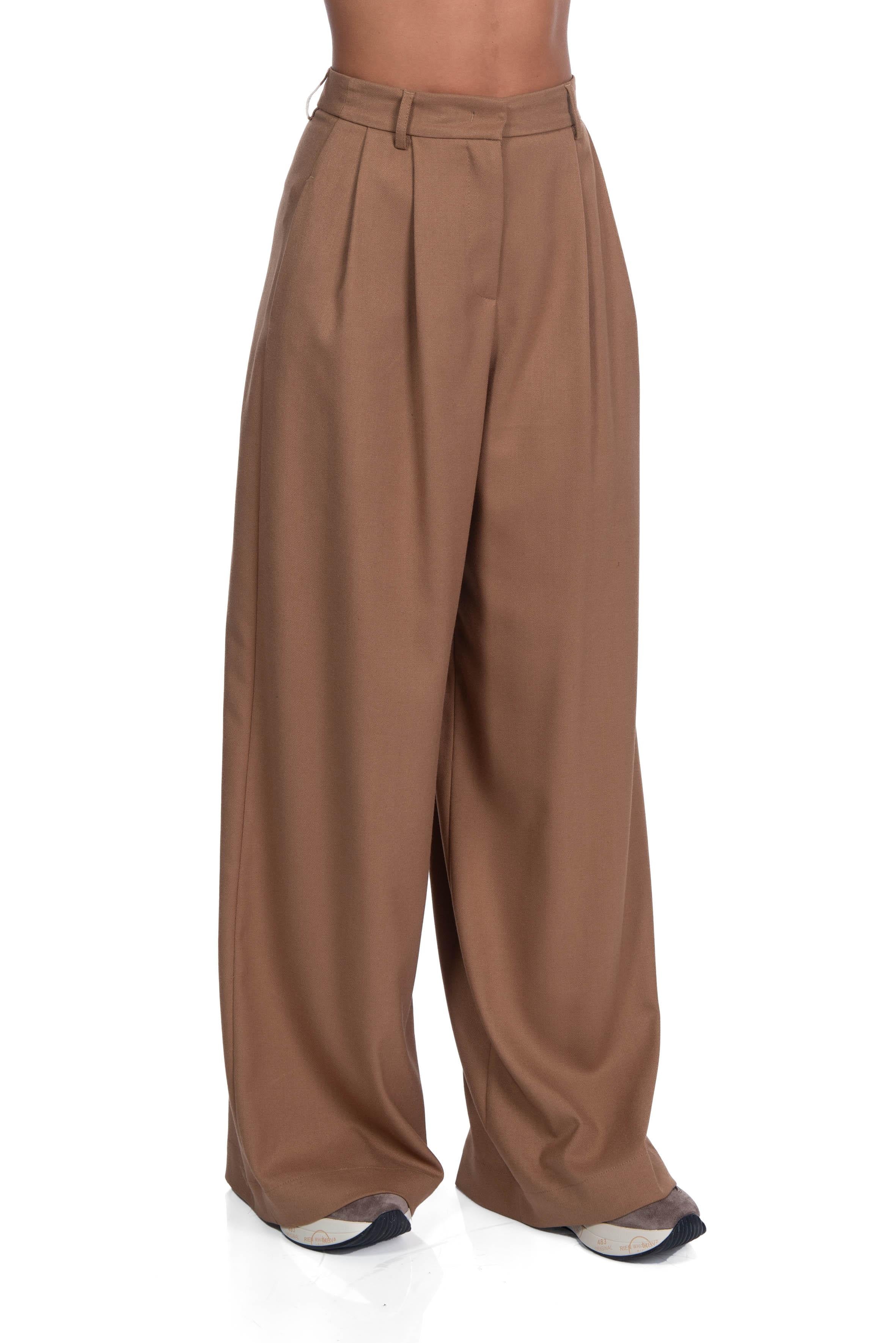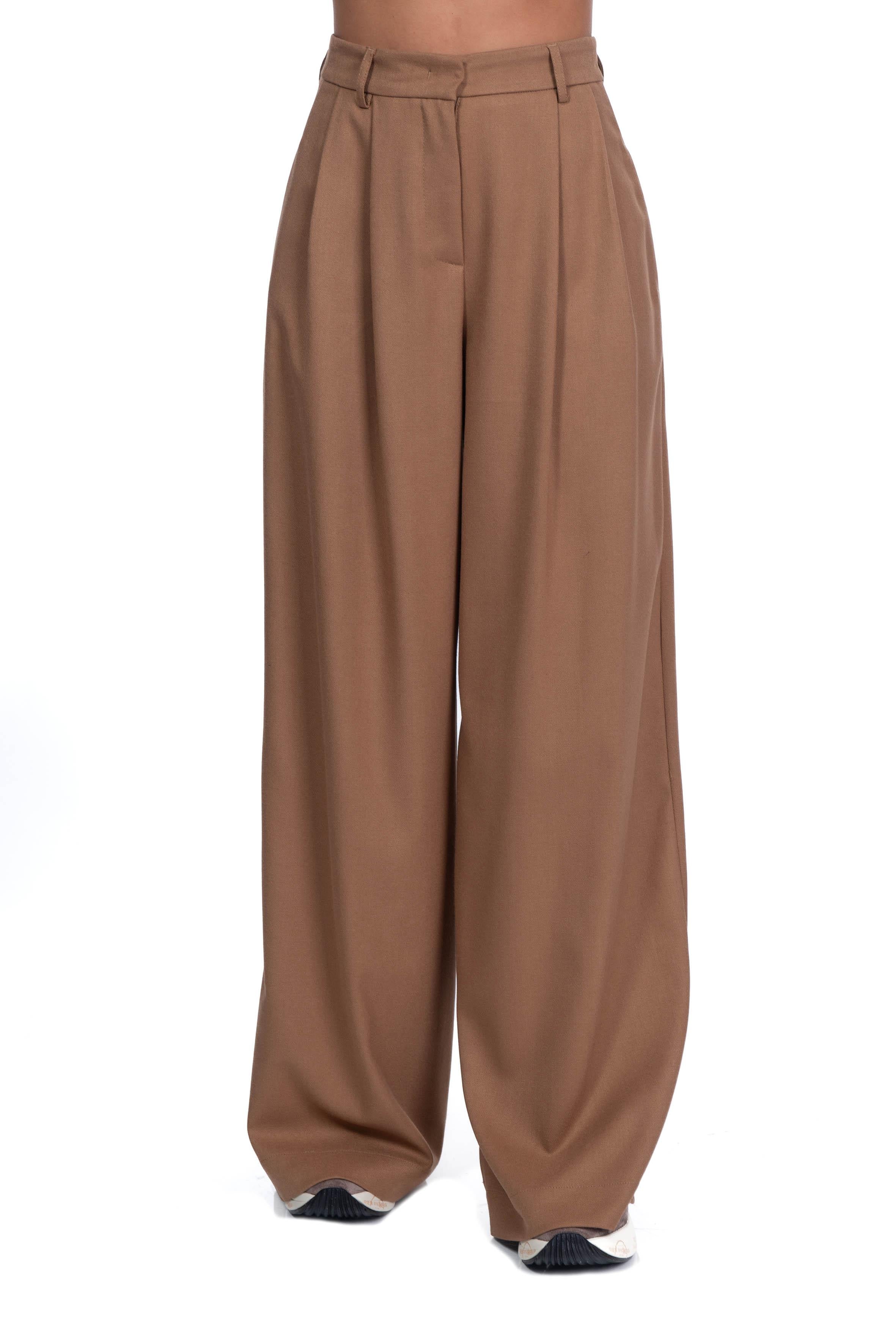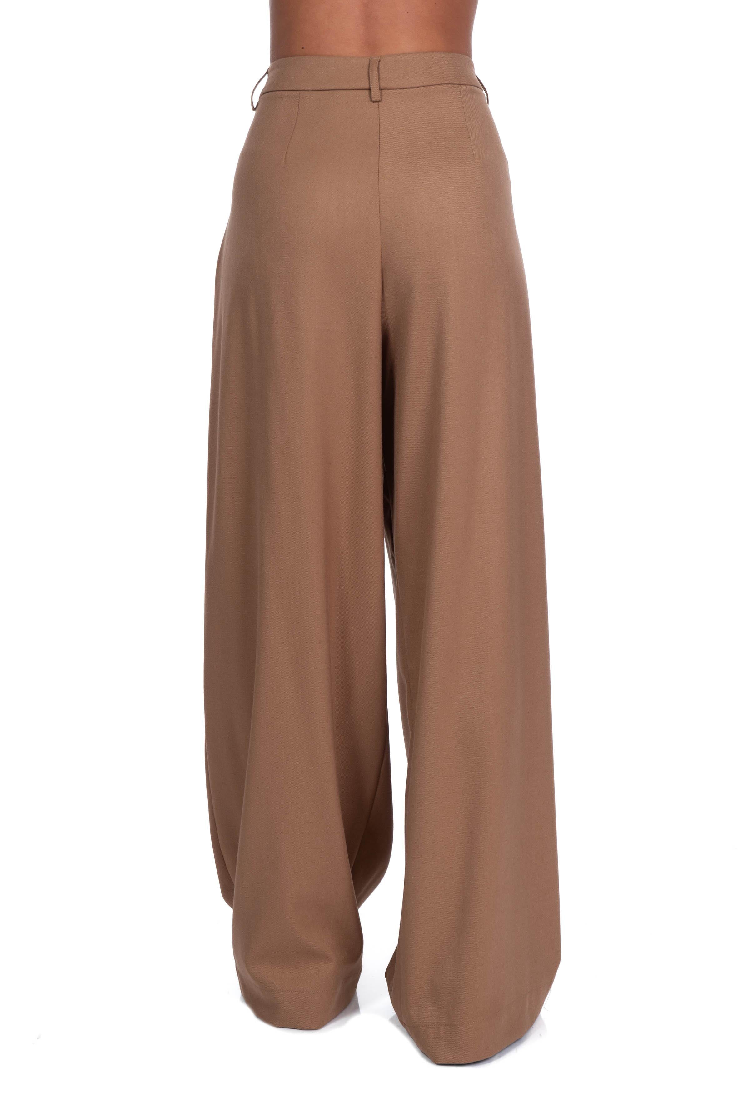 Pantalone palazzo cammello di Alice Miller, vita alta con pence sul davanti, chiusura con gancio e zip a scomparsa, vita con passanti, tasche a filetto laterali, gamba a palazzo.
