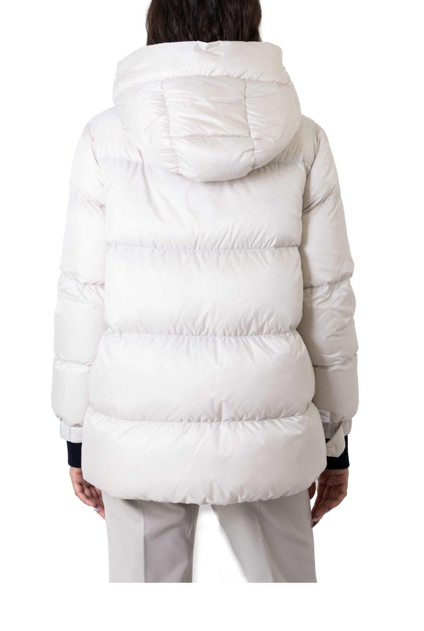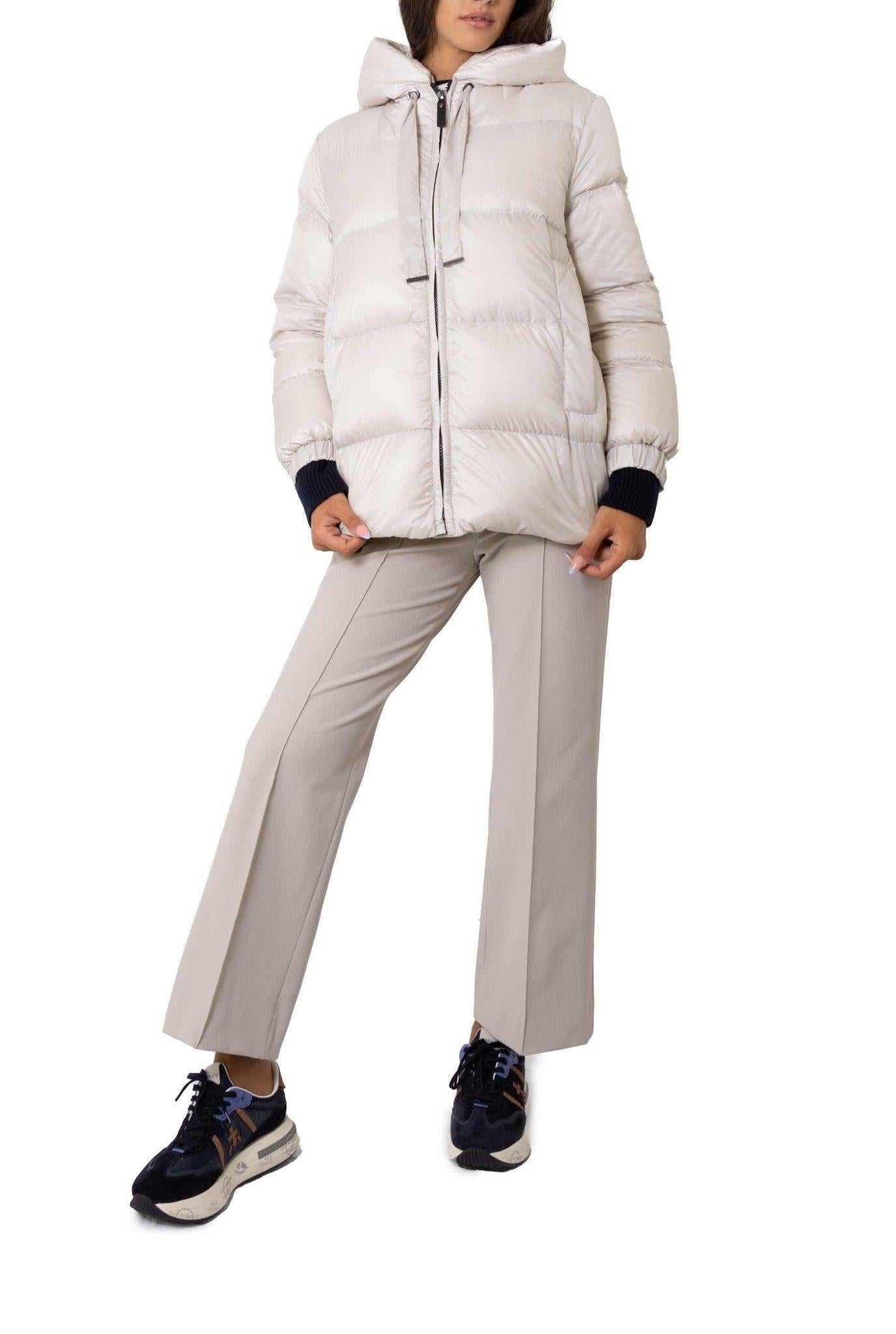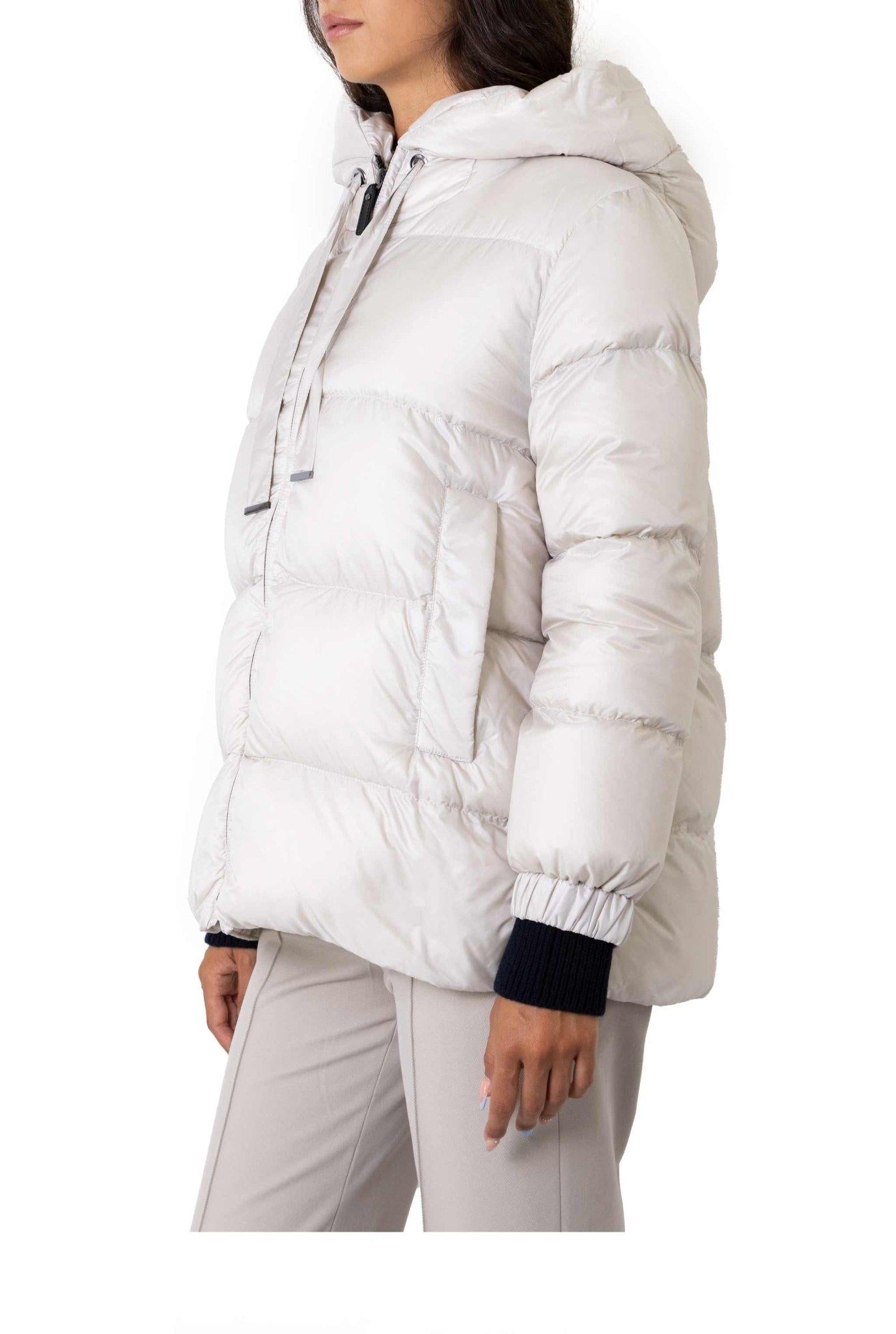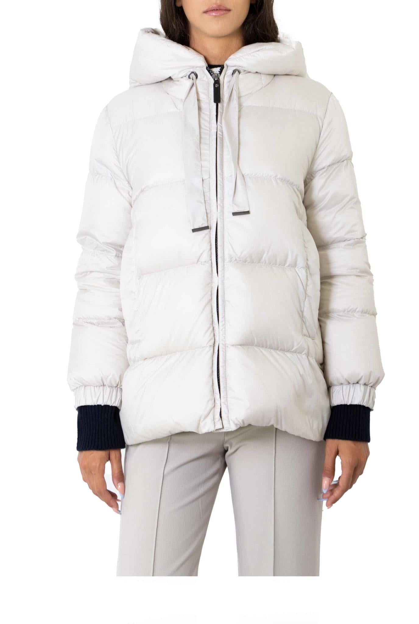 Modello con imbottitura in piuma d'oca e trapuntato, cappuccio a coulisse, polsi elastici e tasche a filettone.