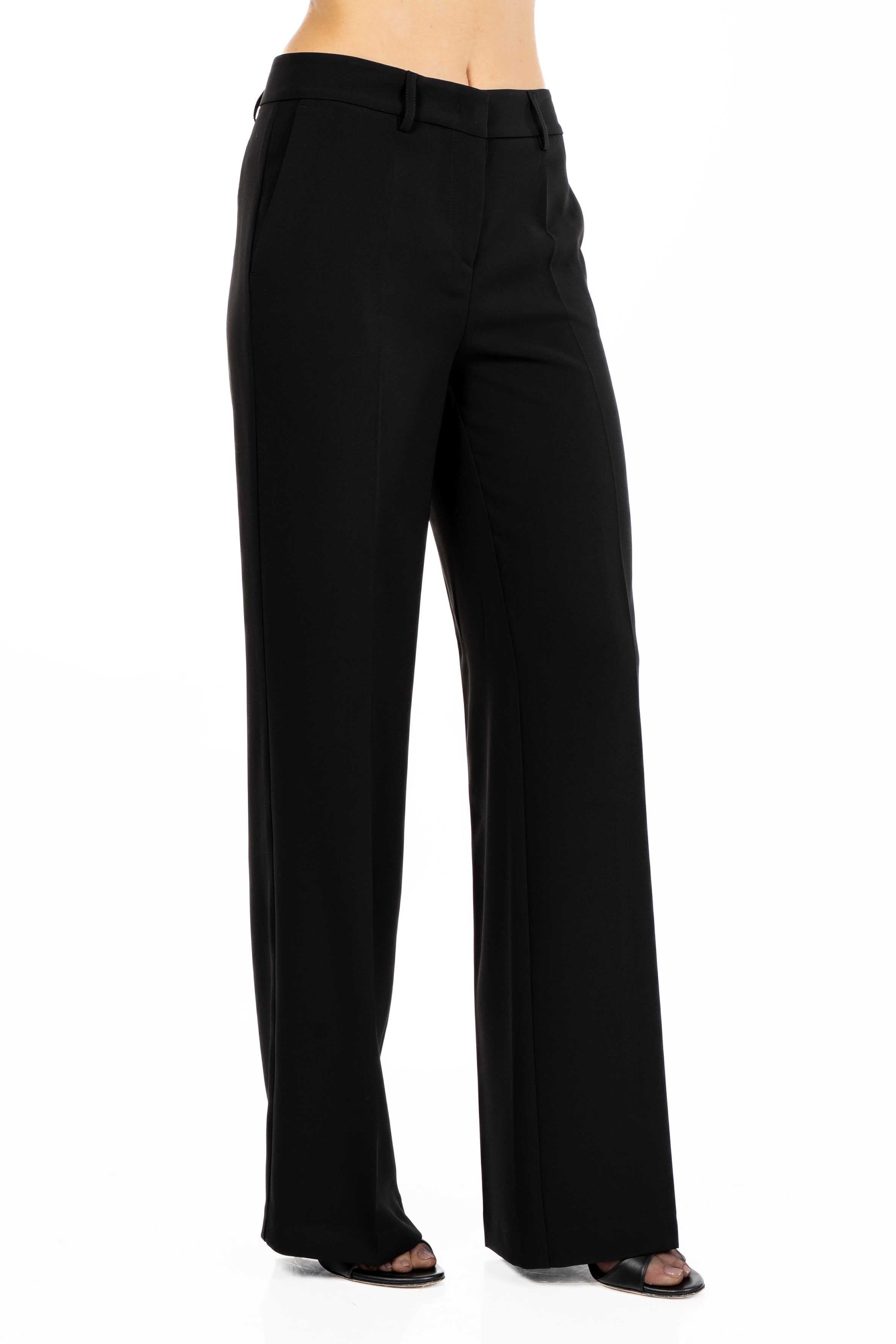 Tailleur nero di ALICE MILLER. Giacca doppiopetto, tasche con patta sul davanti, taschino, spacco posteriore centrale, pantalone cady vita alta, gamba larga, tasche laterali a filo, tasche posteriori a filo, chiusura frontale con gancio e zip a scomparsa.