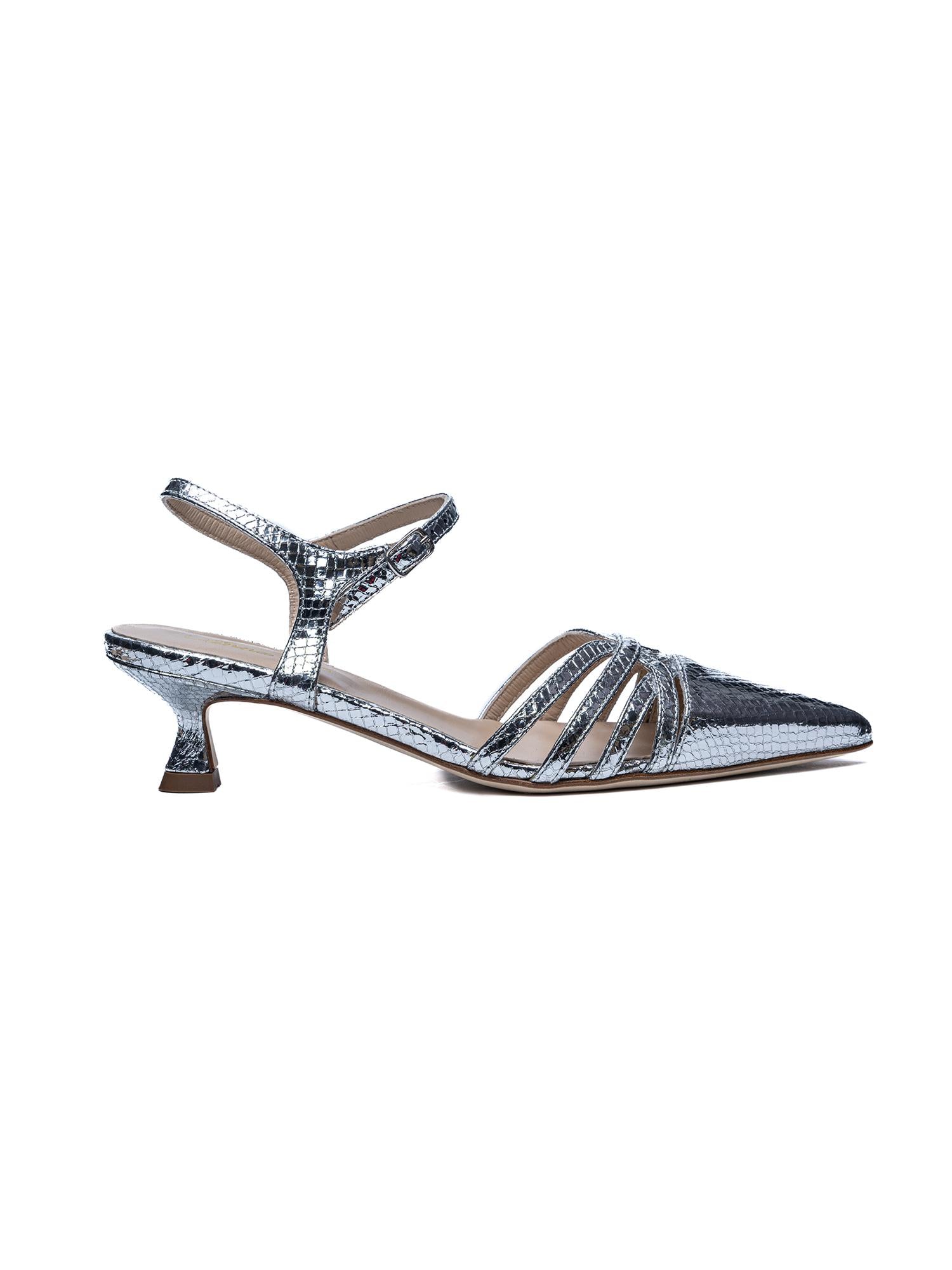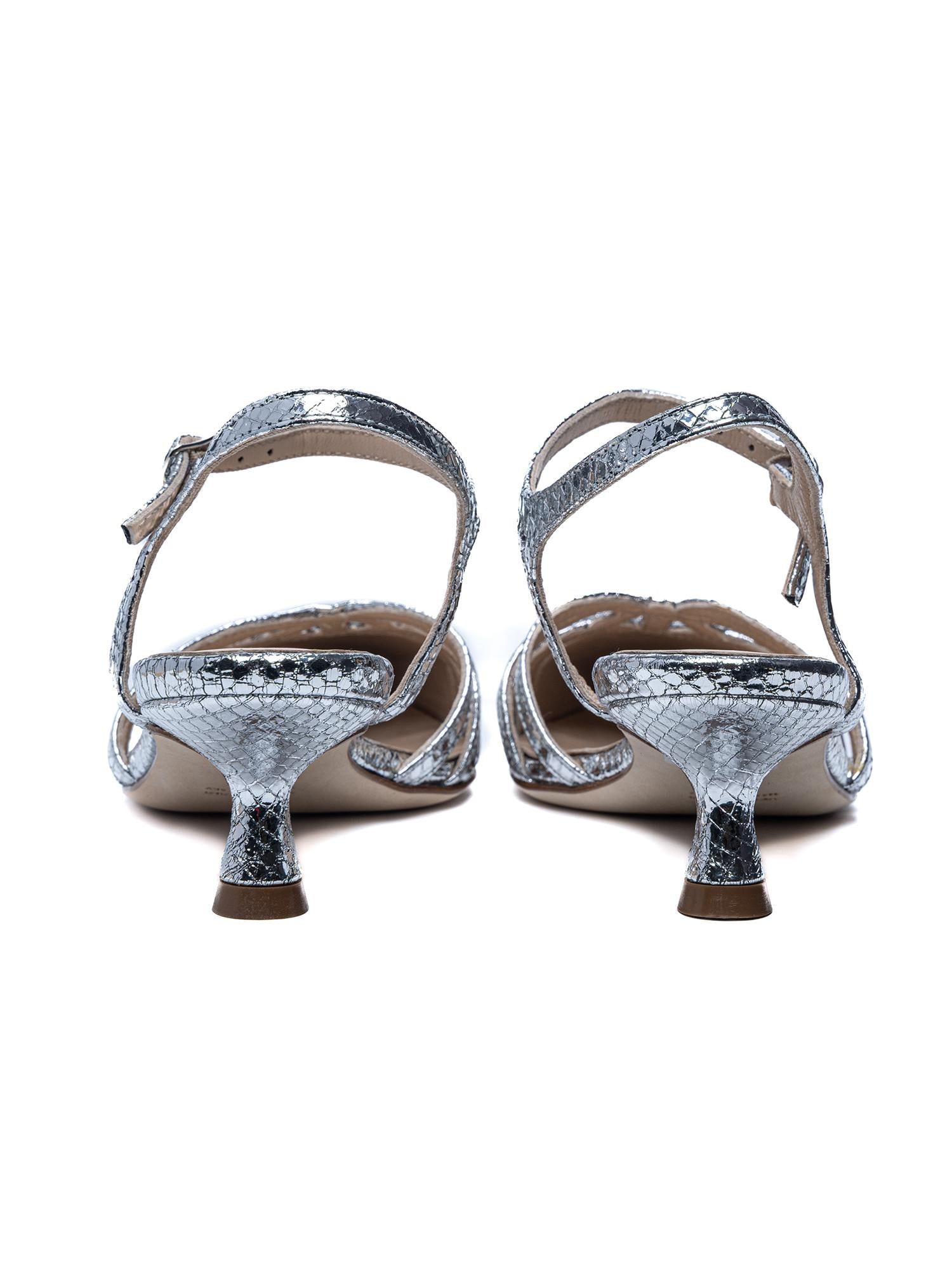 Slingback laminata argento di ANNA F. a punta, stampa pitone, cinturino alla caviglia regolabile.