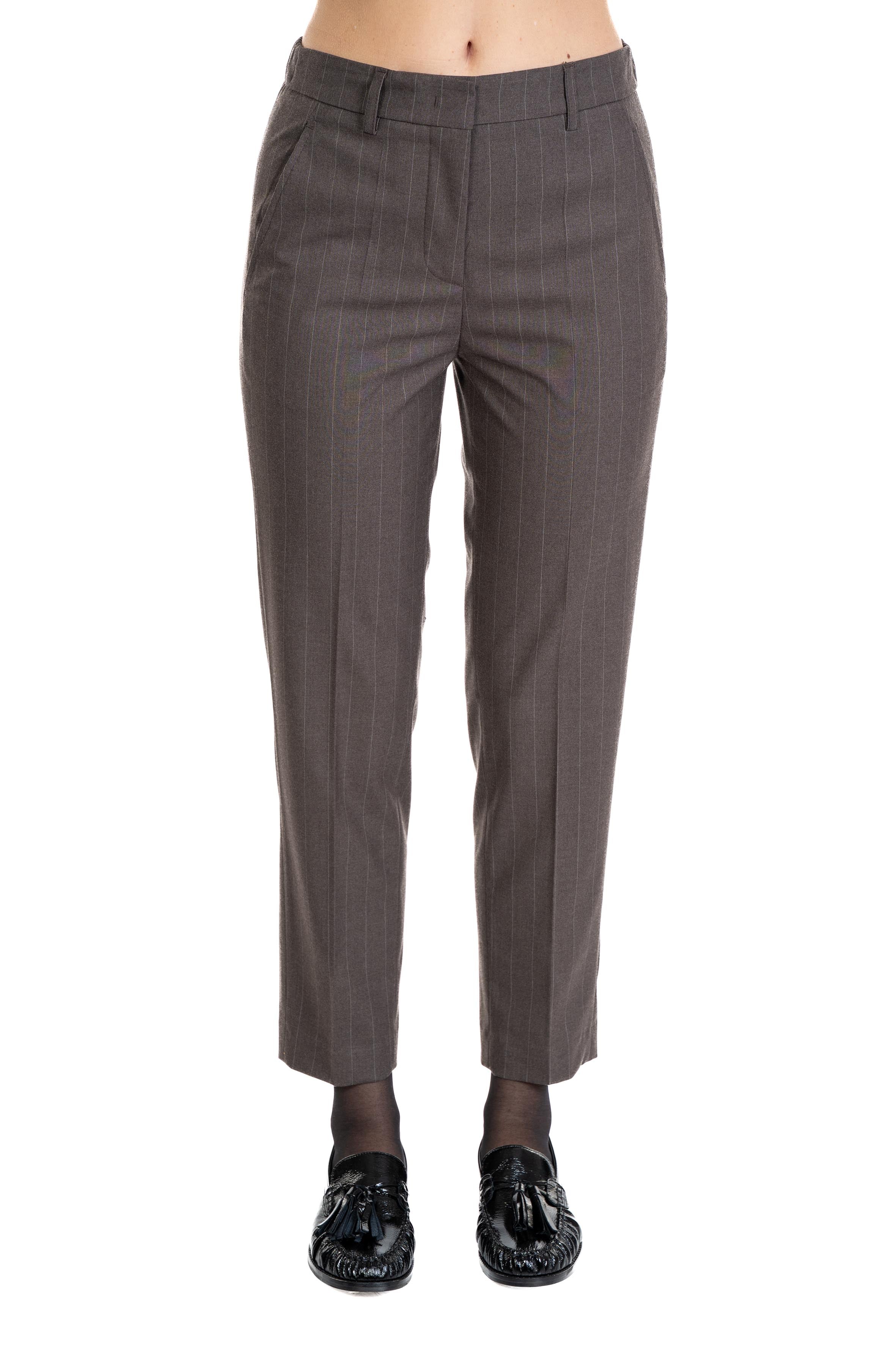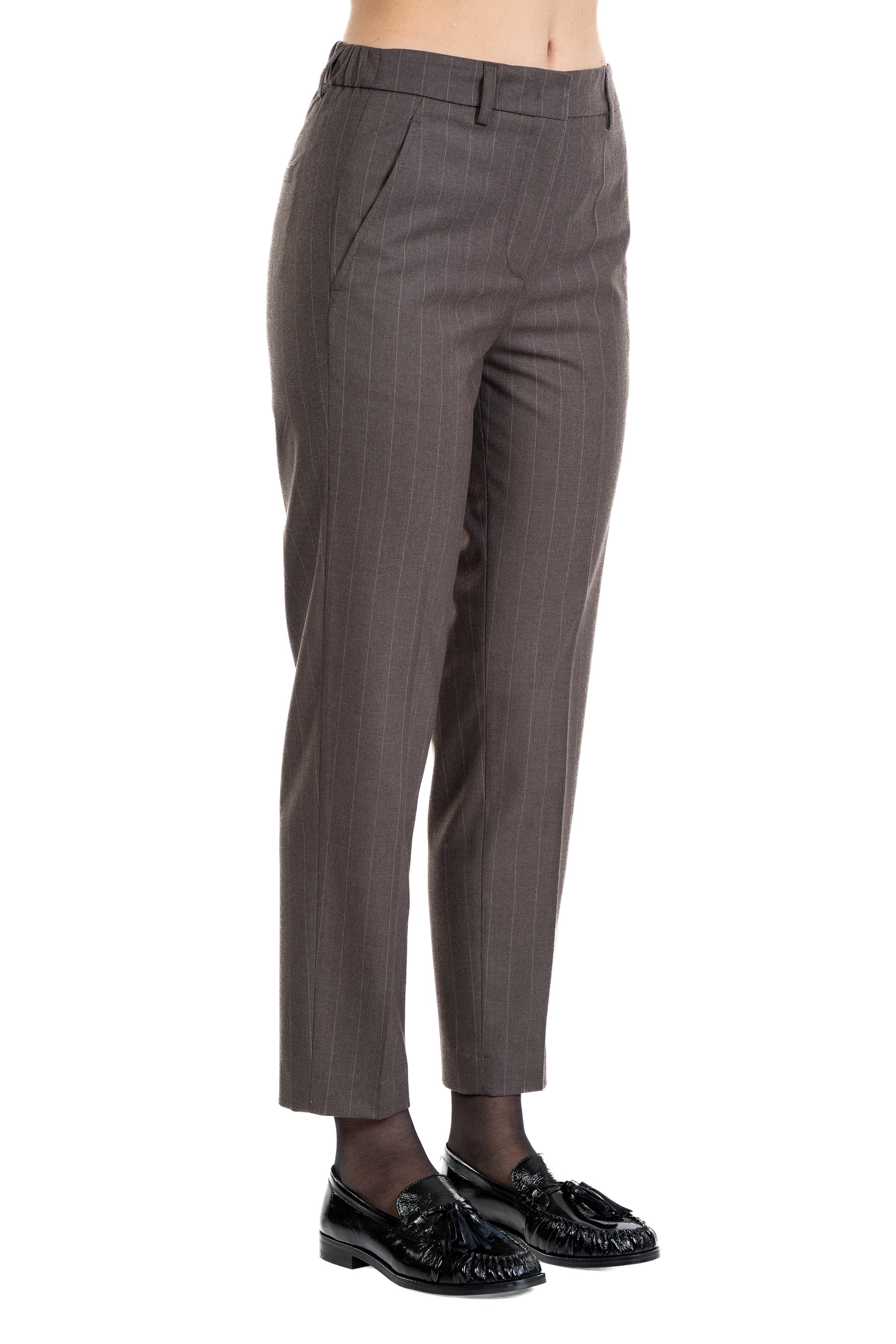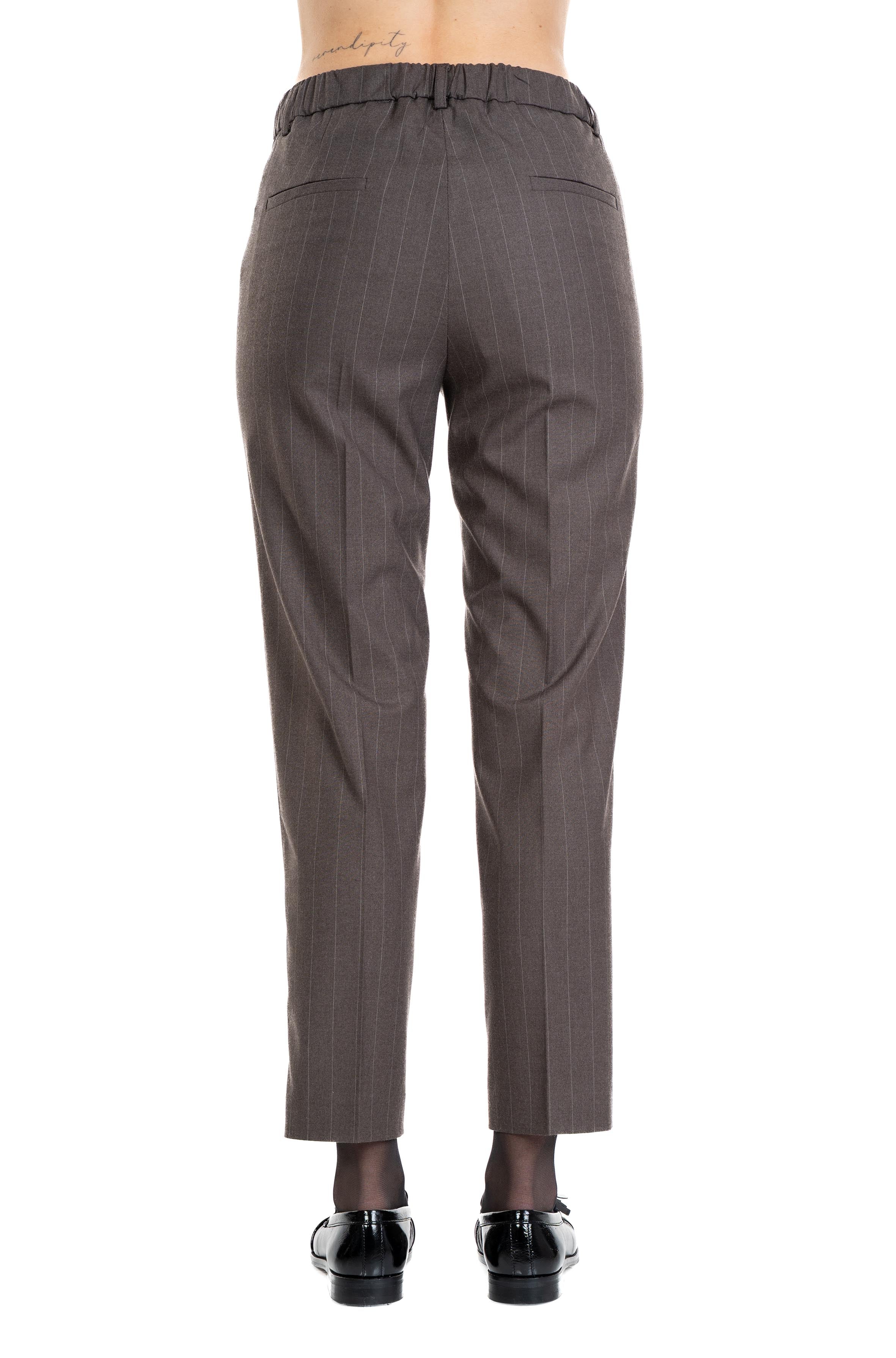 Tailleur in misto lana gessato toupe di ALICE MILLER. Giacca monopetto, chiusura due bottoni, due tasche con patta e una a filo sul davanti, collo a lancia. Pantalone dritto, chiusura con gancio e zip a scomparsa, elastico sul retro, vita con passanti, tasche a filo laterali.