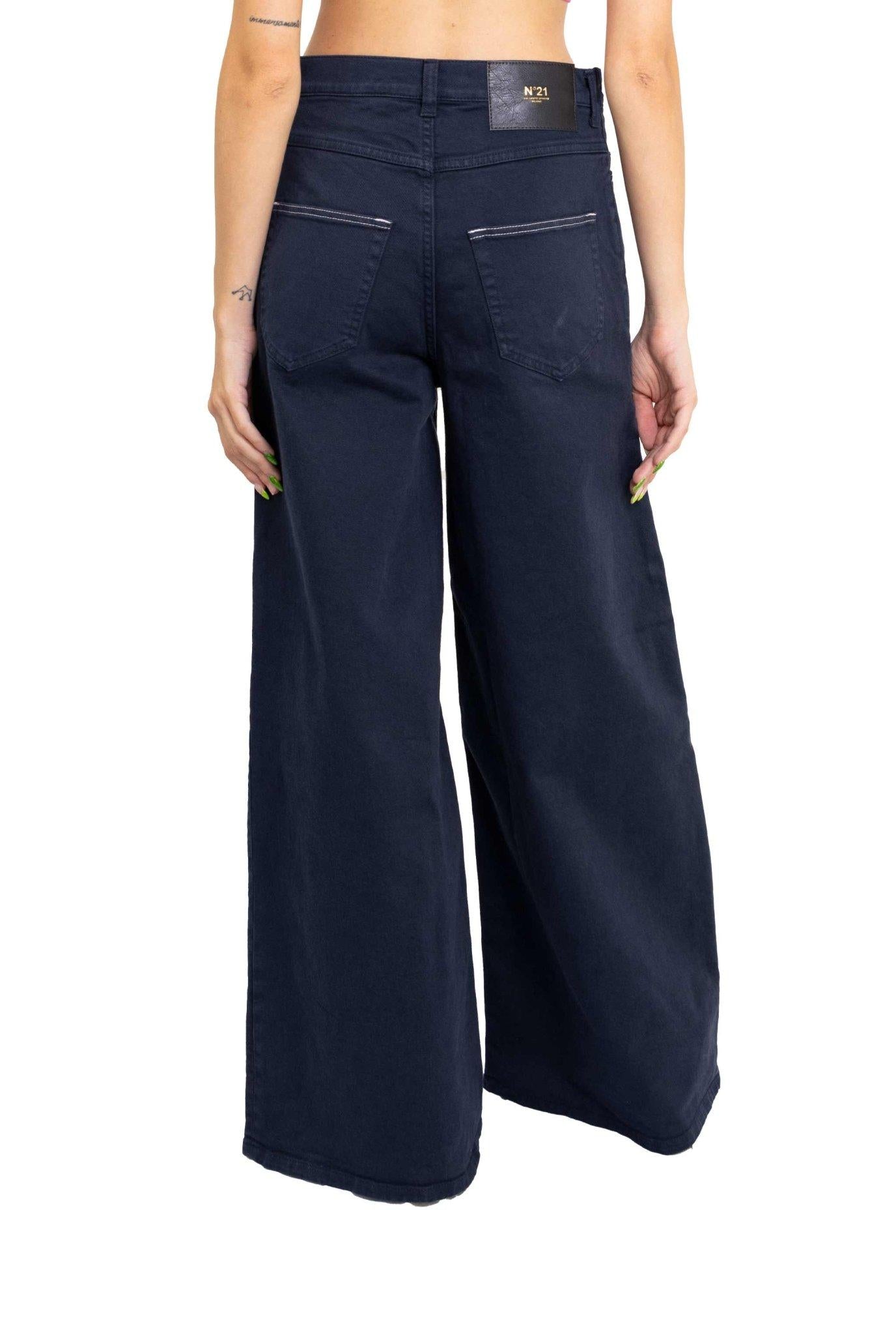 Modello vita alta con passanti per cintura. progettare cinque tasche. patch con logo N°21 nero sul retro. Impuntura un contrasto. chiusura frontale con bottoni. Vestibilità morbida