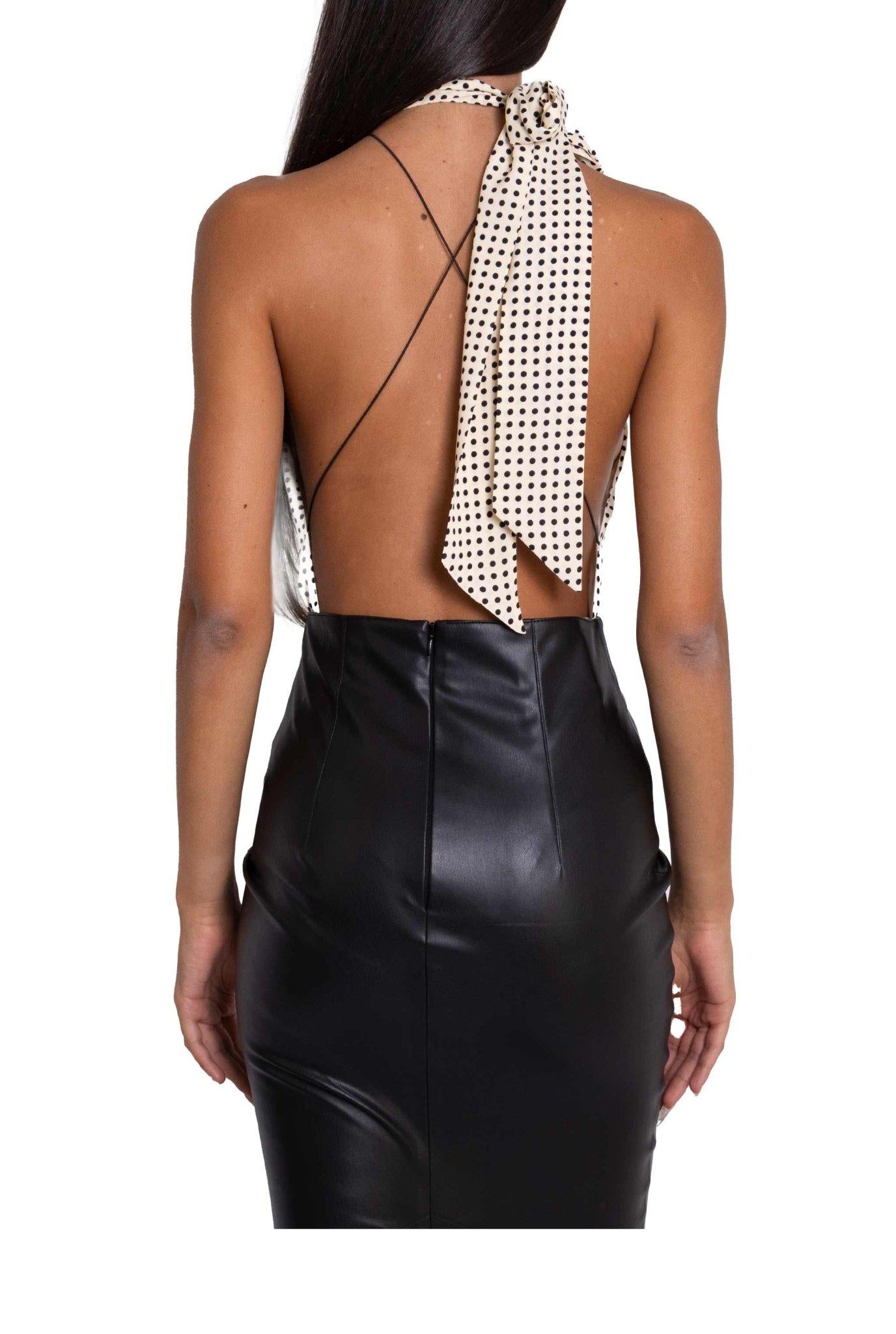 Body a collo alto, scollo halter, fiocco da allacciare dietro al collo, scollatura posteriore con decorazione con fili elastici a contrasto neri. Fantasia pois