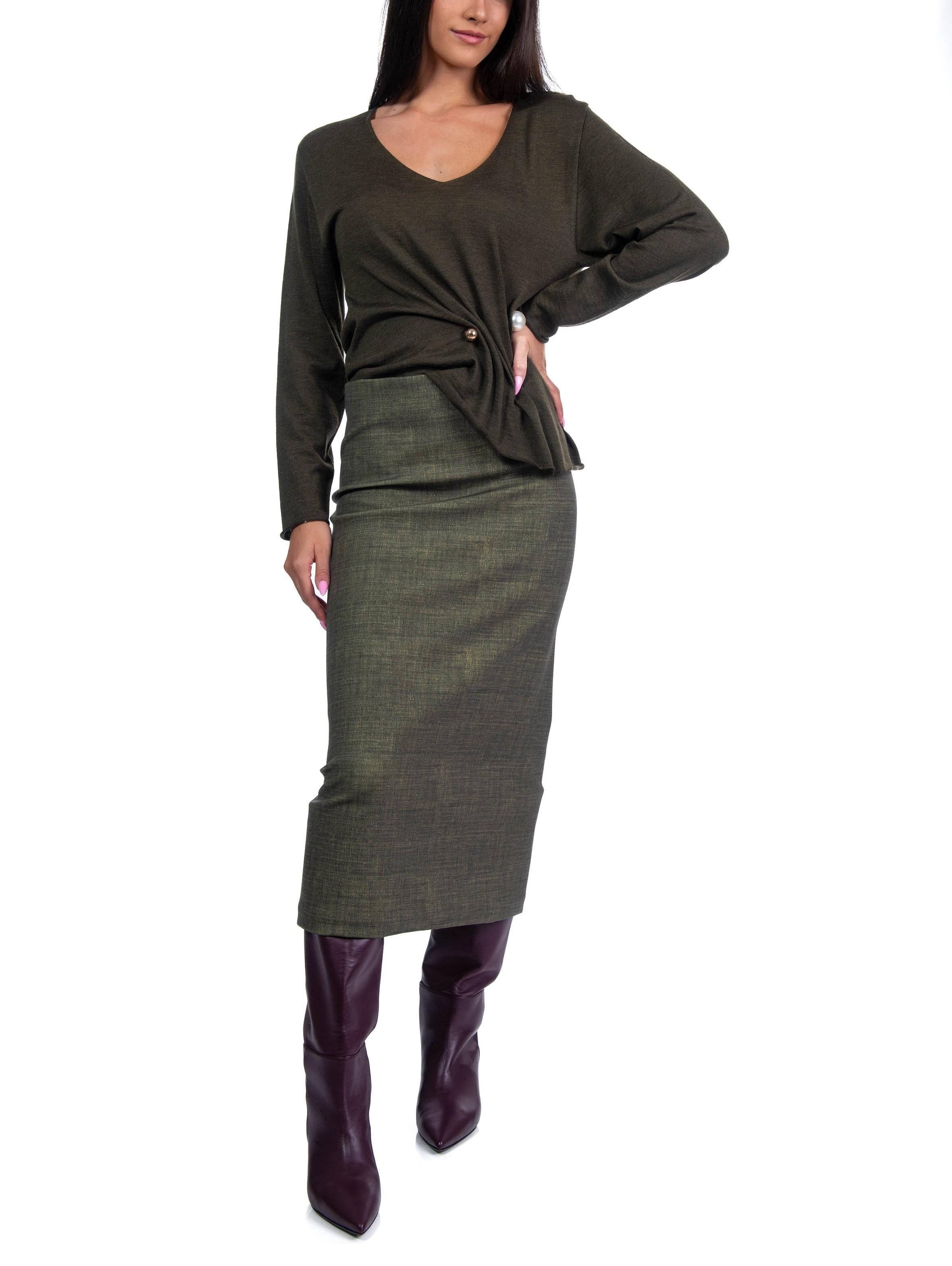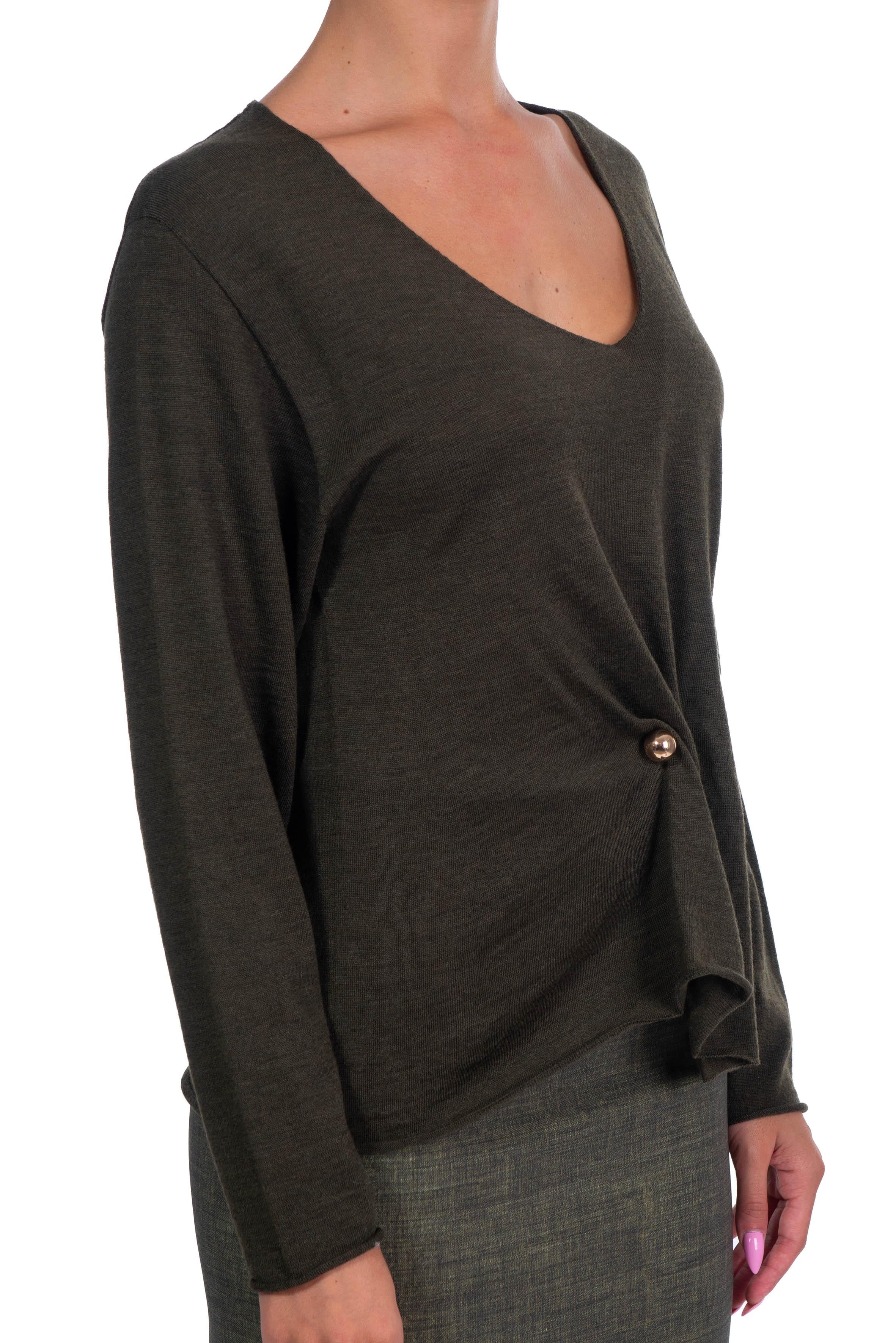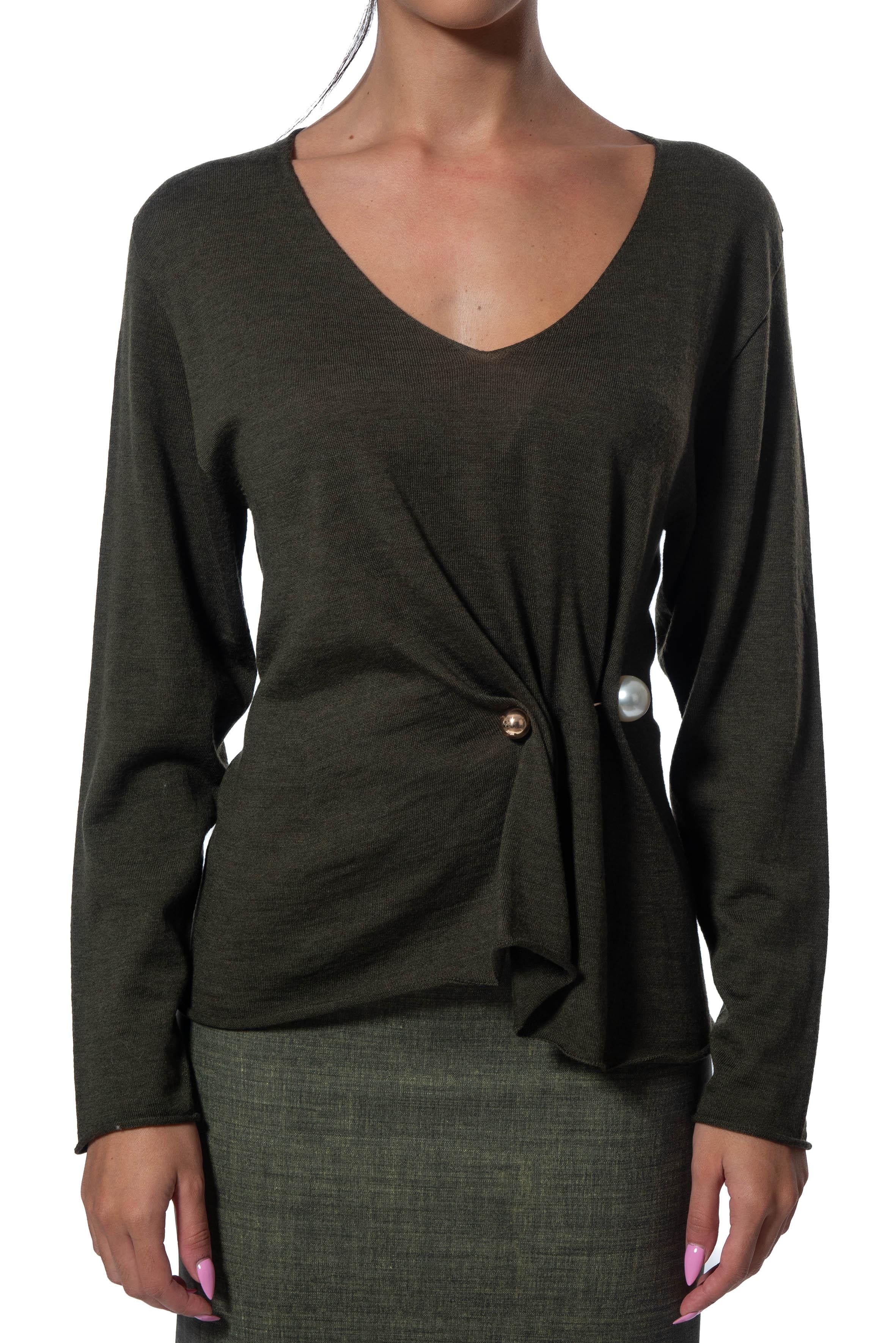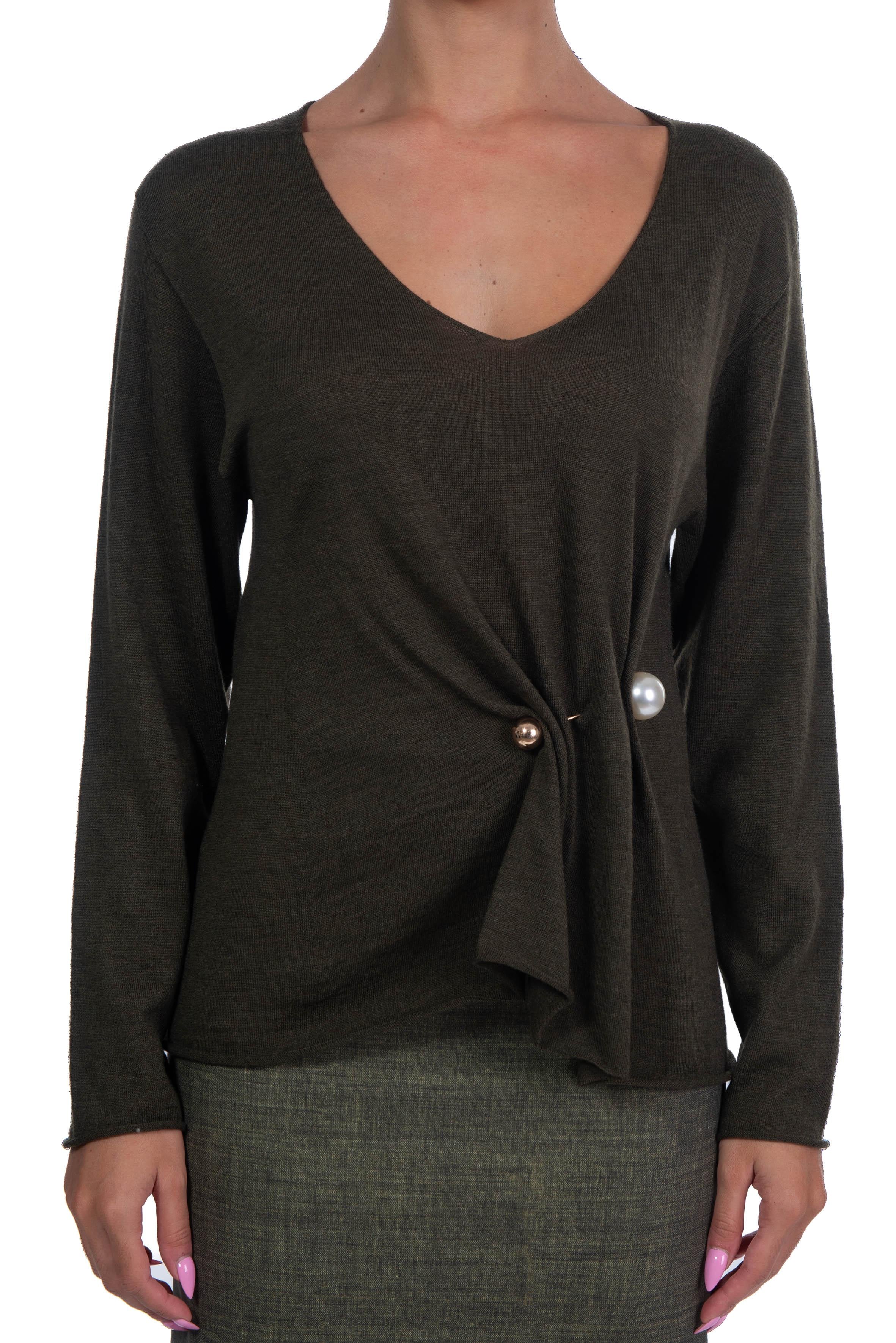 Maglia in misto seta e cachemire con scollo a V, di Philosophy, il piercing con sfera dorata e perla bianca crea morbide arricciature che enfatizzano il punto vita.