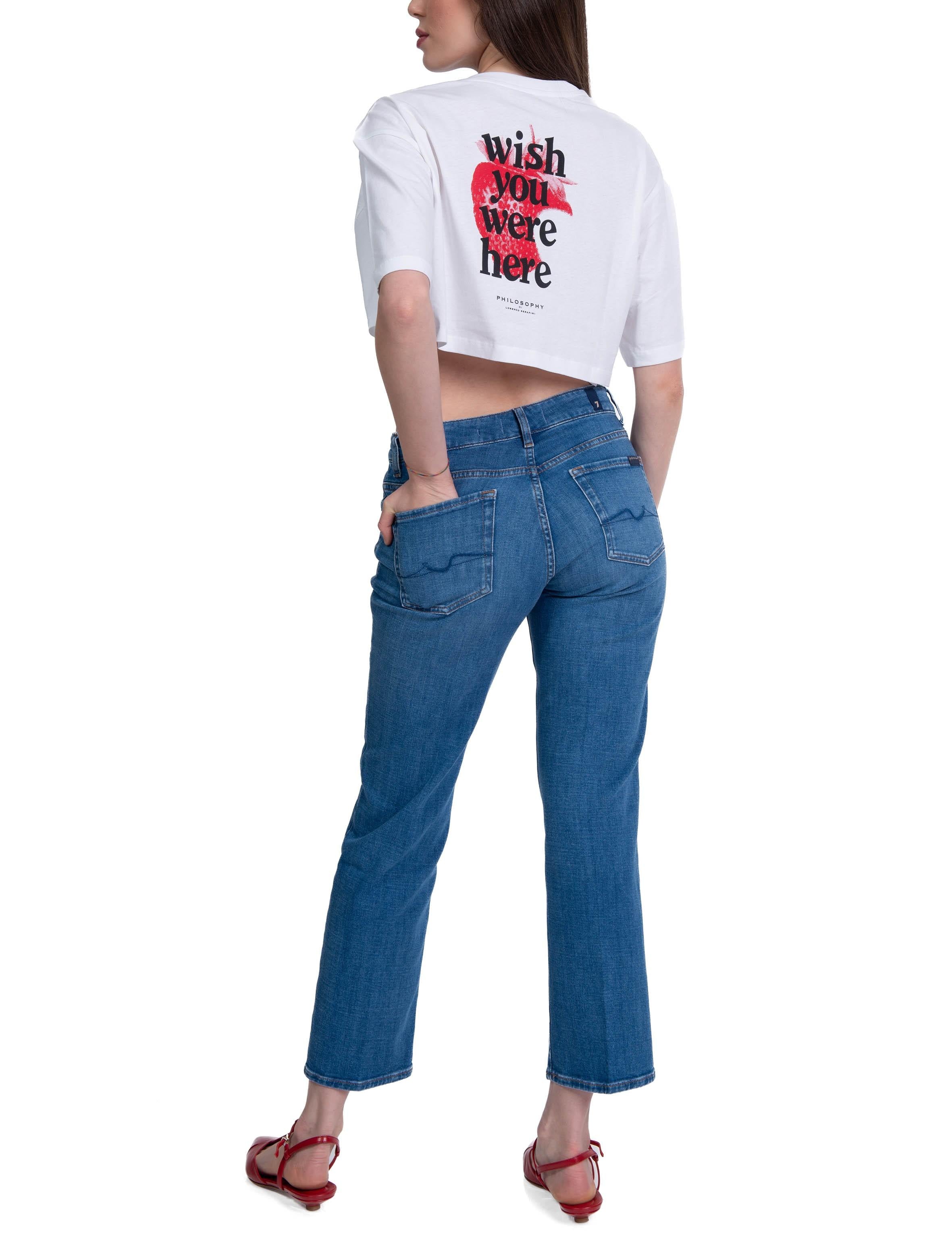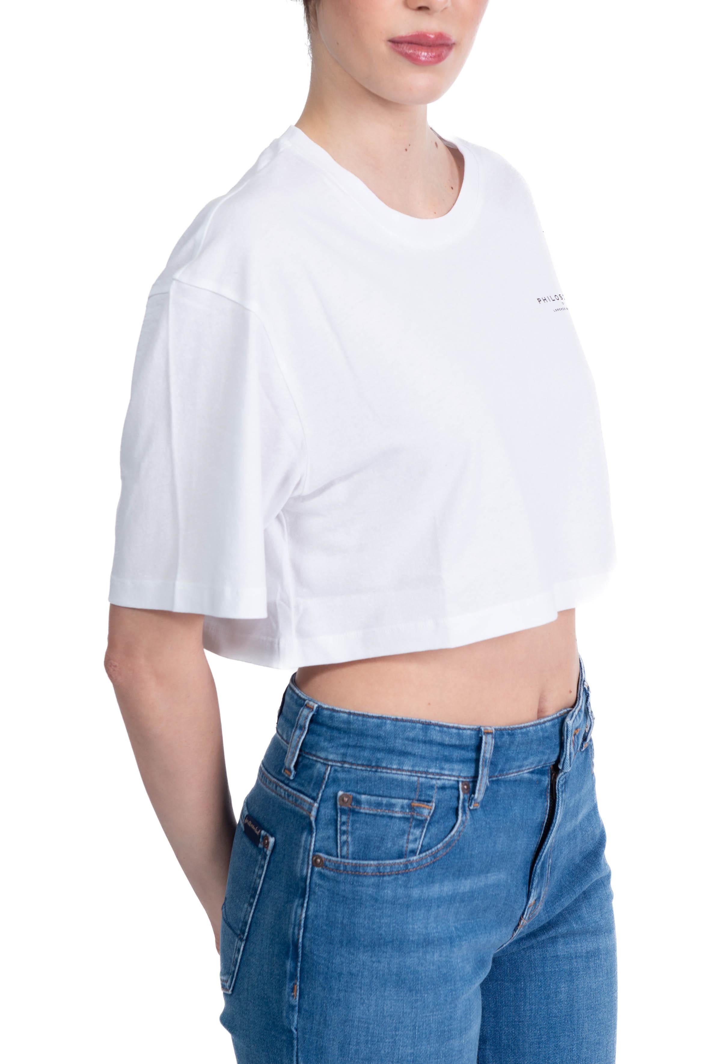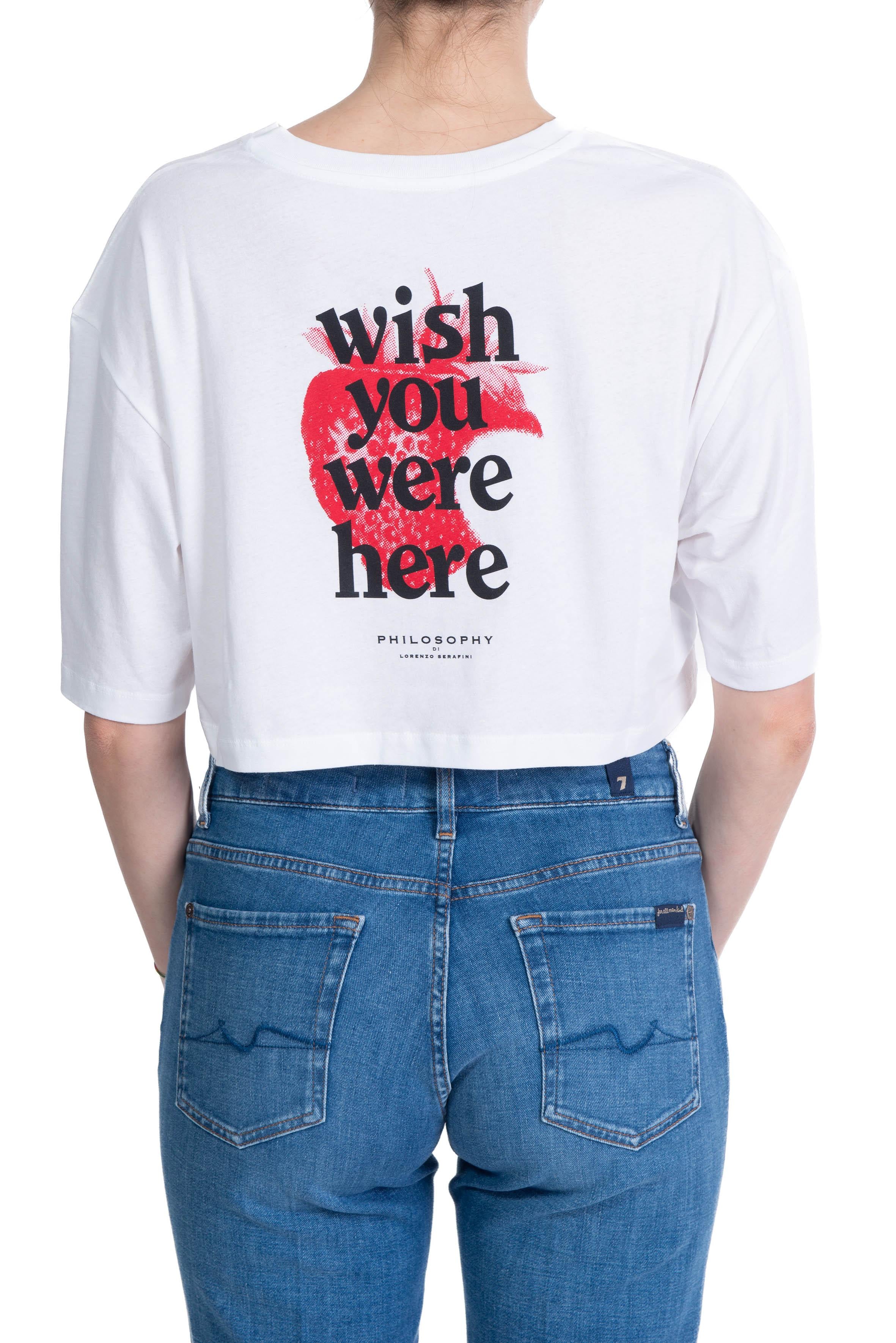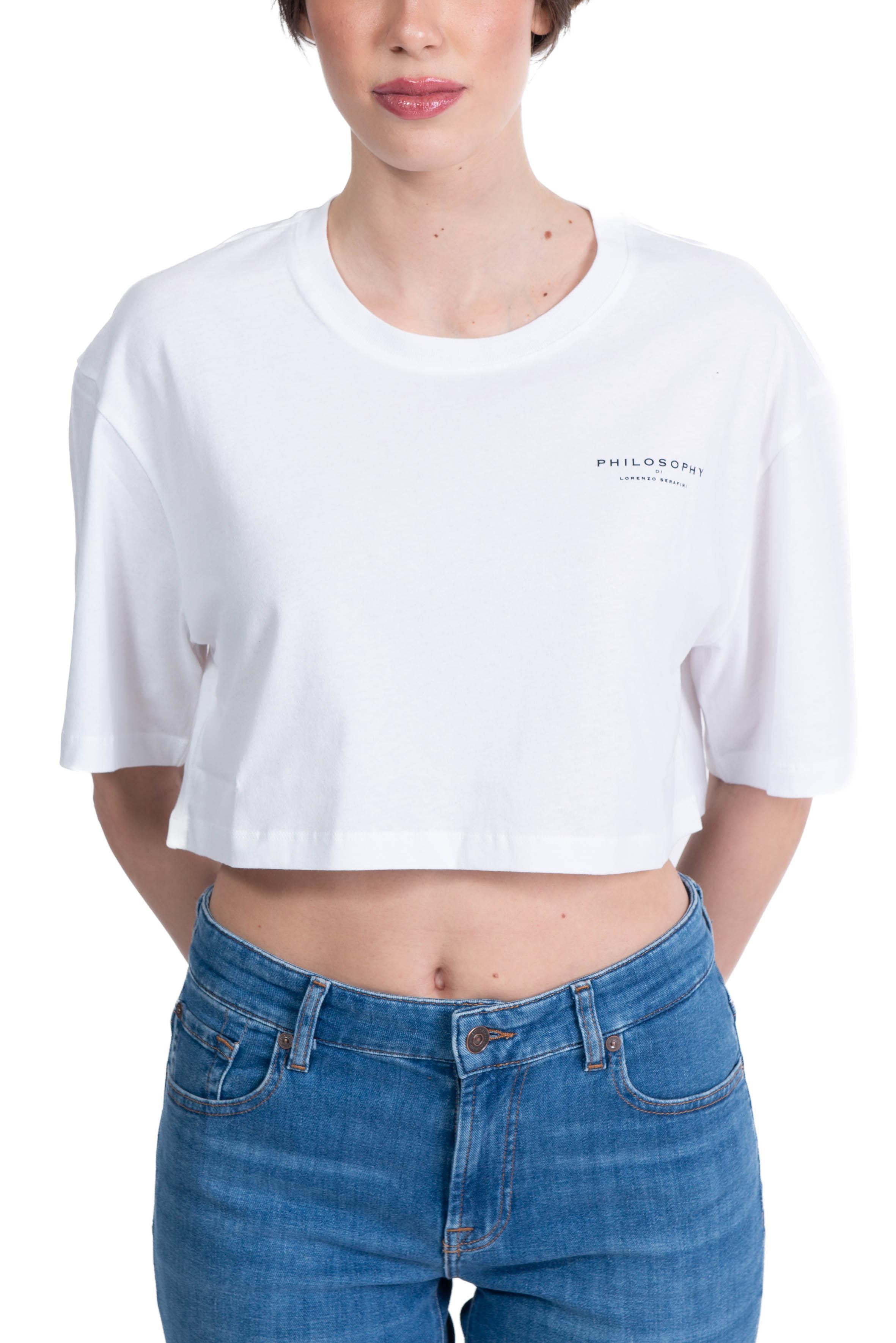 t-shirt crop in jersey organico riciclato bianca con stampa rossa