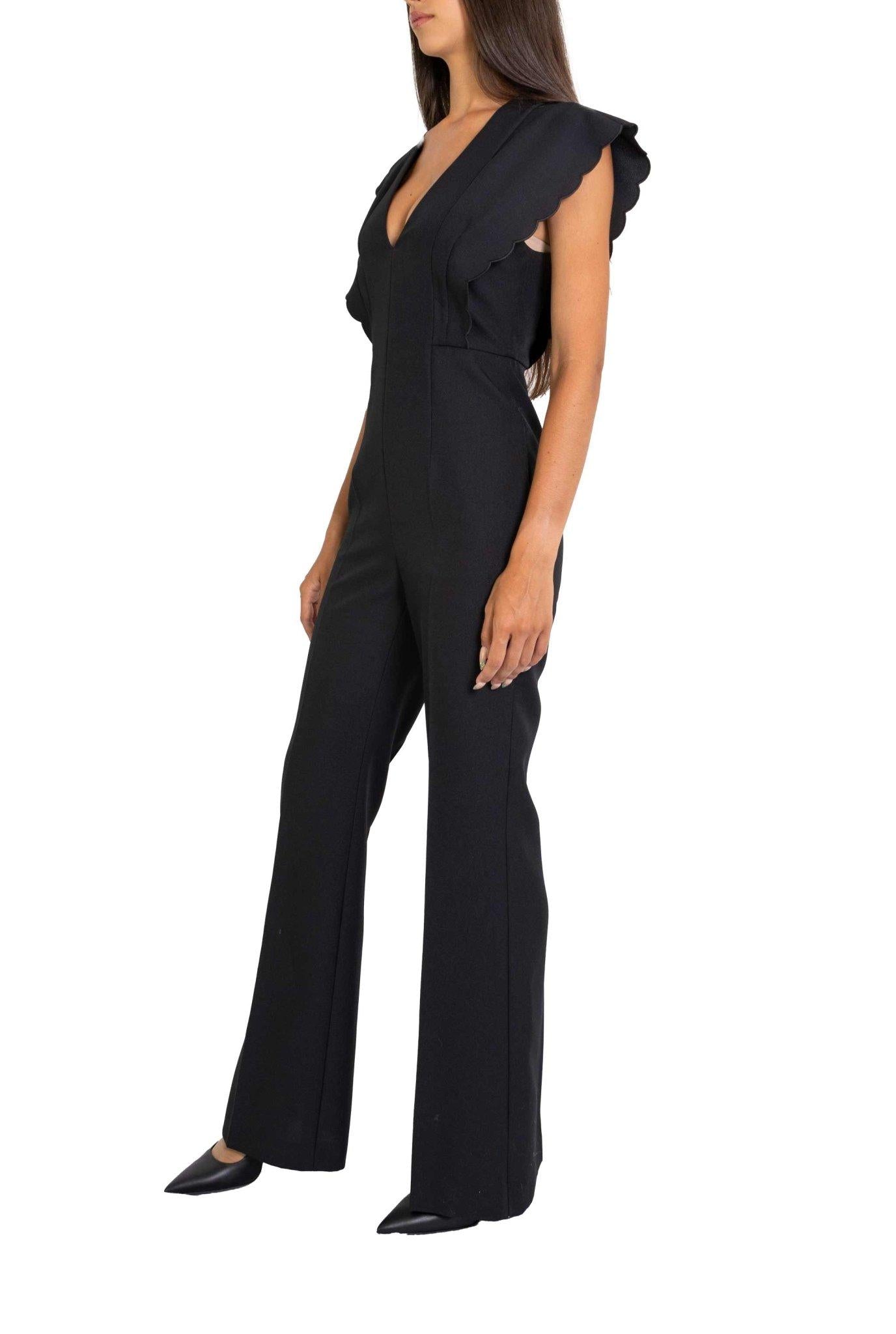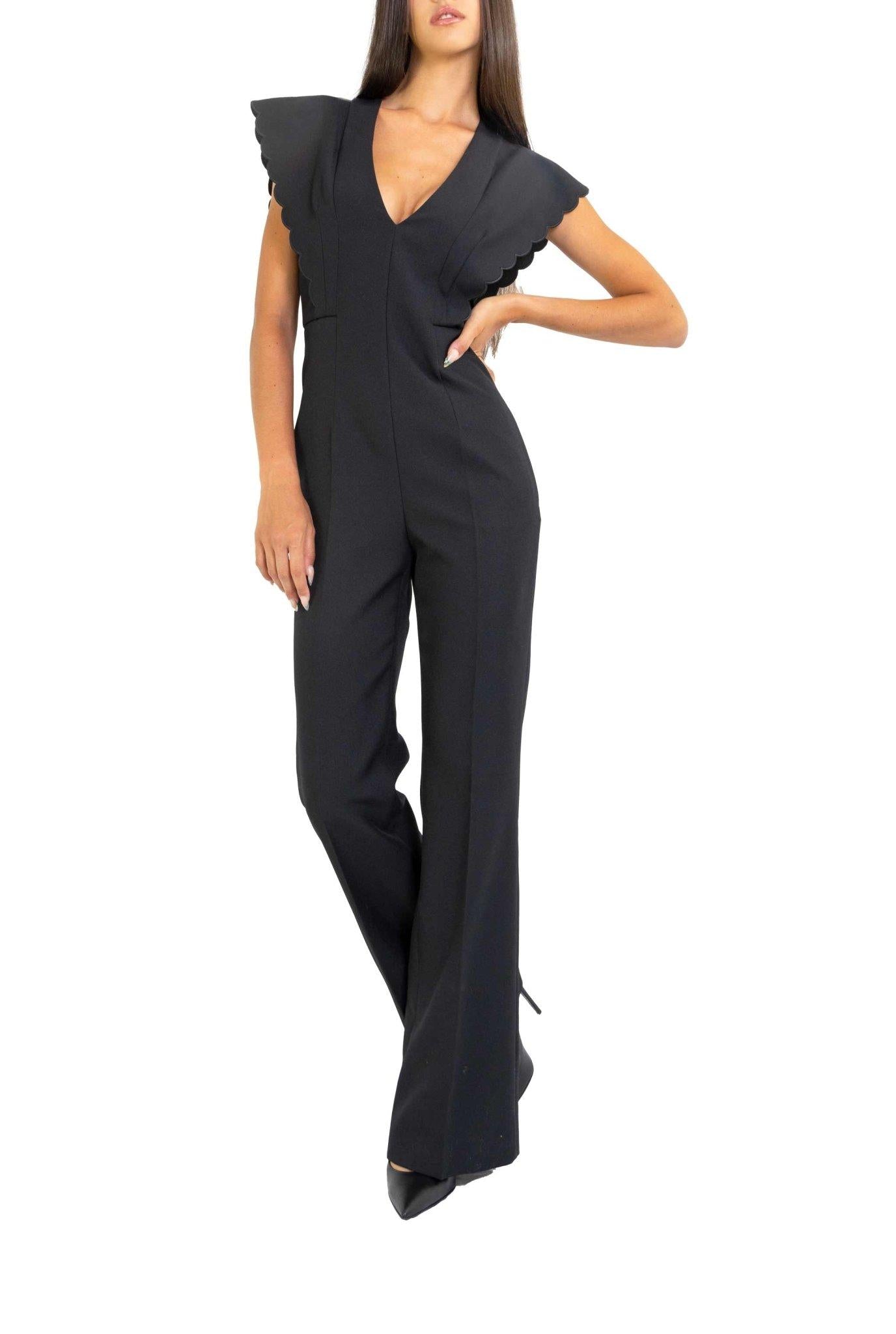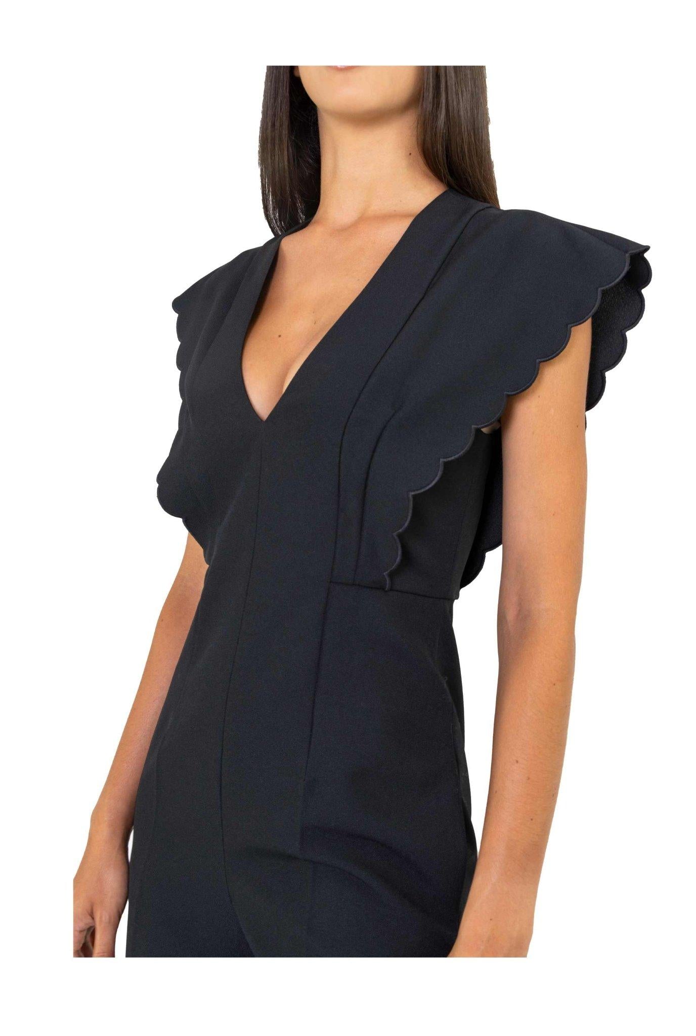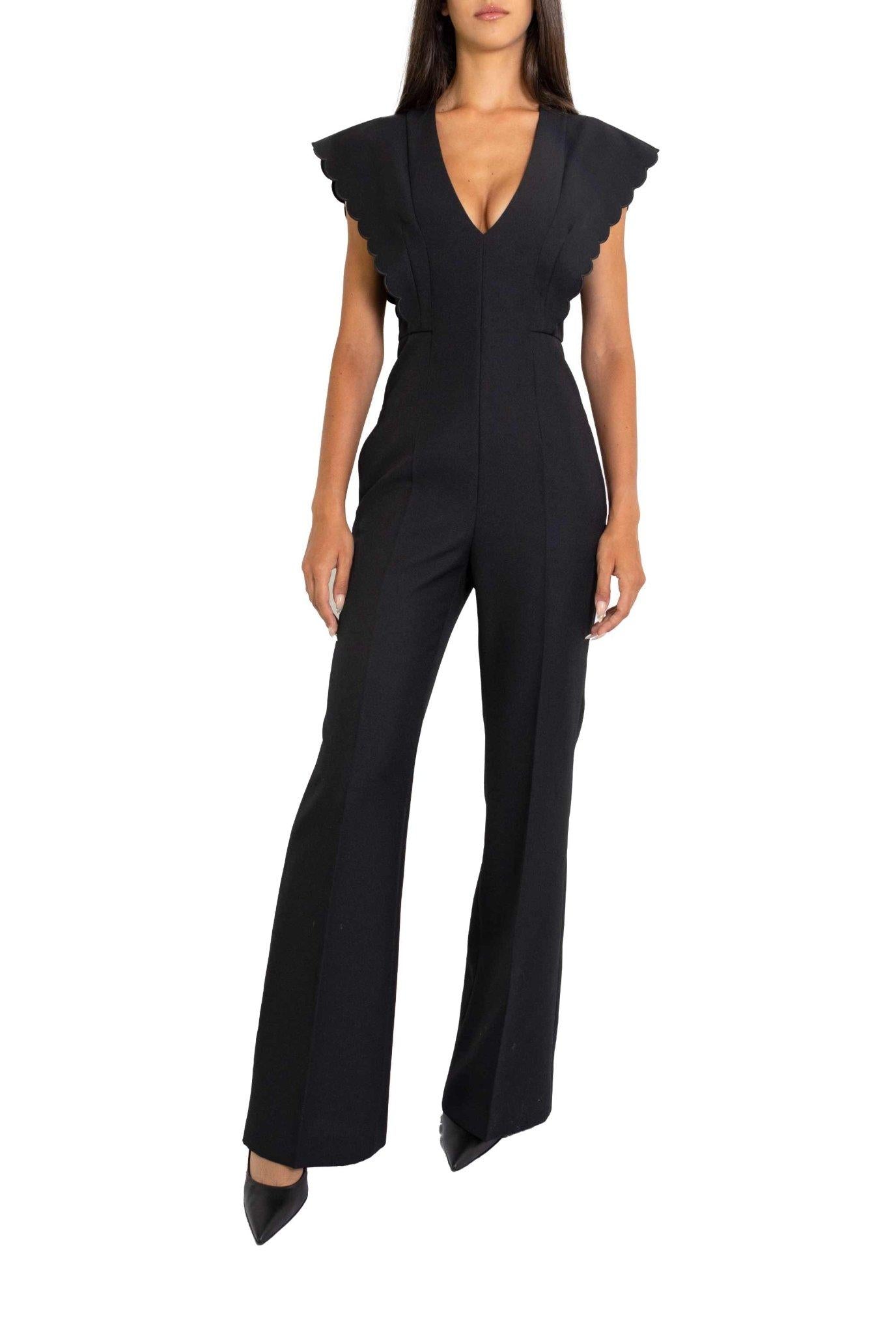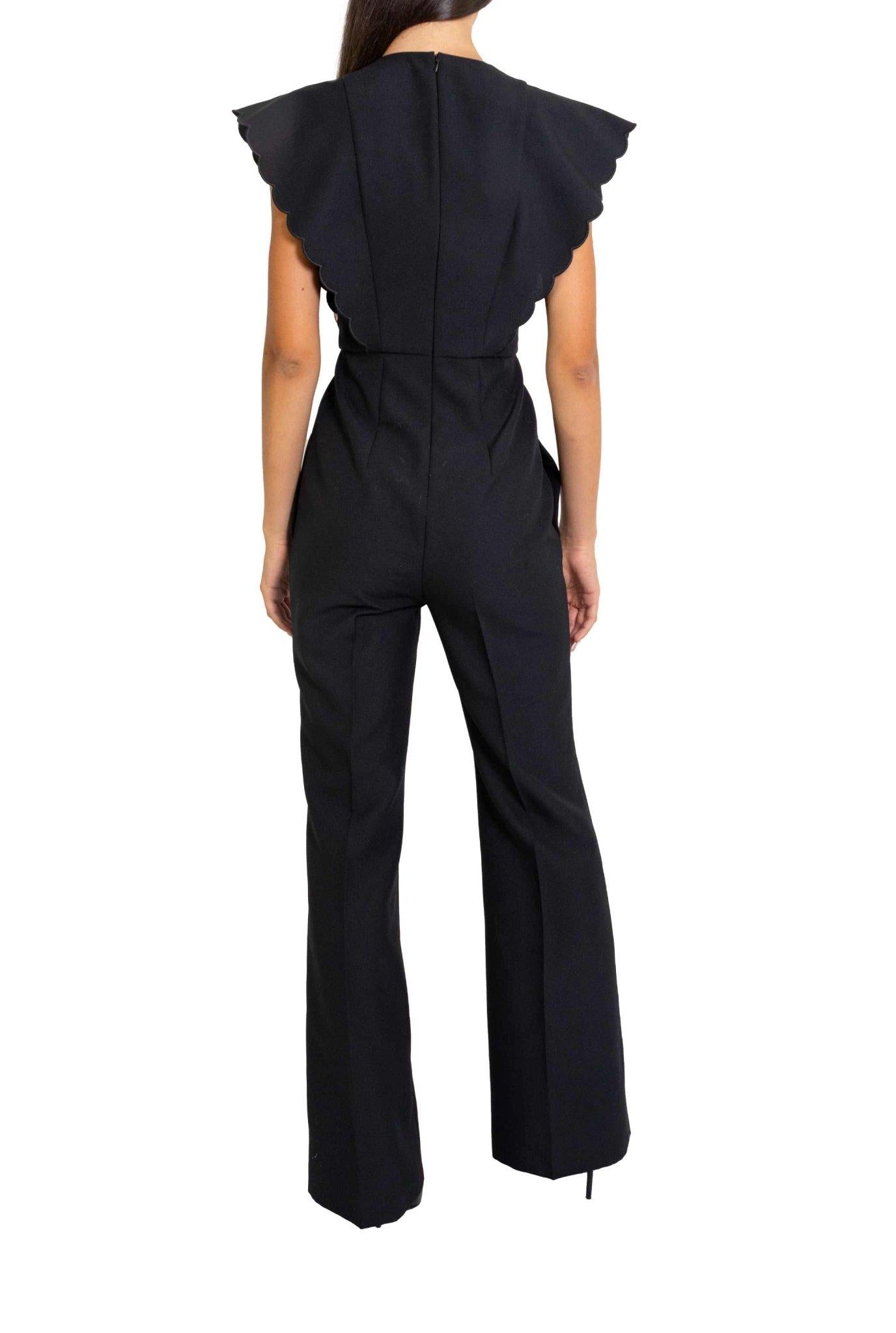 Tuta senza maniche, aderente in vita, mentre scende più morbida sui fianchi, volant con profilo smerlato creano effetto maniche ad aletta, pieghe sul pantalone per un tocco sartoriale, chiusura sul retro con zip a scomparsa