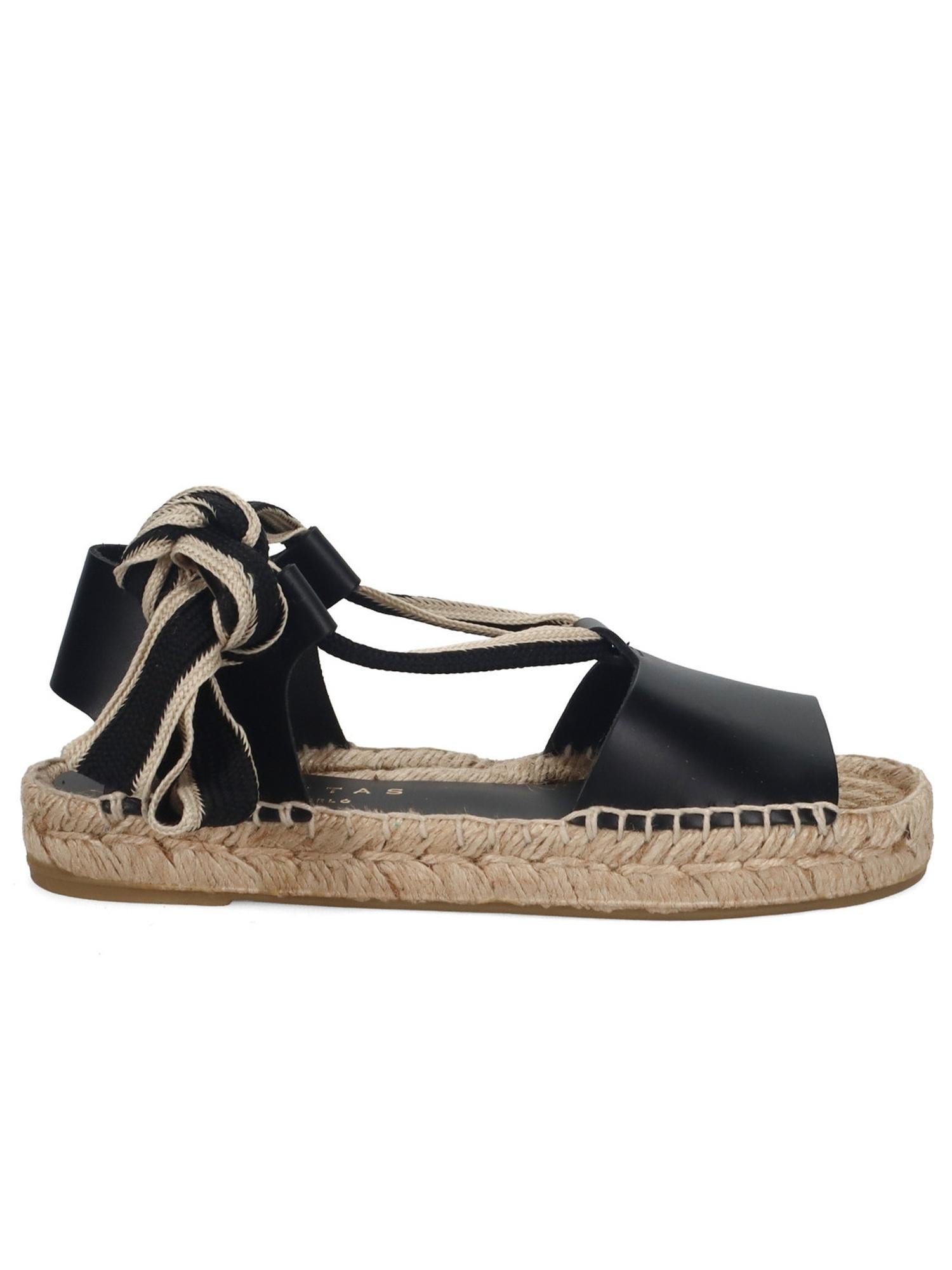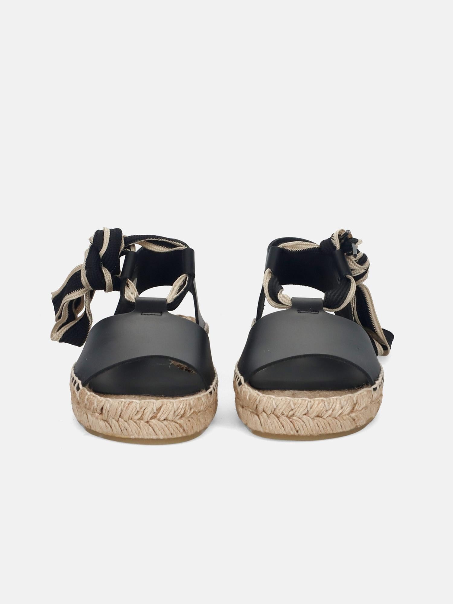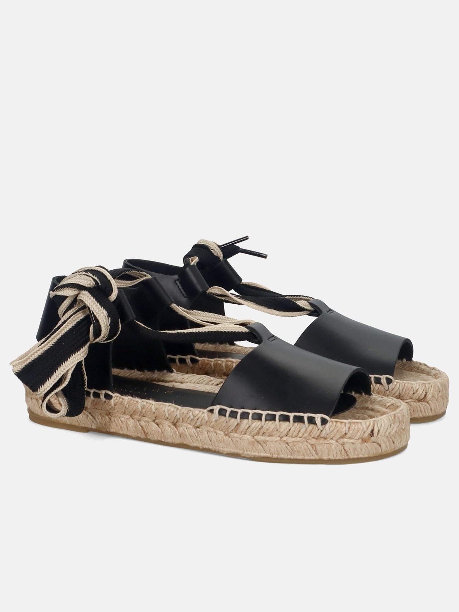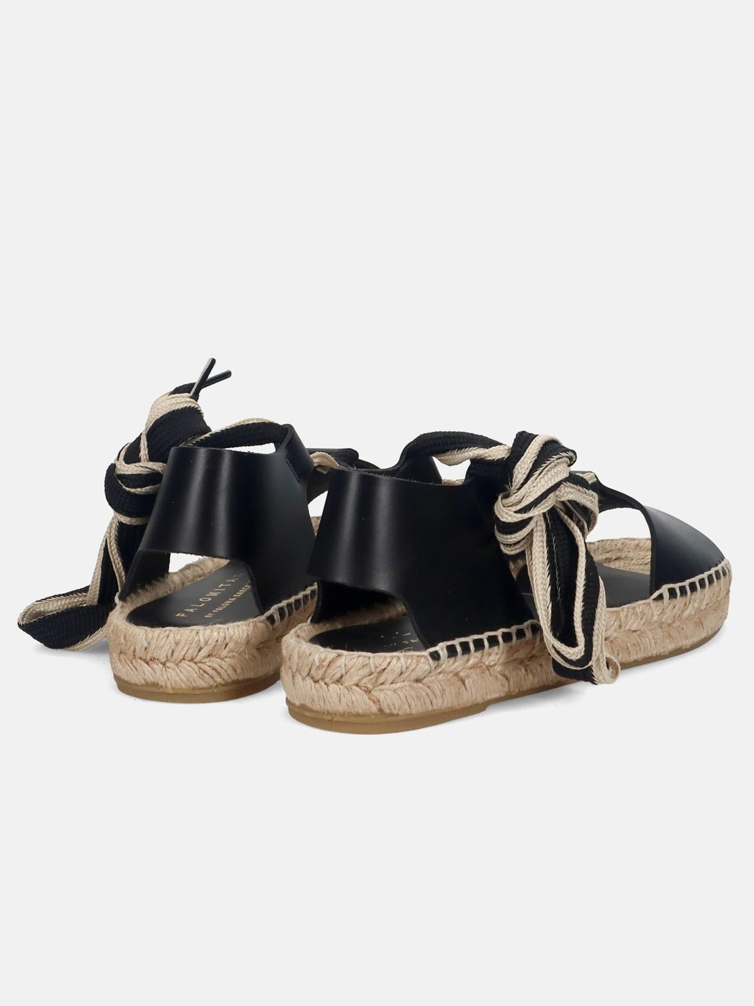 Sandalo in pelle nera di PALOMITAS, punta aperta, suola in cuoio e corda, chiusura con lacci.