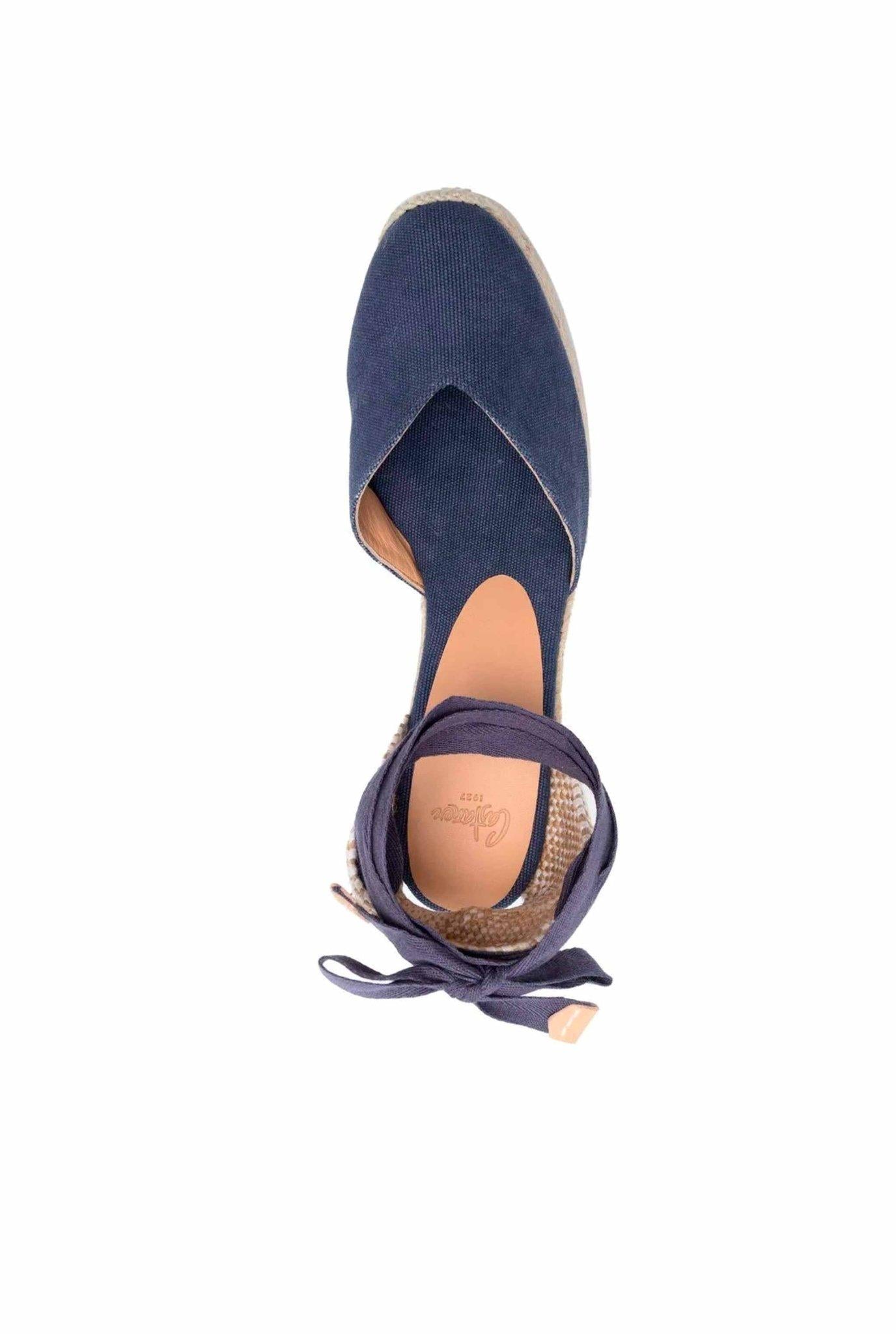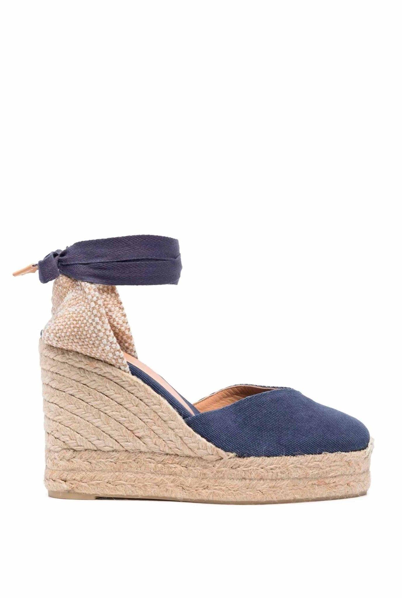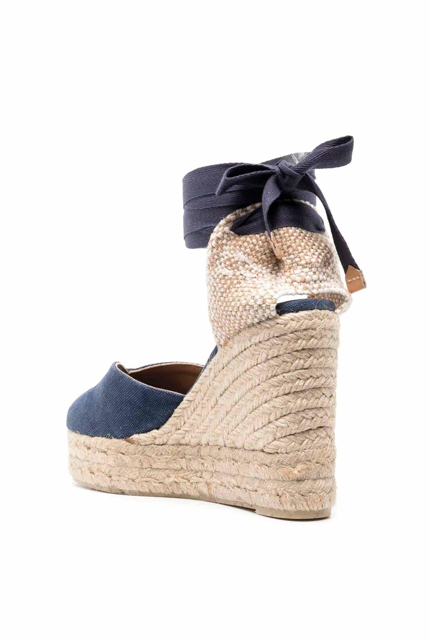 Design a forma di v, cinturino in tessuto intrecciato sul tallone, chiusura con cinturino alla caviglia, punta tonda e chiusa.