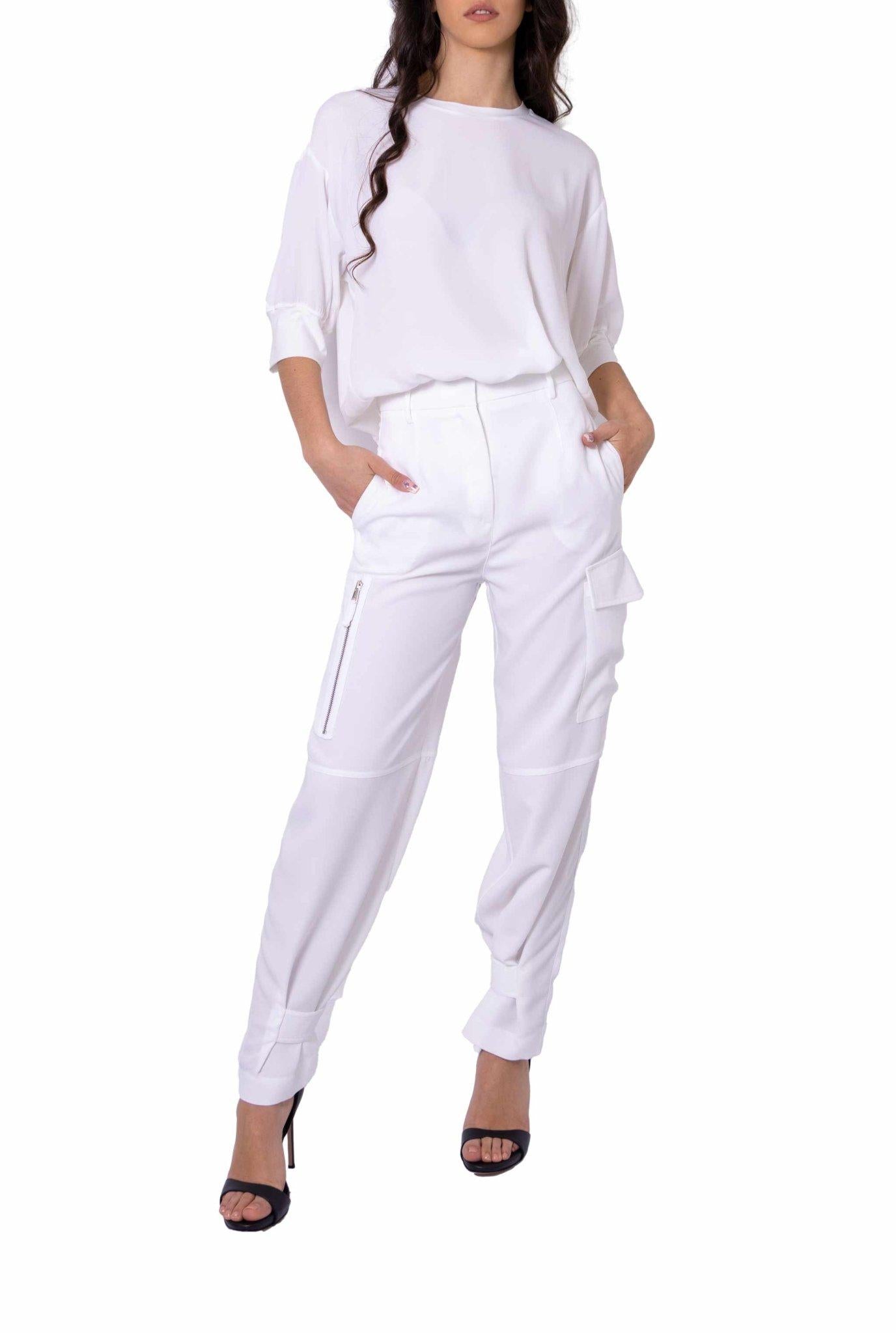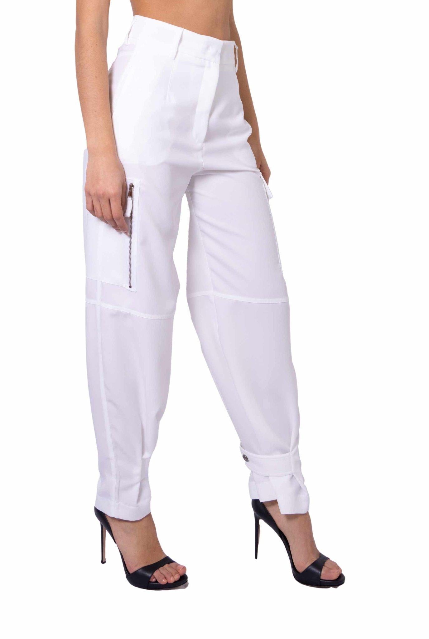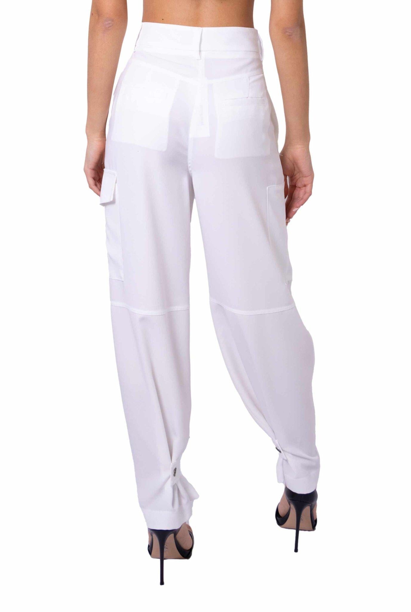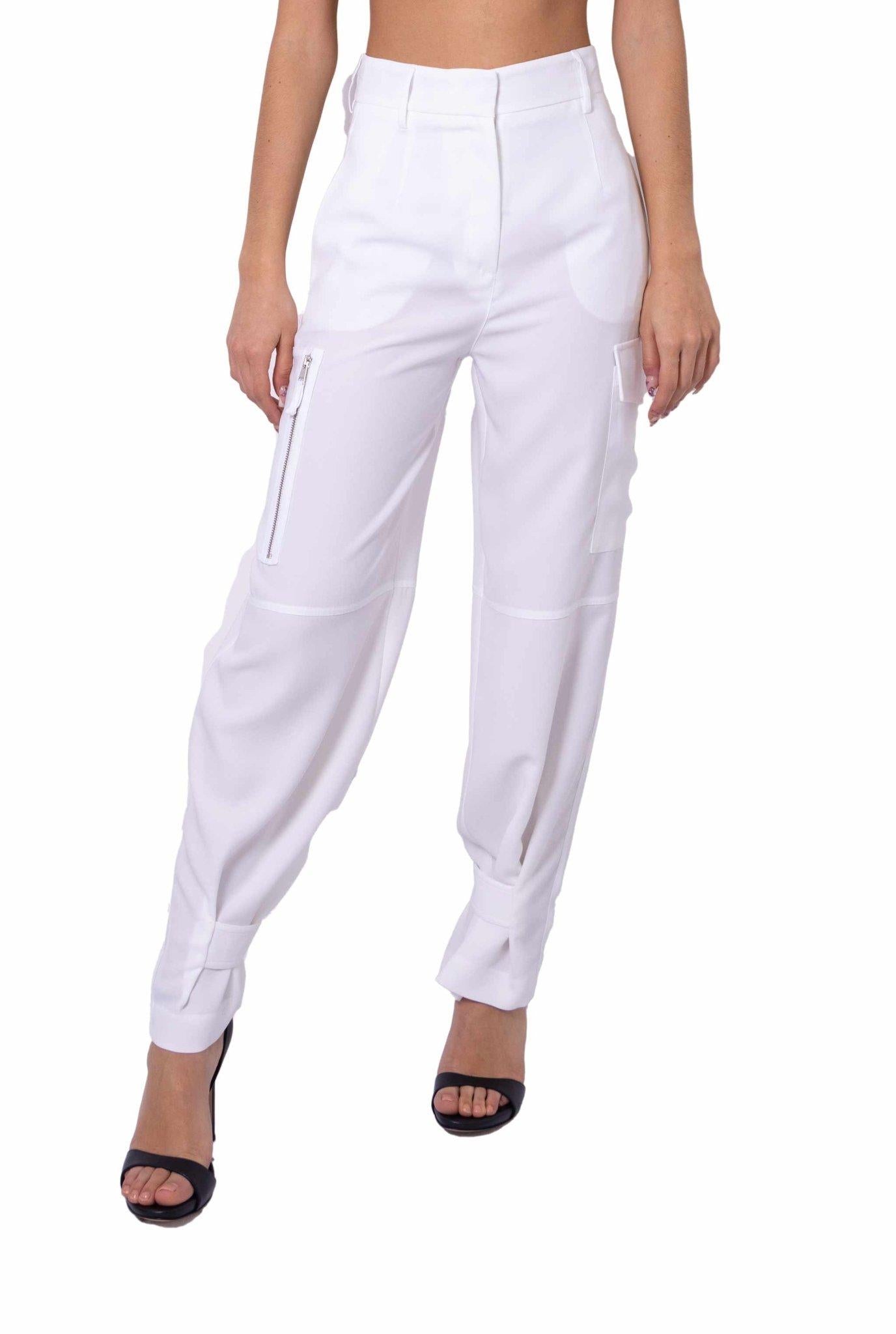 Modello a vita alta, tasche laterali, staffa a fondo gamba per stringere il fondo.