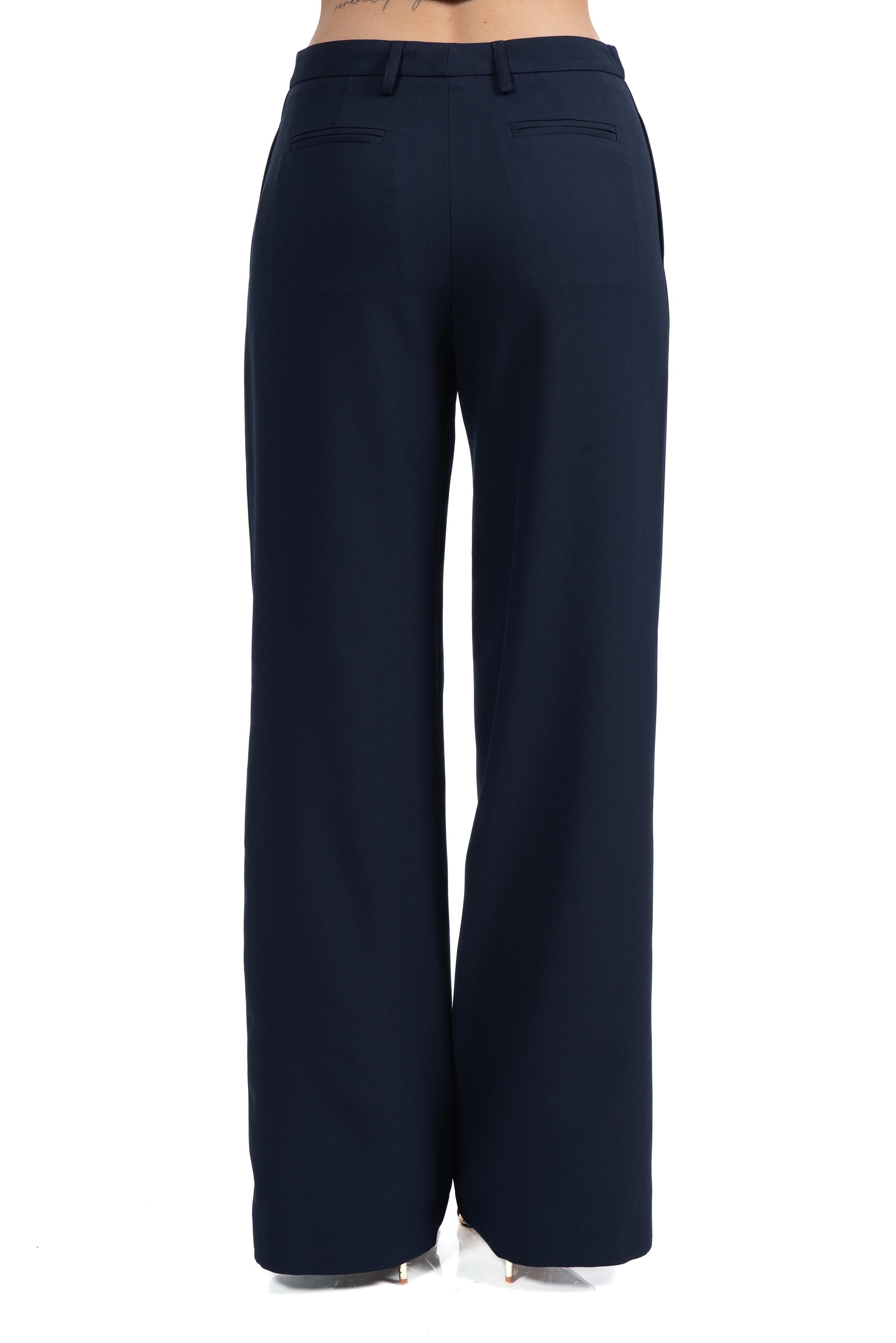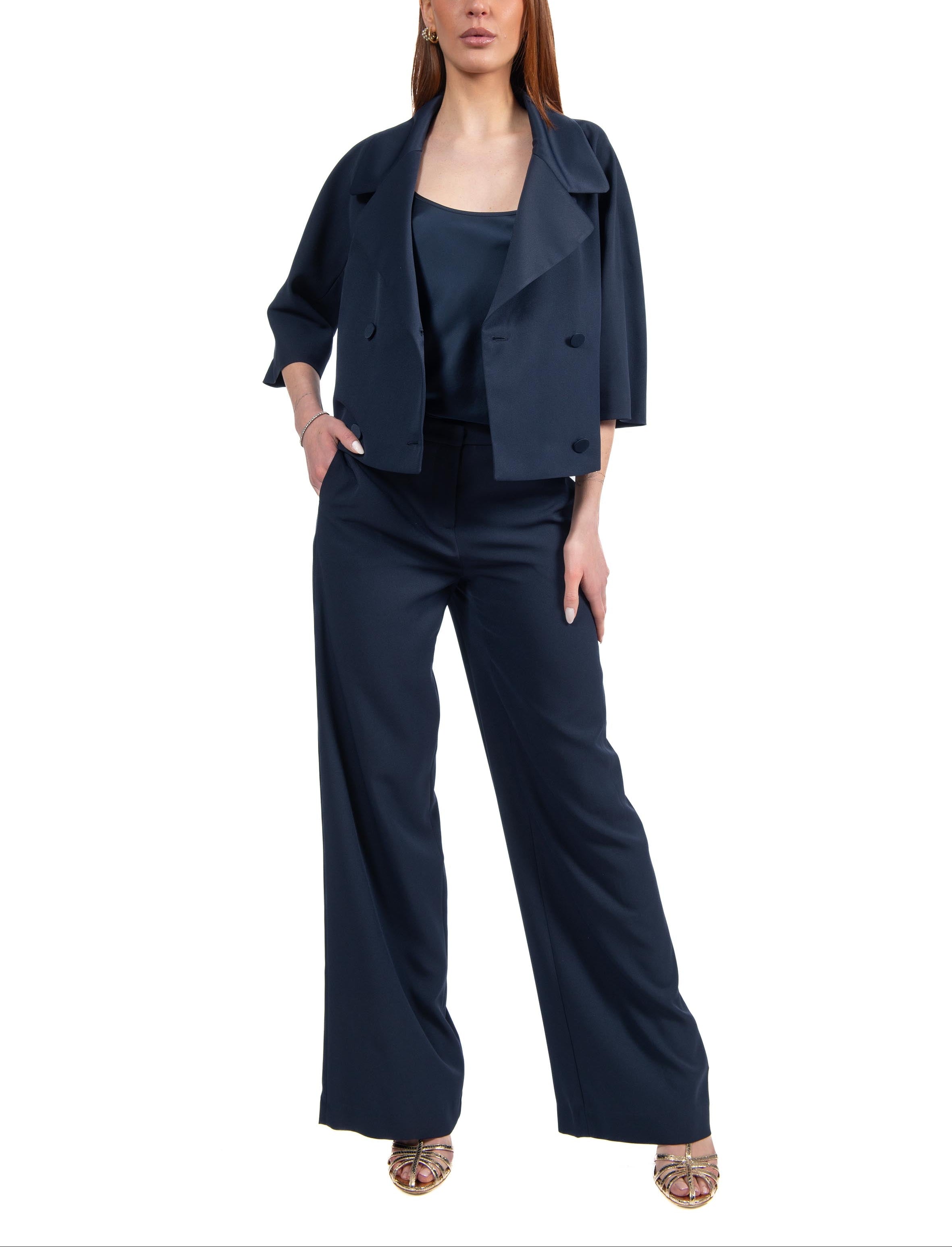 Tailleur doppiopetto blu di ALICE MILLER, giacca crop, bottoni foderati, rever in raso, manica 3/4, pantalone palazzo, chiusura con zip e gancio a scomparsa, passanti in vita.