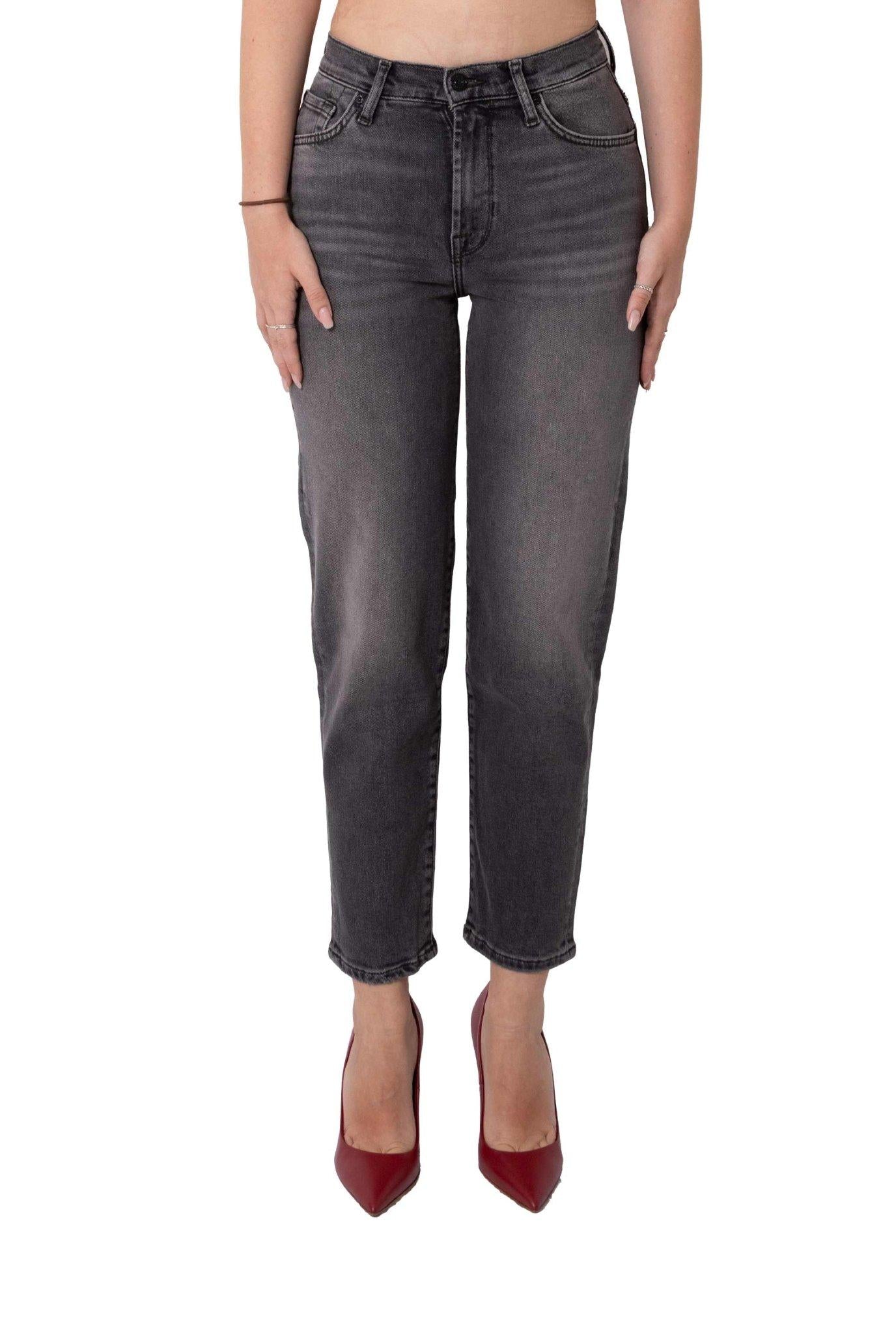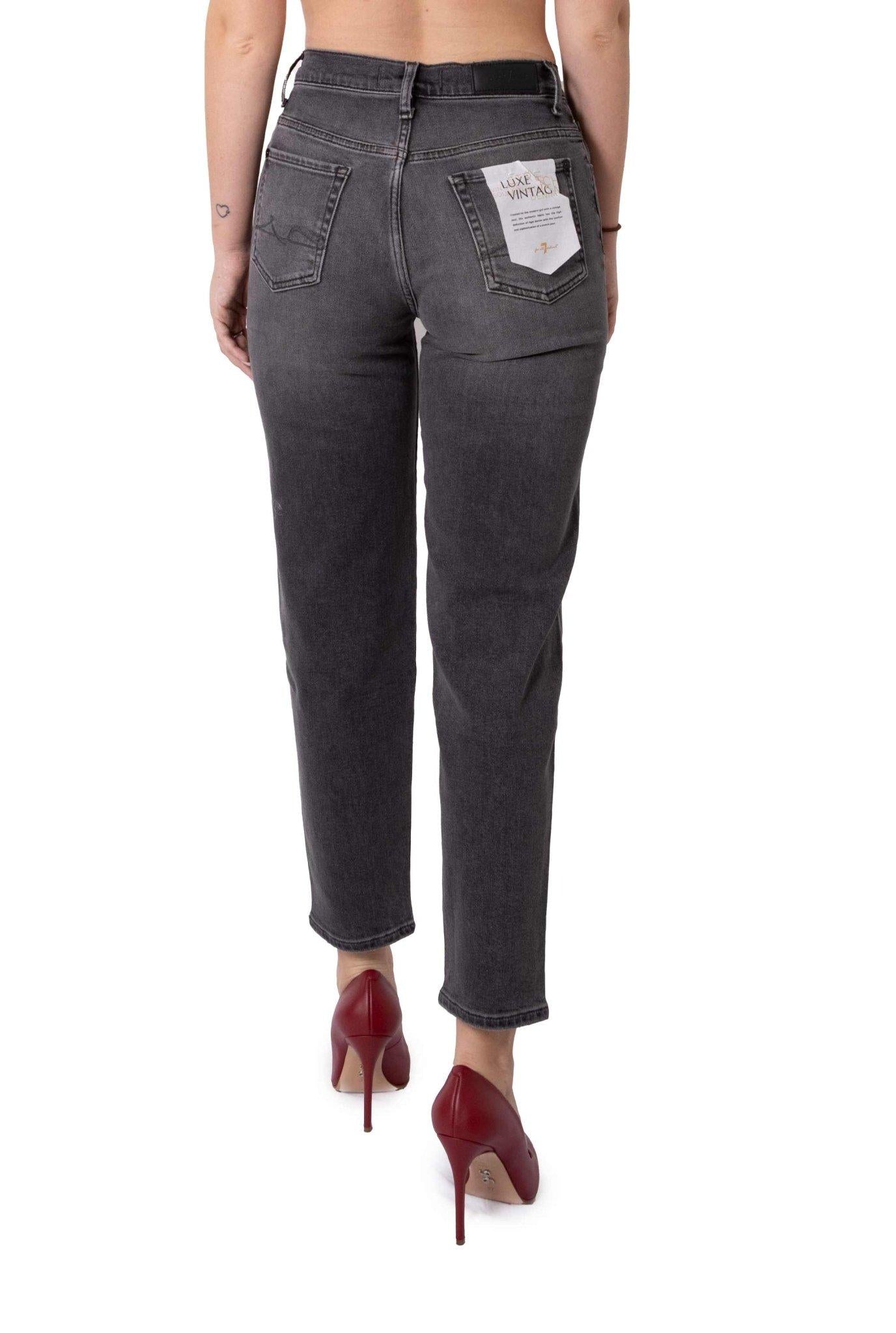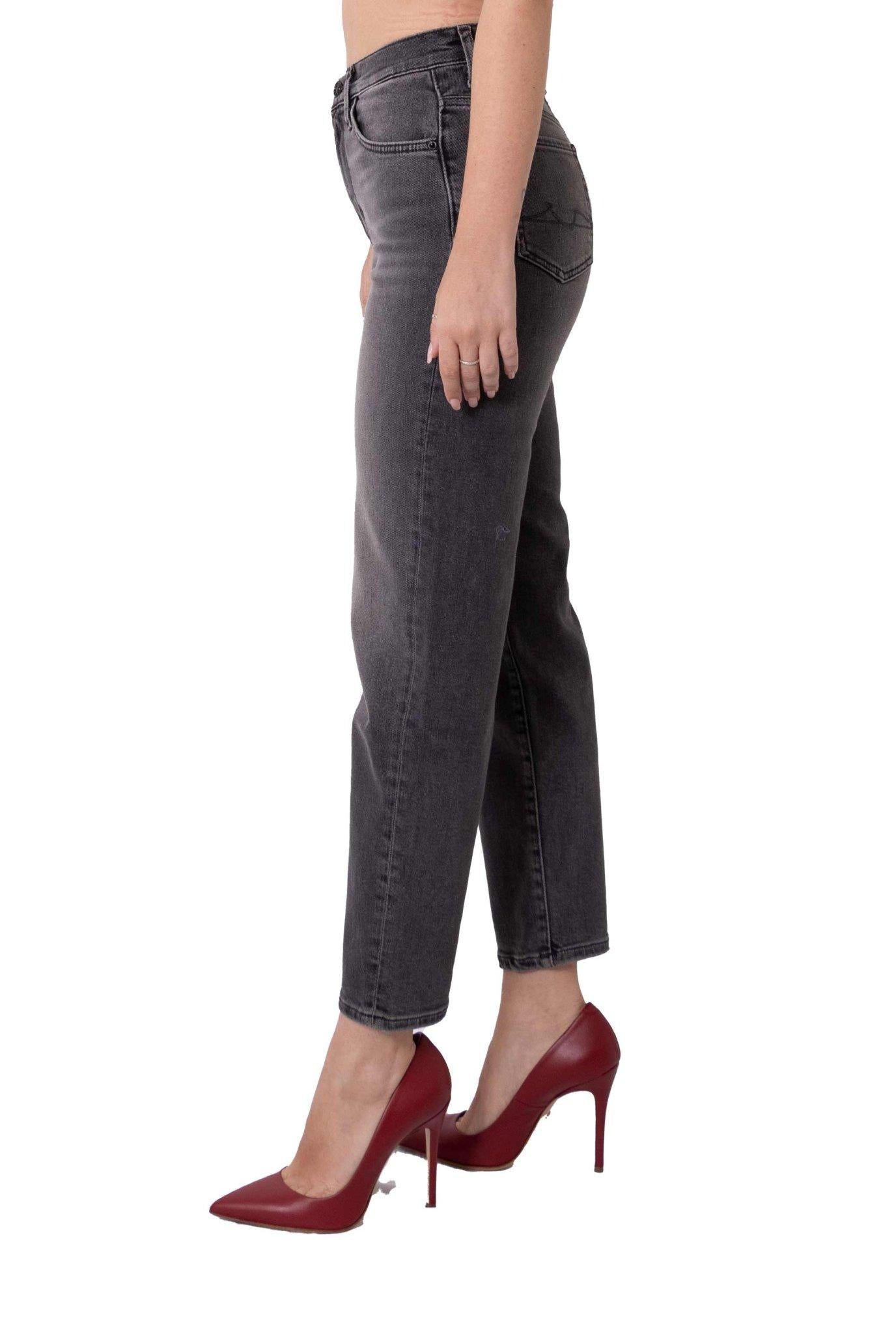 Modello a vita alta, modello simile mom jeans, gamba affusolata e rilassata e vita alta. Tessuto elasticizzato