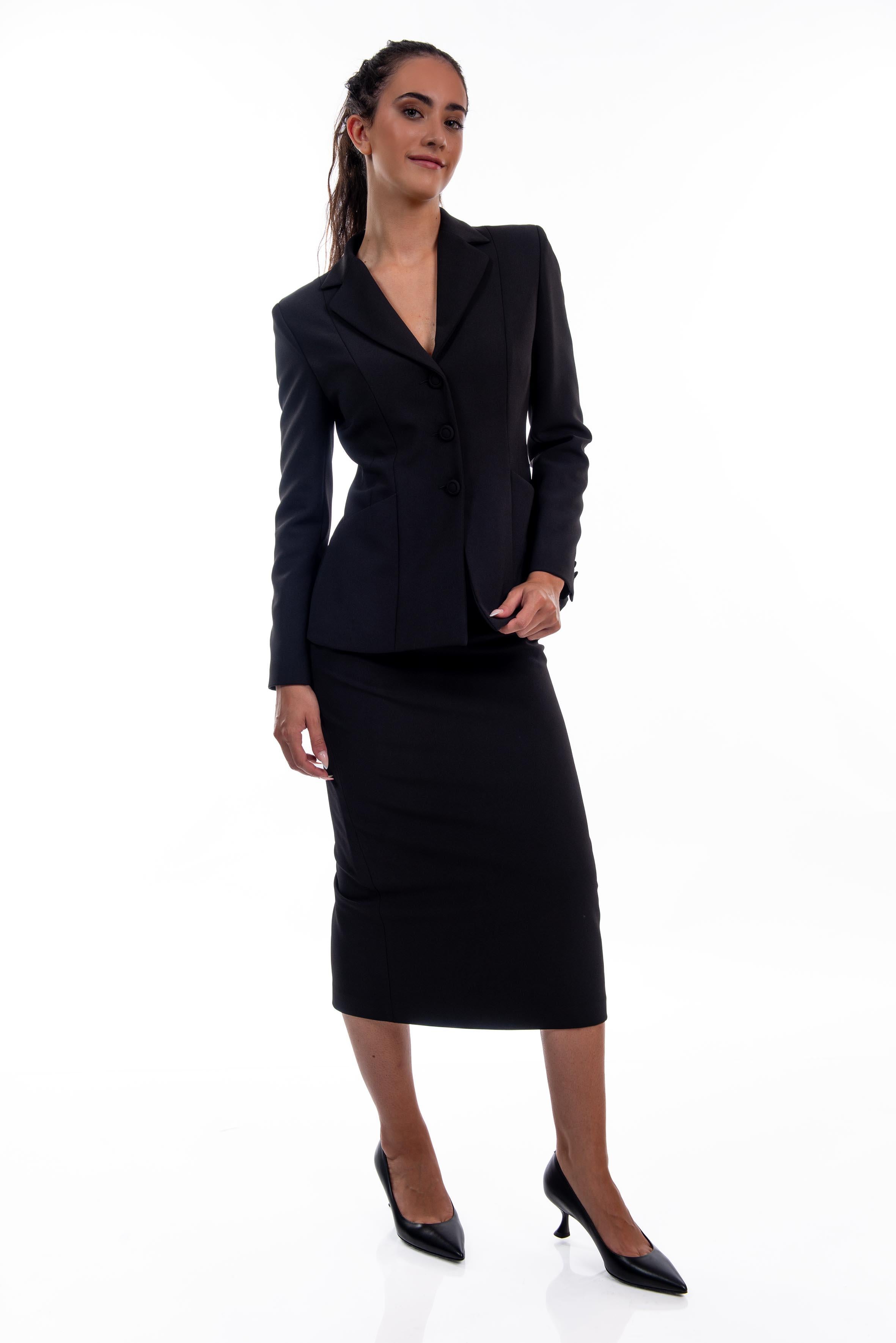 Gonna longuette nera di  Alice Miller, modello a vita alta, cucitura a vista, spacco posteriore, lunghezza midi, aderente.