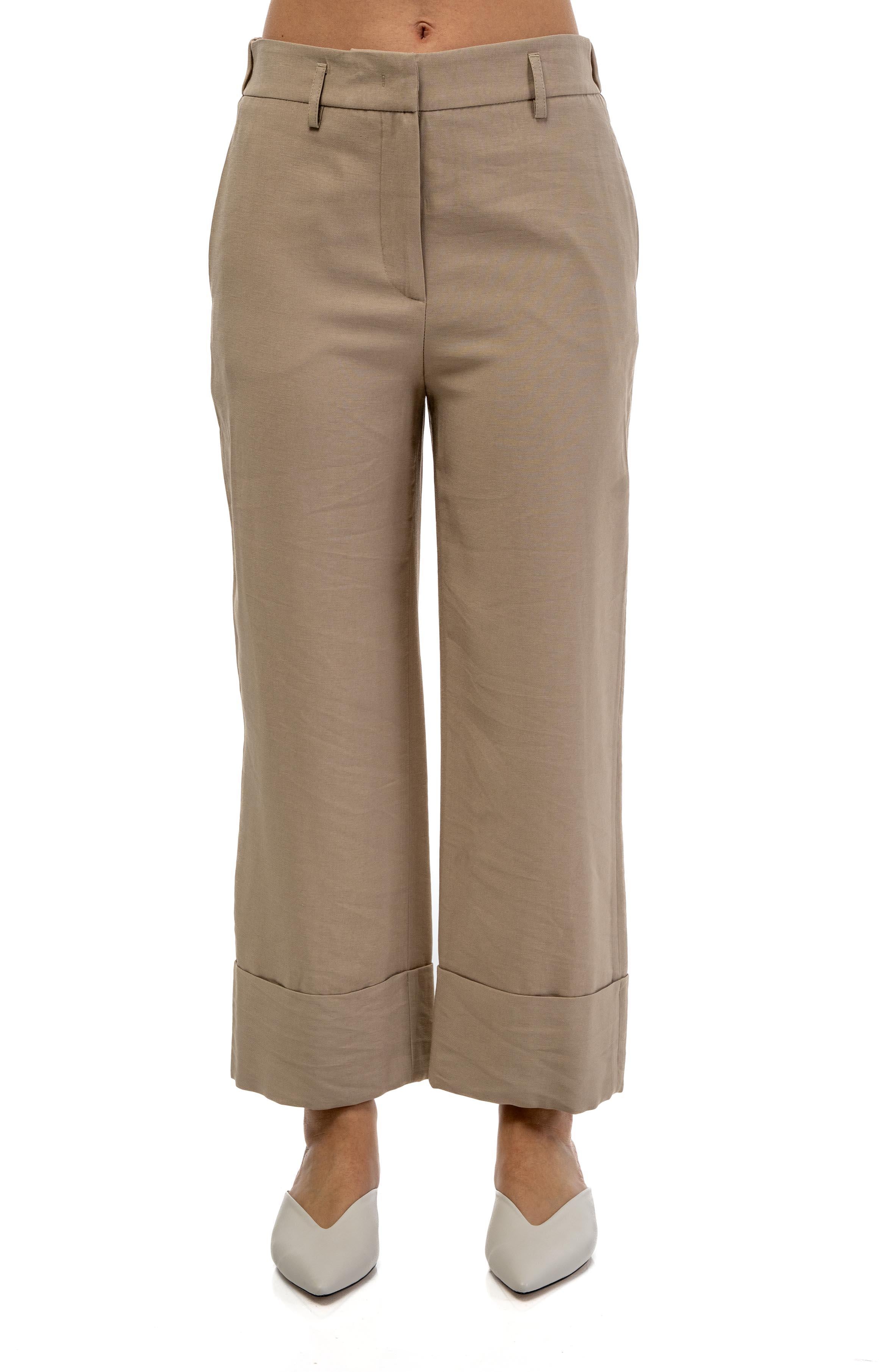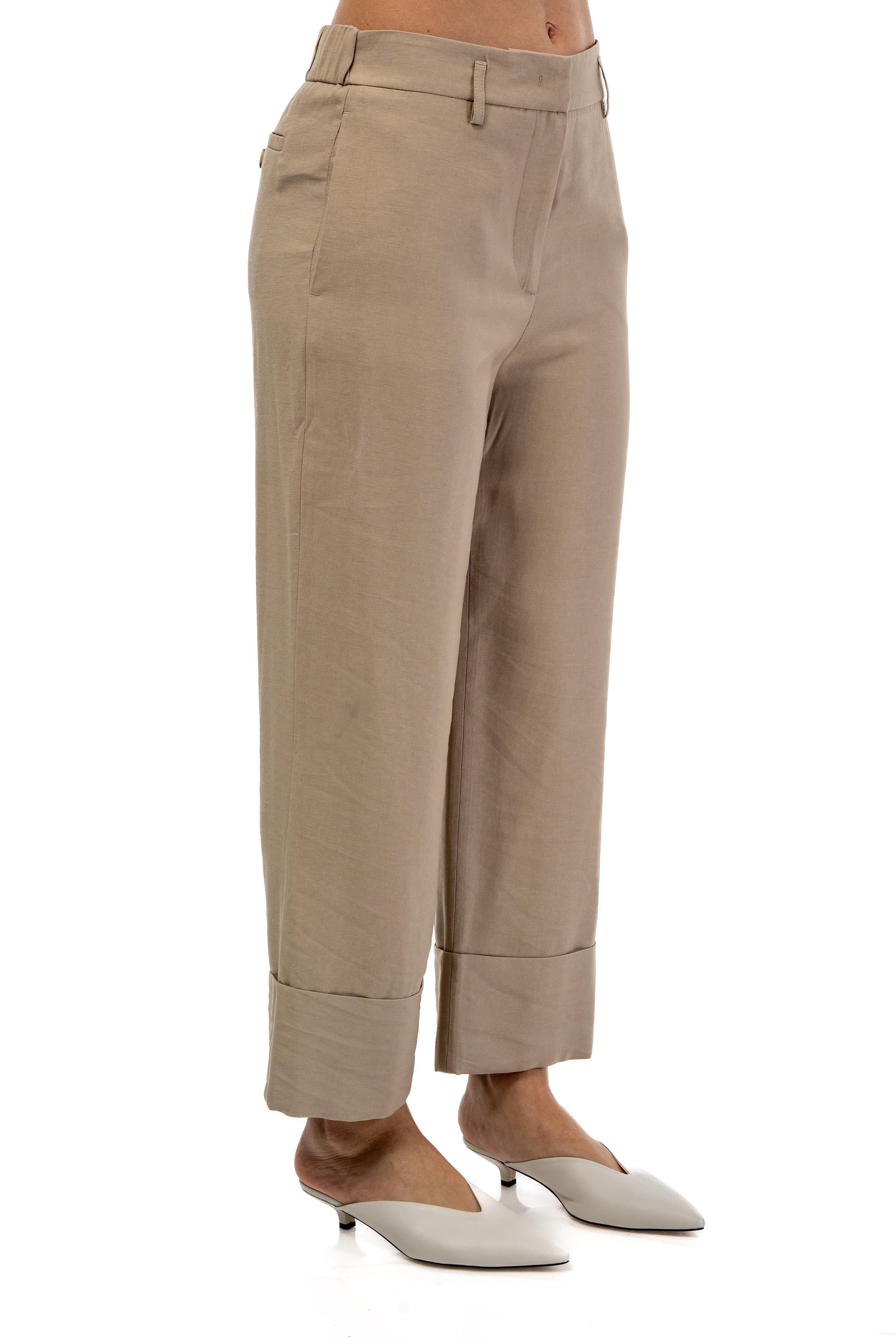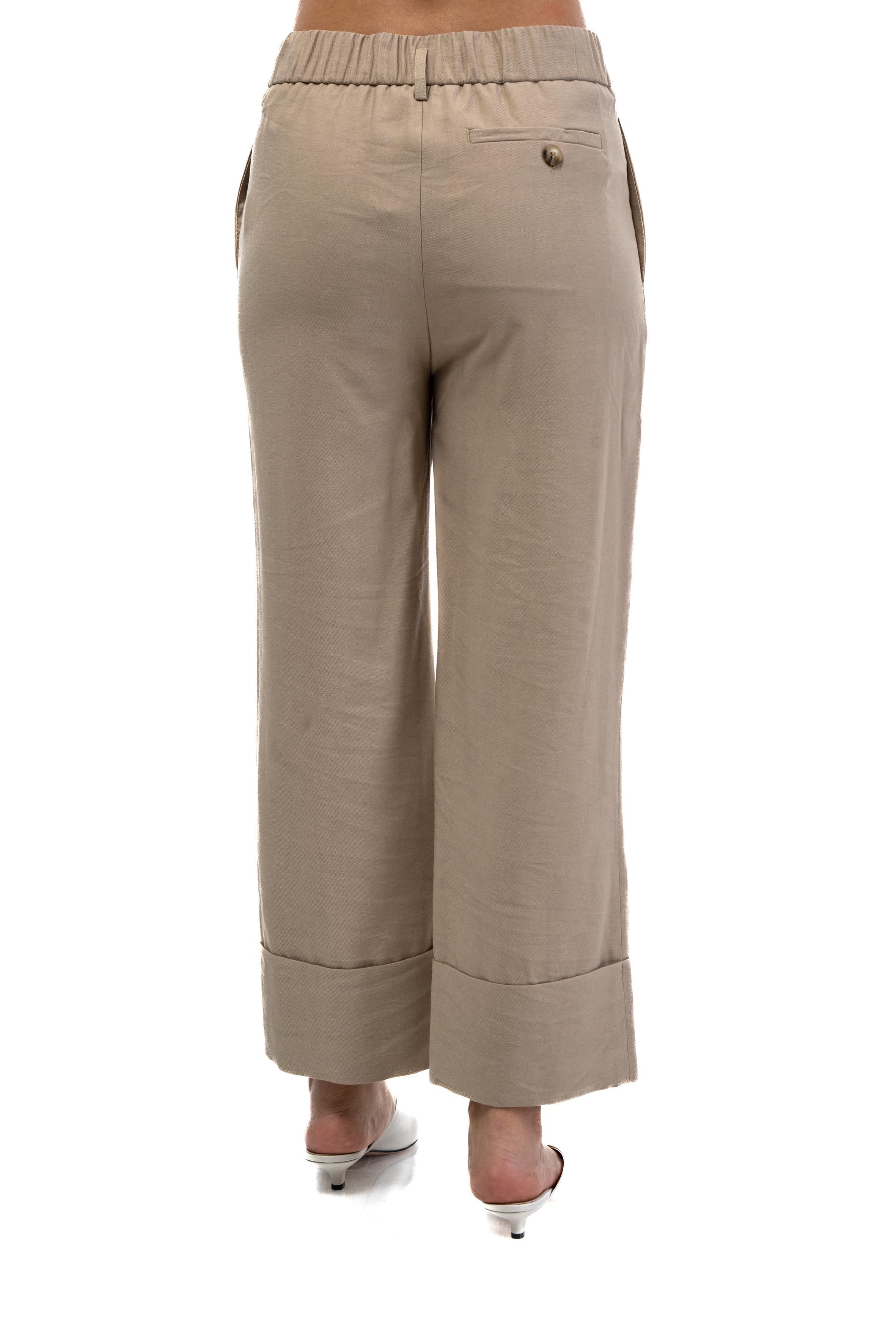 Pantalone beige di ALICE MILLER, dalla vita alta, gamba morbida, e dritta con risvolto, chiusura con zip e gancio a scomparsa, passanti per cintura con tasche, tasche a filetto con bottone sul retro. elastico nel retro della vita.