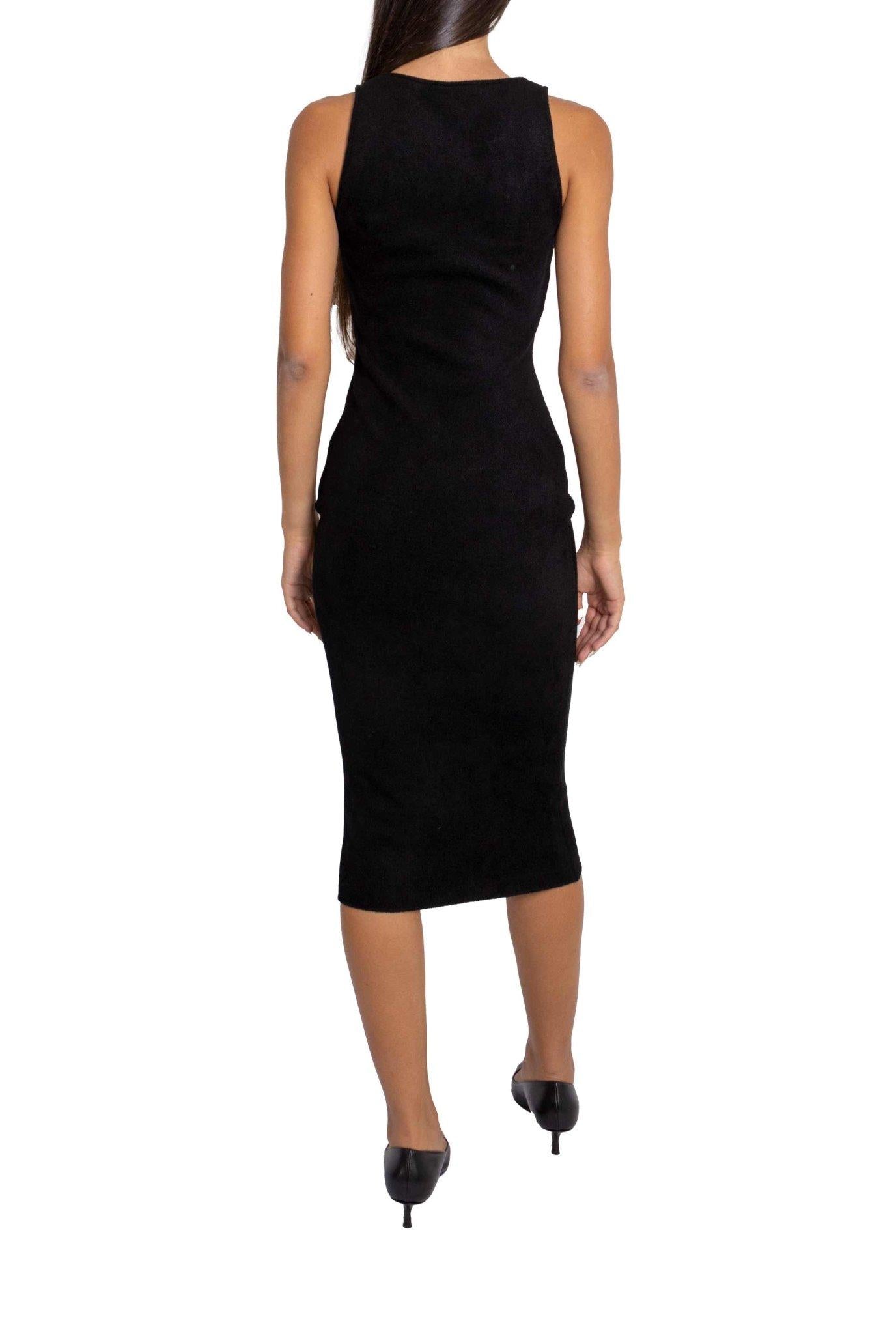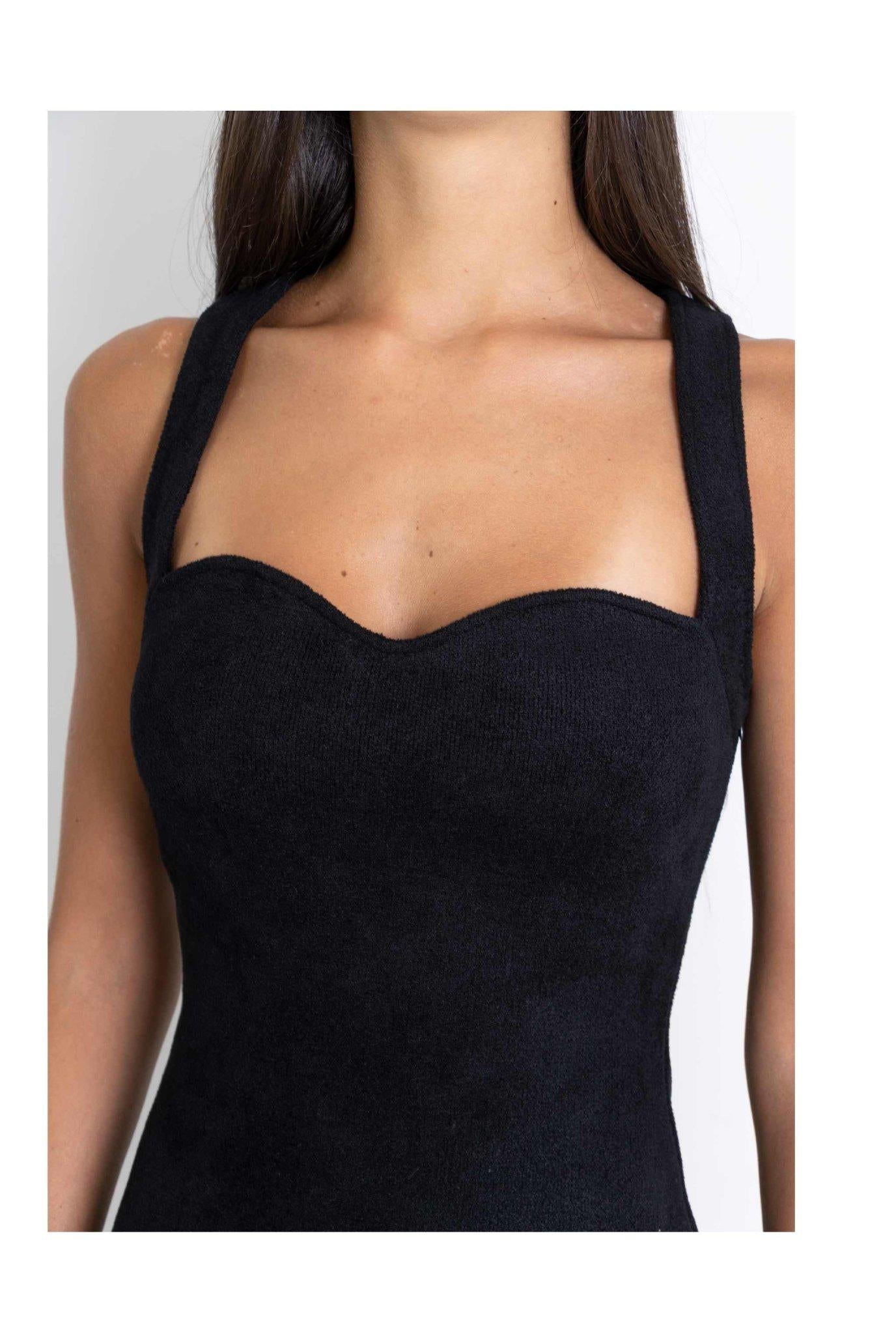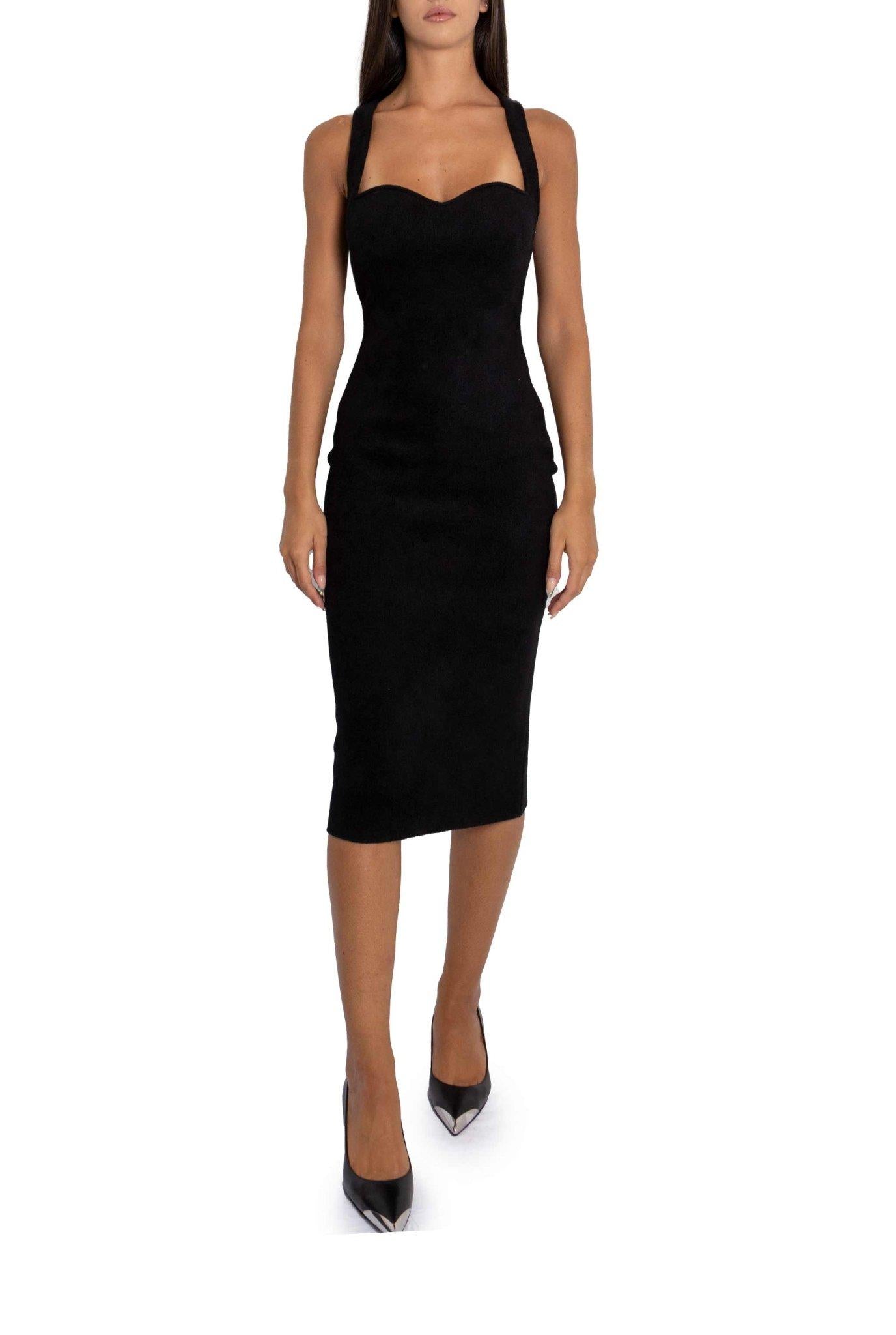 Scollo a cuore, spalline larghe, senza maniche, lunghezza midi, chiusura laterale con cerniera design aderente.