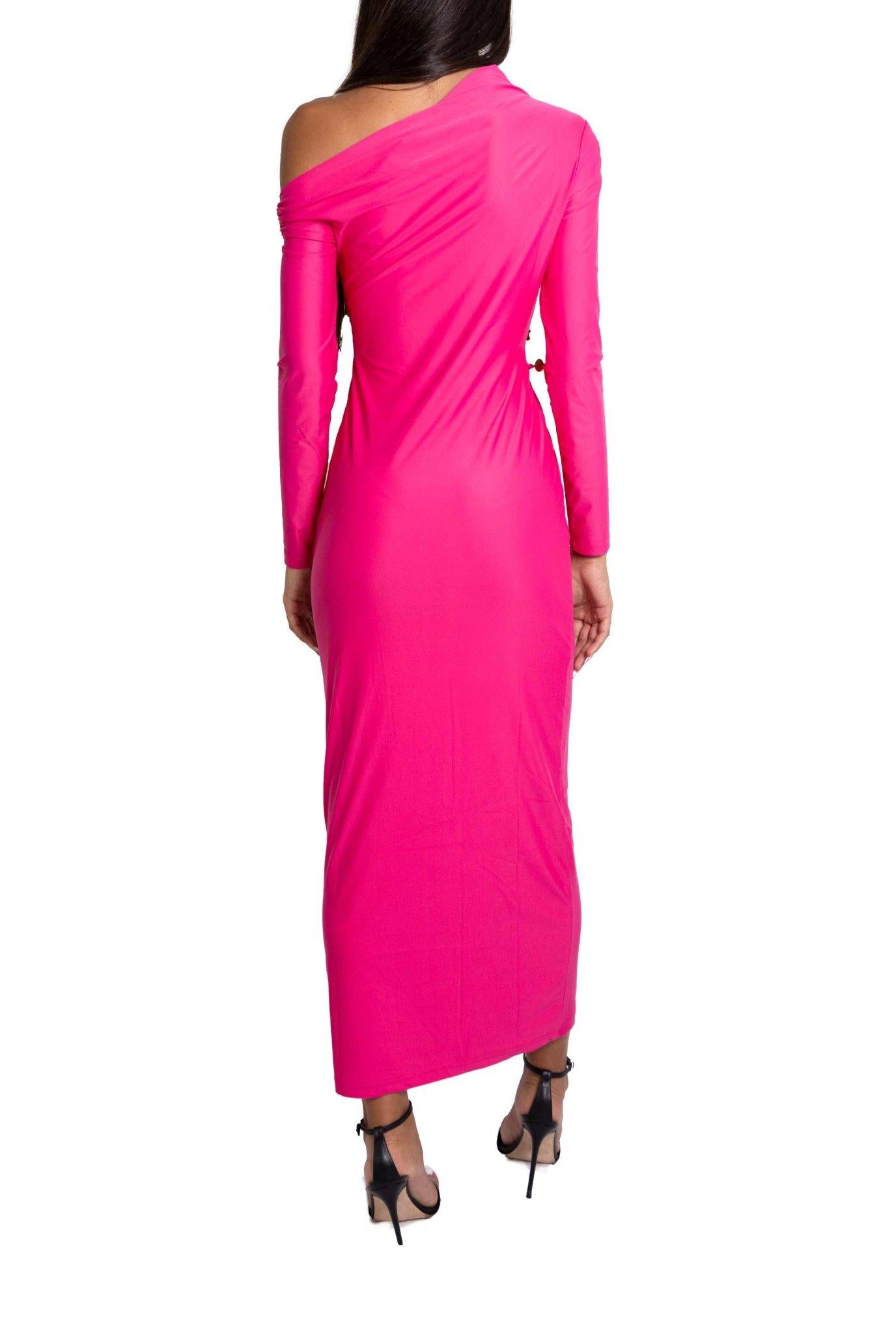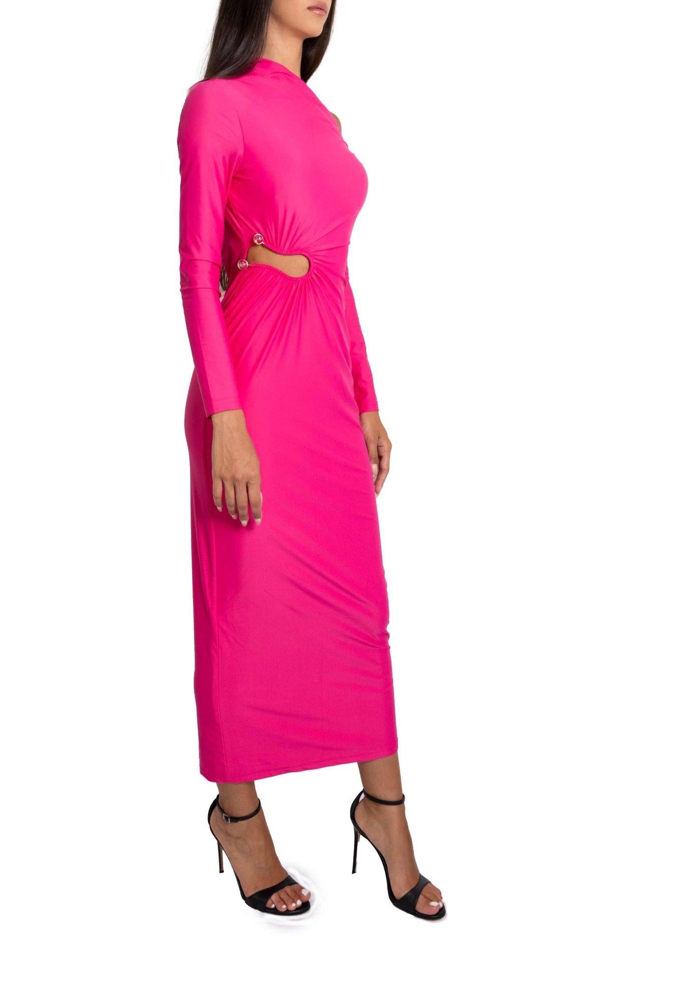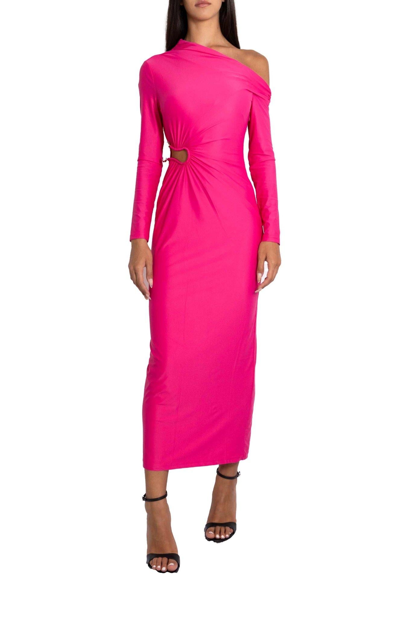 Modello scollo asimmetrico monospalla, maniche lunghe, dettaglio cut-out con gioiello laterale, orlo dritto. Design aderente.