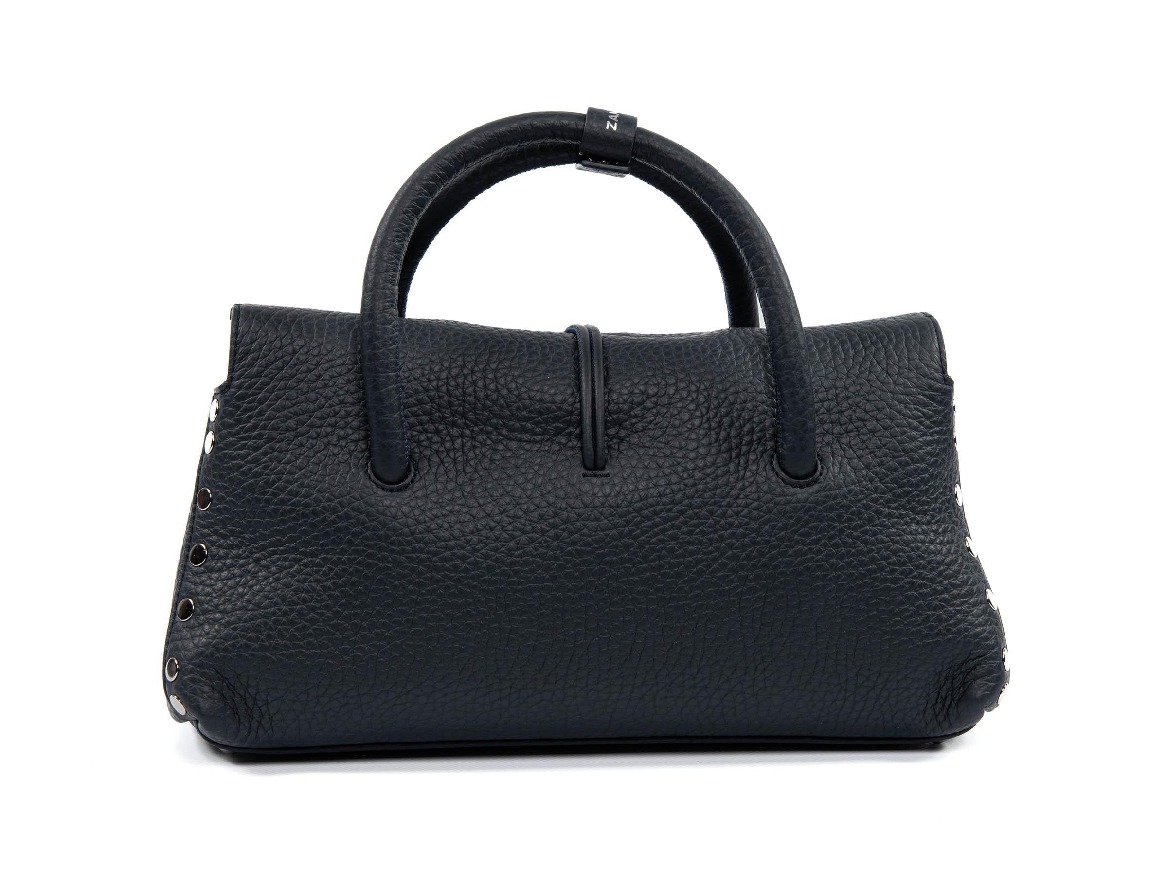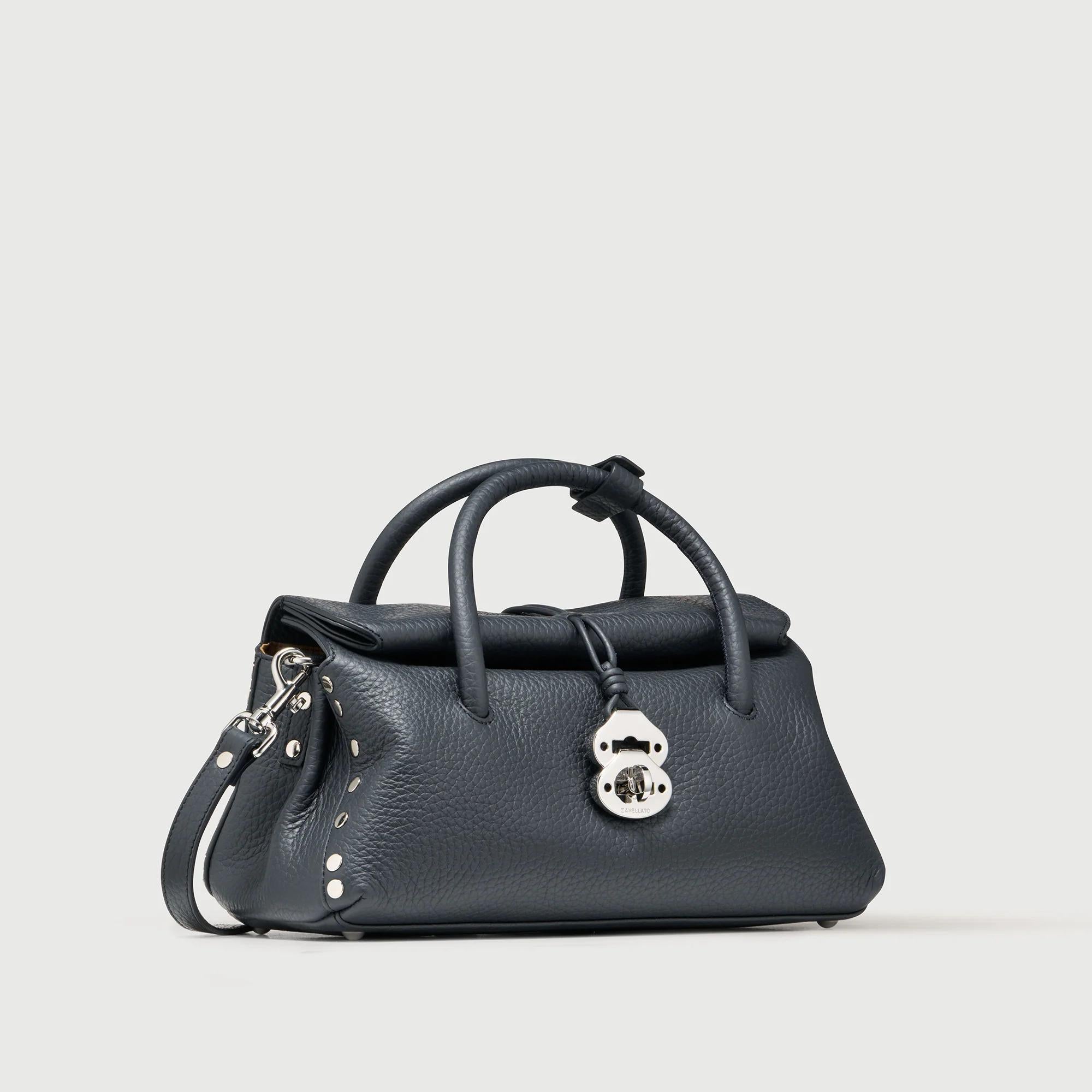 Borsa Zanellato Postina® Dotta Centauro S blu in pelle granata, caratterizzata dalla chiusura roll-top magnetica e dai nastrini tubolari con fibbia twist-lock in metallo argentato. Manici tubolari con cinturino d'unione. Tracolla removibile e regolabile. Interno foderato in twill con due scomparti, una tasca a toppa e una con zip.