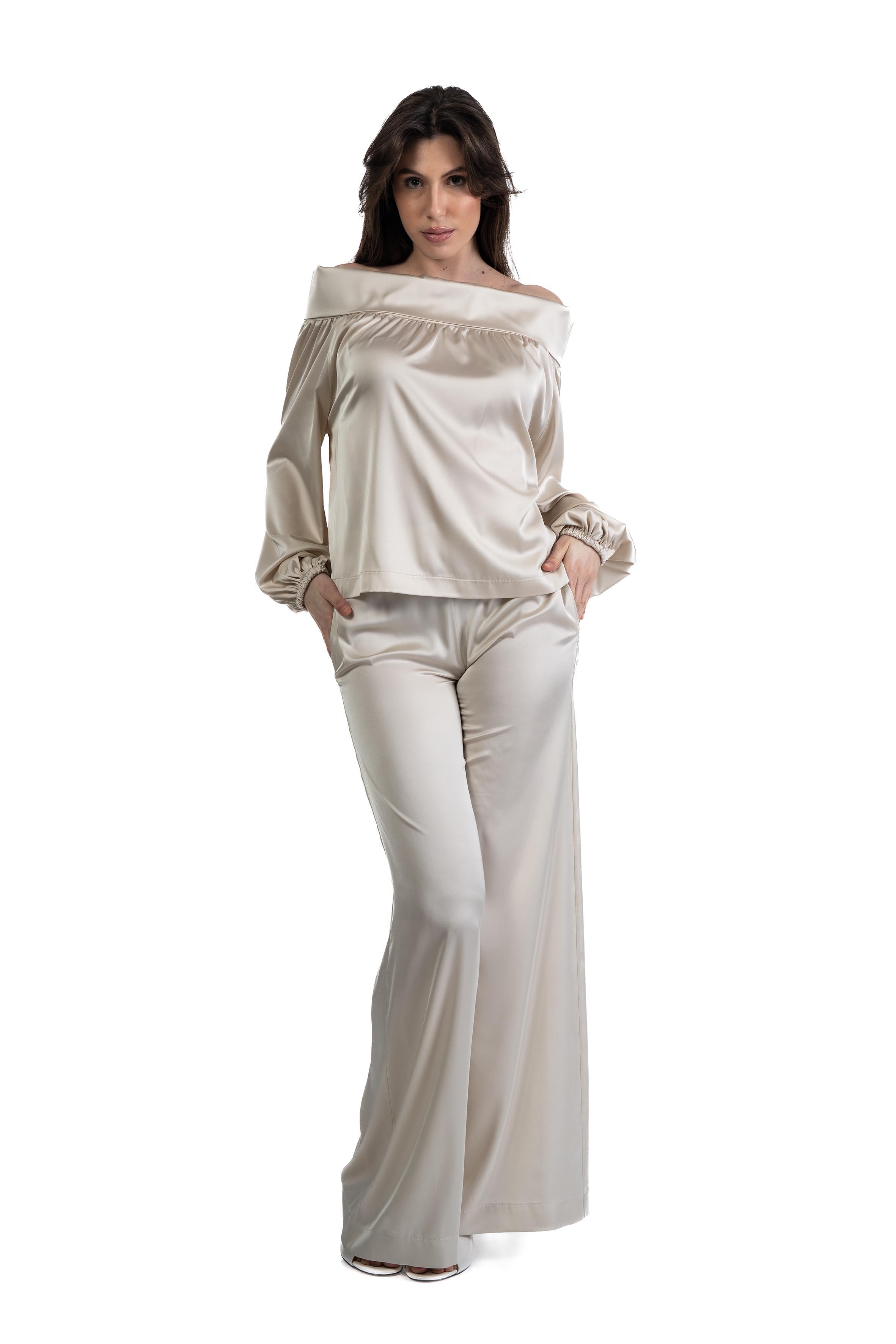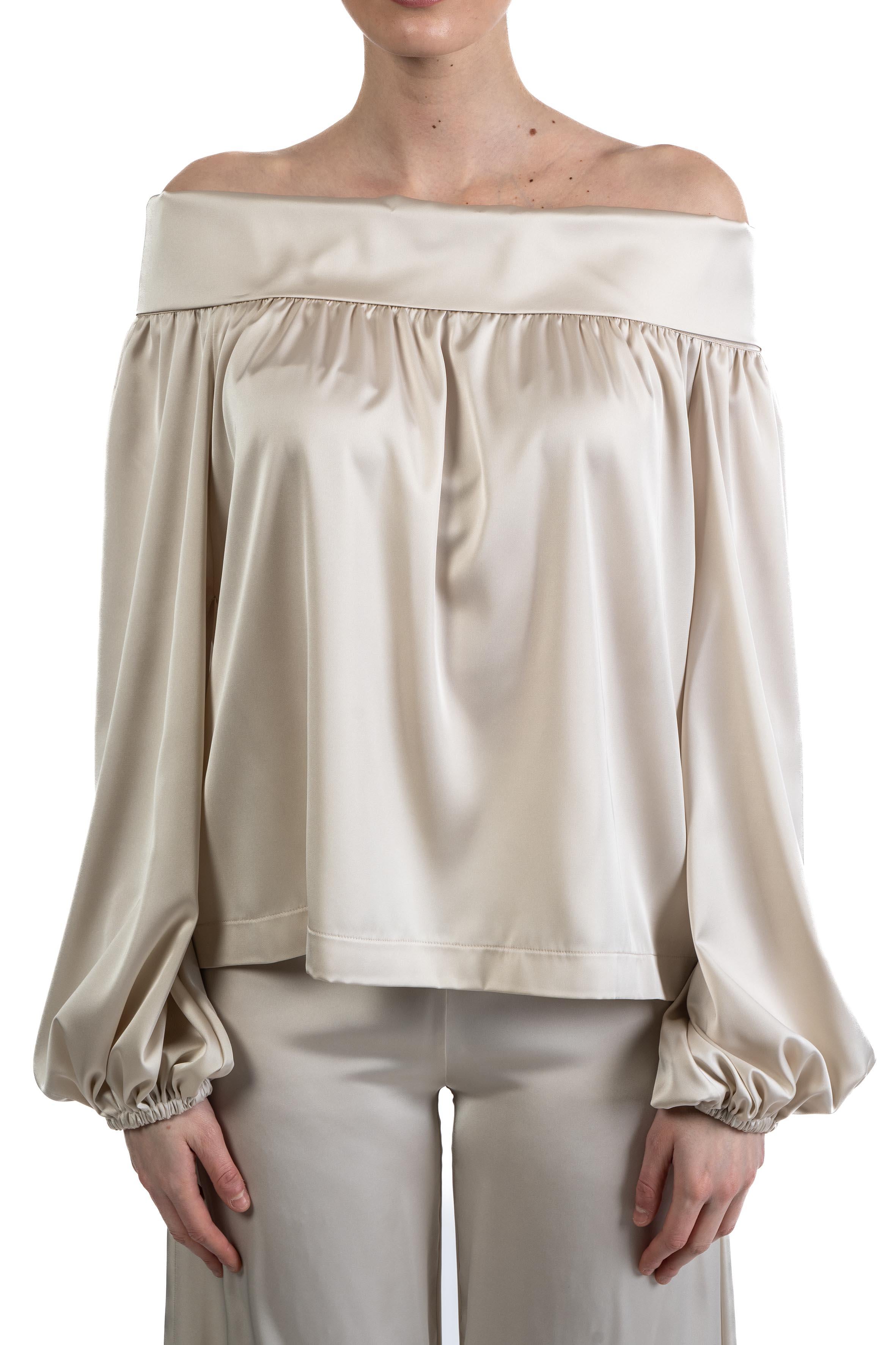 Blusa in raso fluido Beige di D'EXTERIOR, scollo a barca, manica lunga, lunghezza su i fianchi, vestibilità regolare.