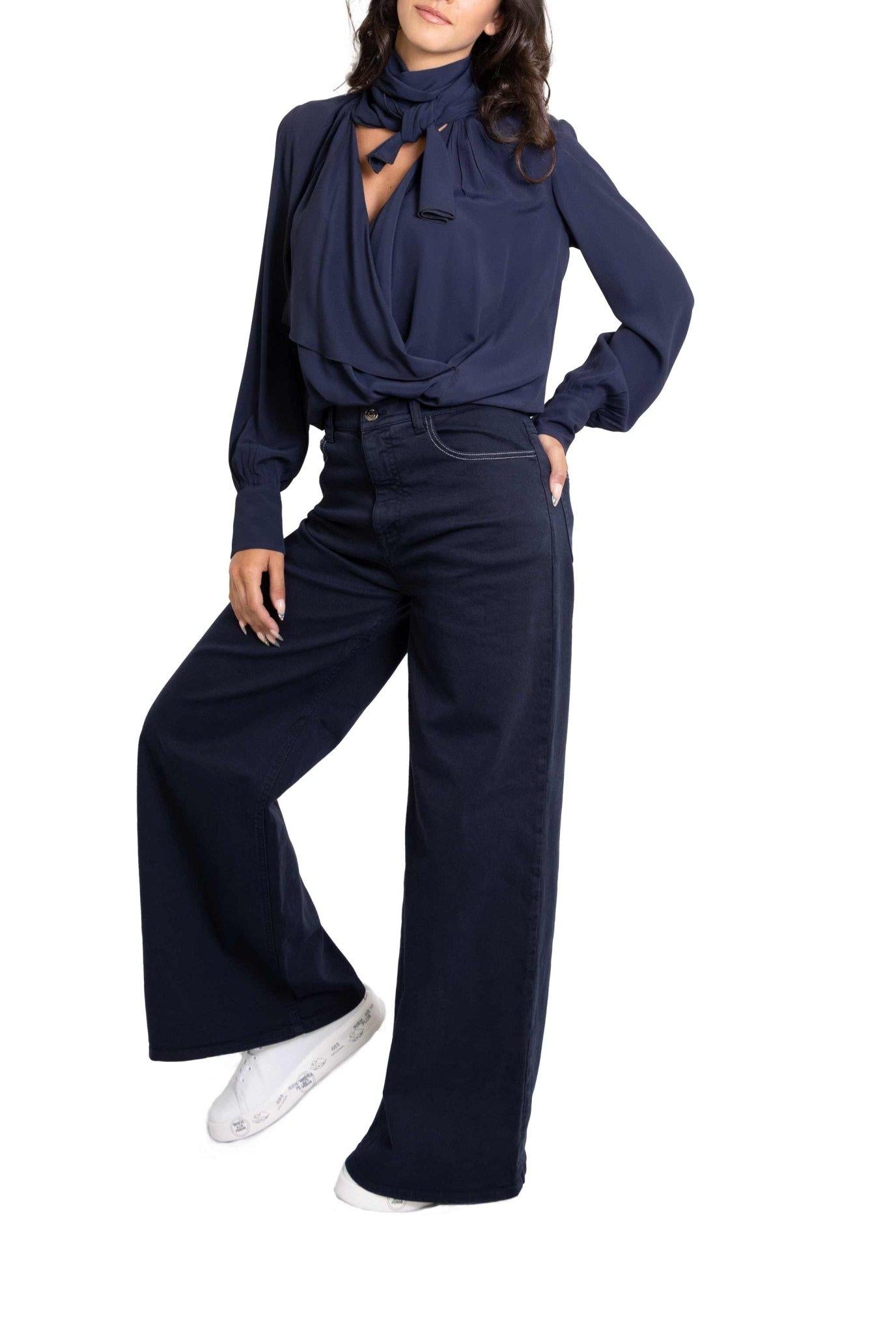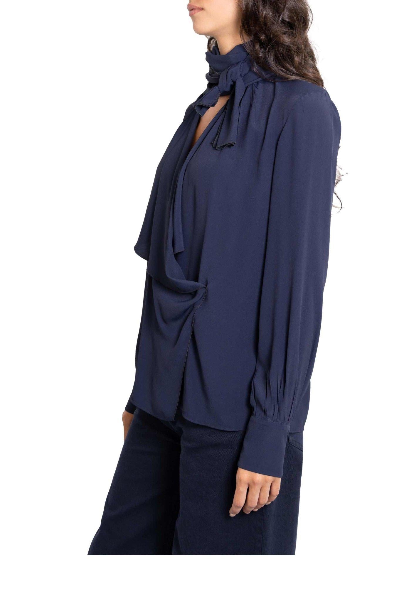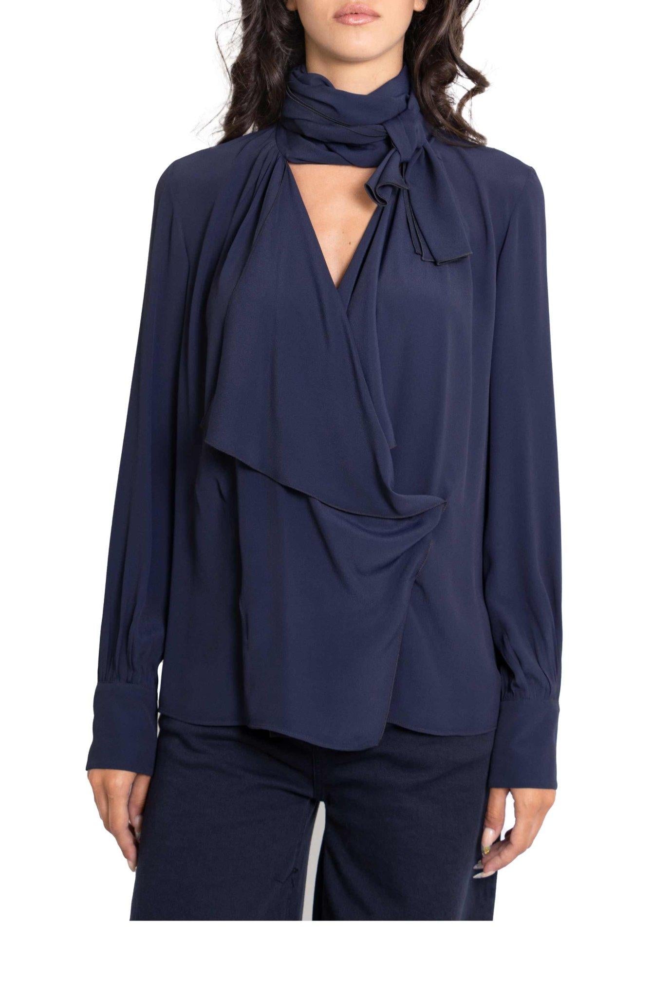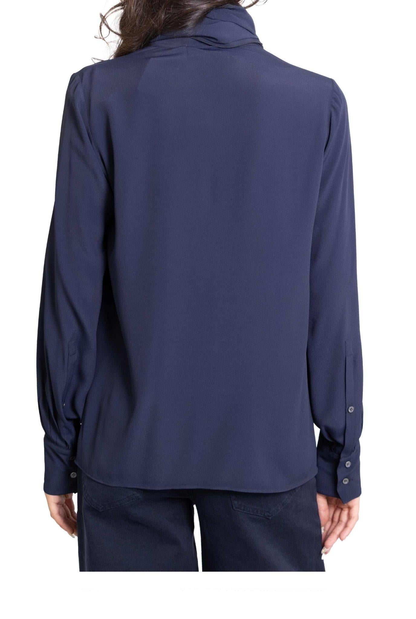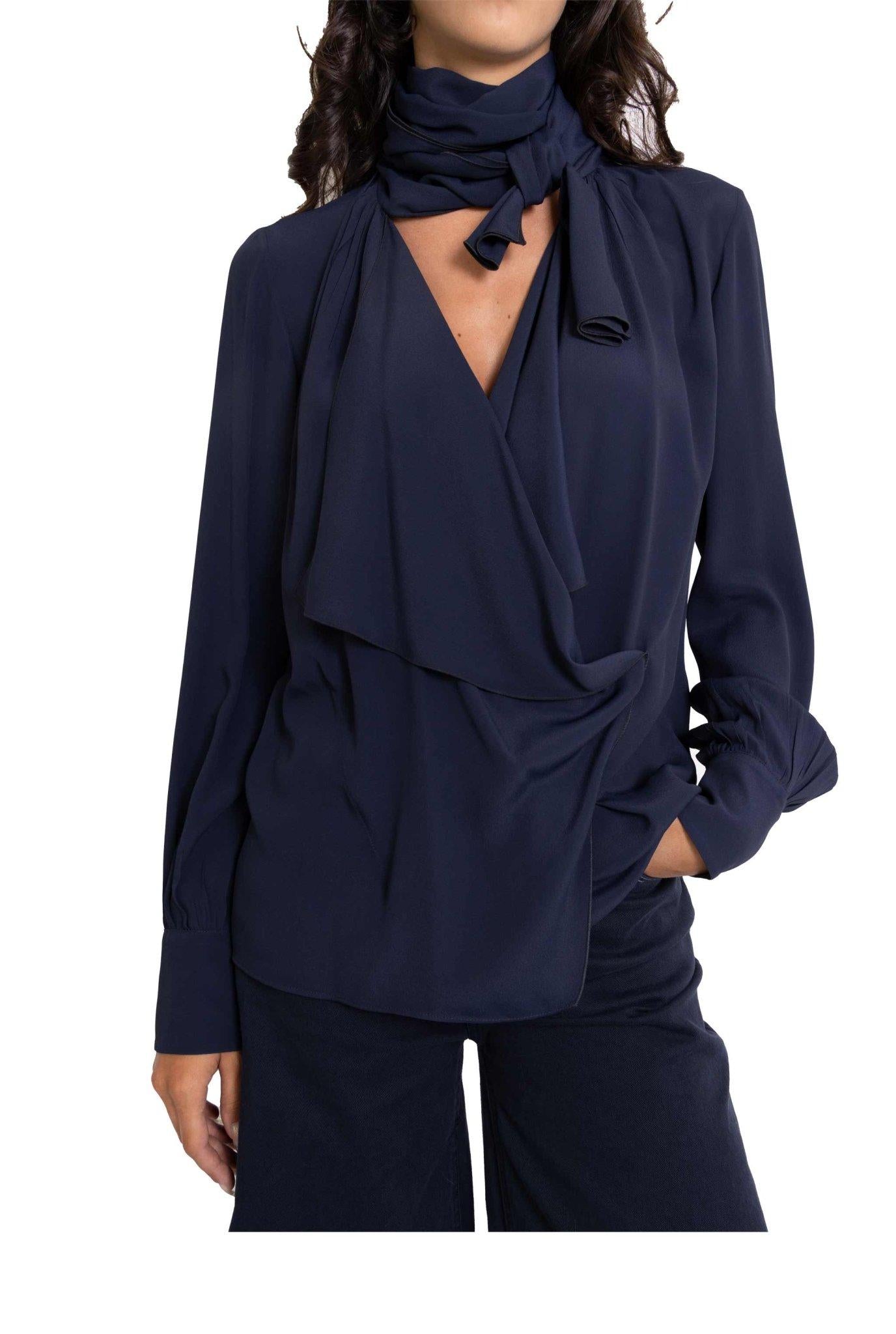 Modello scollo a V, sciarpa da annodare al collo, arricciature sul davanti. maniche lunghe a palloncino e polsini con bottoni. orlo curvo.