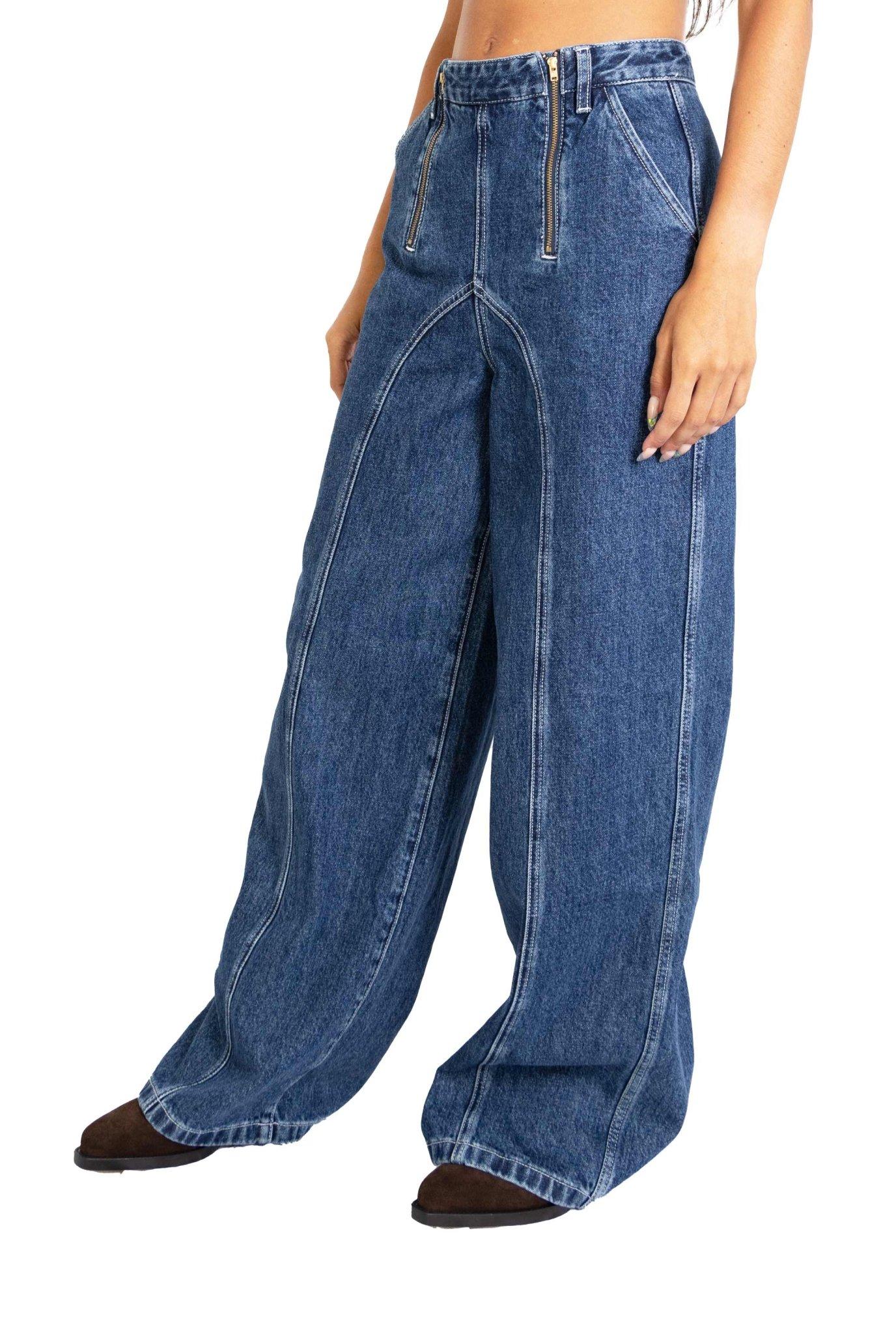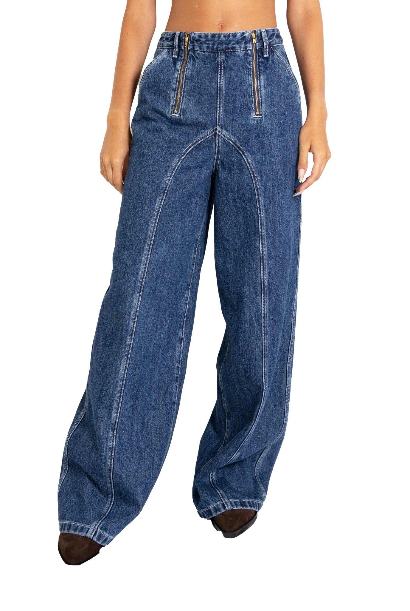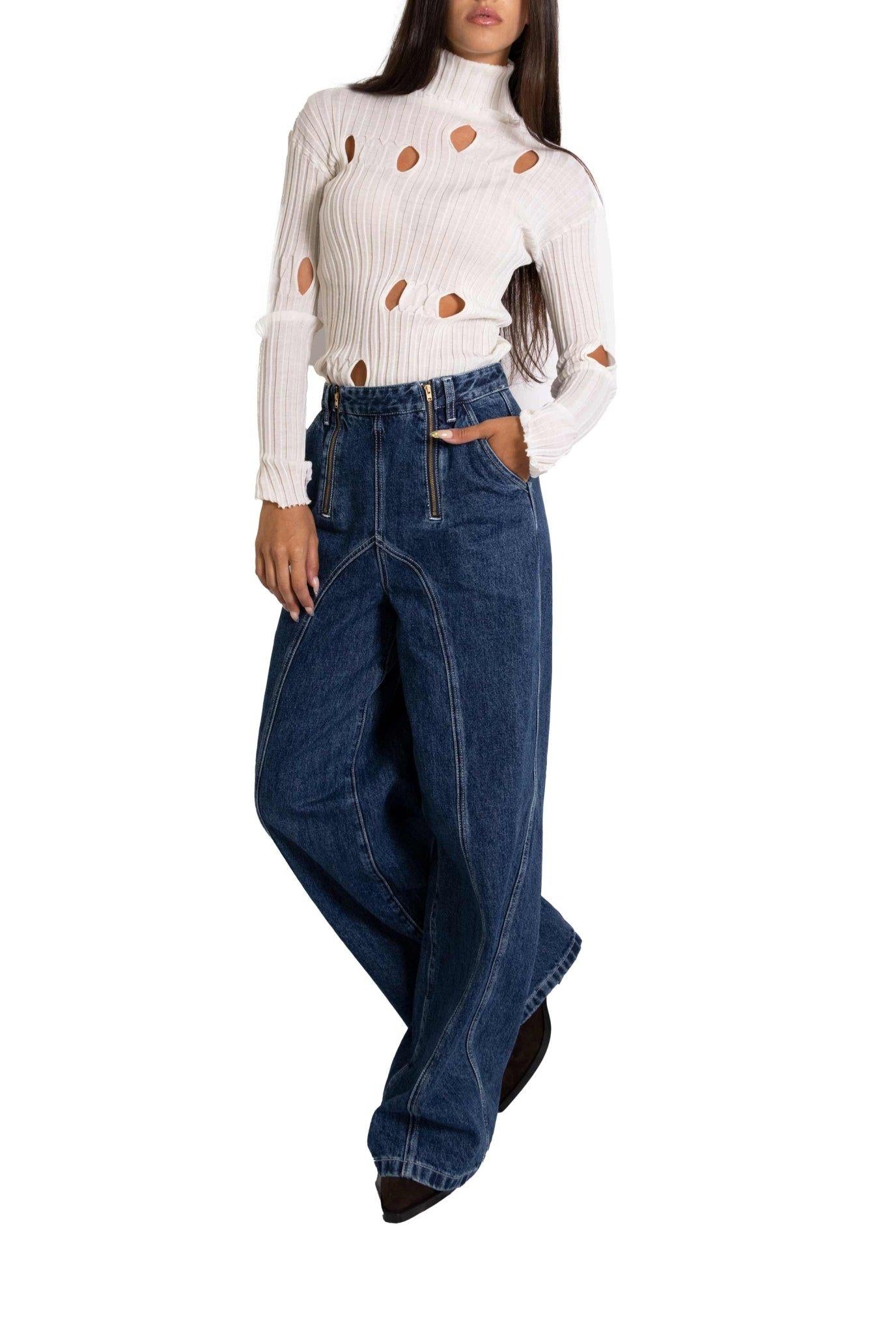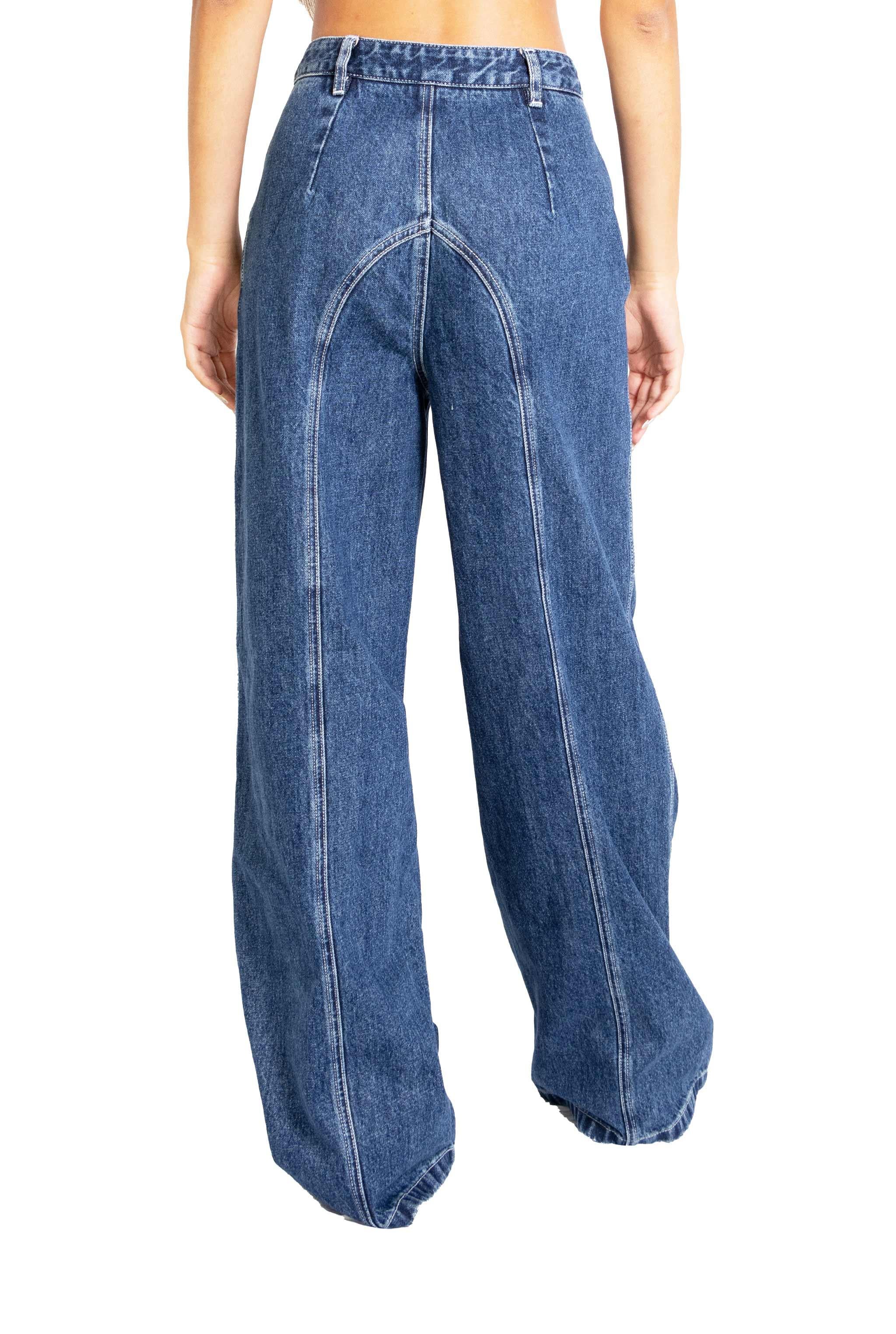Cuciture a contrasto,vita alta, chiusura con doppia zip, gamba dritta.